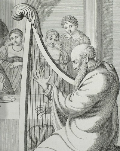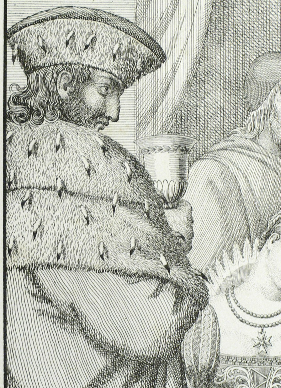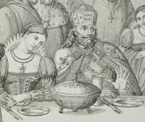 Dussler 2. – Aus: Nicolaus Vogt, Rheinische Bilder. Mit Vier Und Zwanzig Steinzeichnungen (Frankfurt am Main: Hermannsche Buchhandlung 1821). – Im Stein links unten signiert: ″Nicolaus Vogt inv: J. N. Peroux del.″ Unterhalb betitelt. – Lithografische Inkunabel! Gedruckt in der Susenbethschen Steindruckerei in Frankfurt am Main. - In einem Moment des freudigen Erschreckens erkennt der König in dem greisen Sänger den Geistlichen, dem er vor langer Zeit edelmütig sein Streitross schenkte, damit dieser einem Sterbenden das heilige Sakrament bringen konnte. – Im Rand diverse Knickspuren und Flecken, insgesamt guter Zustand.