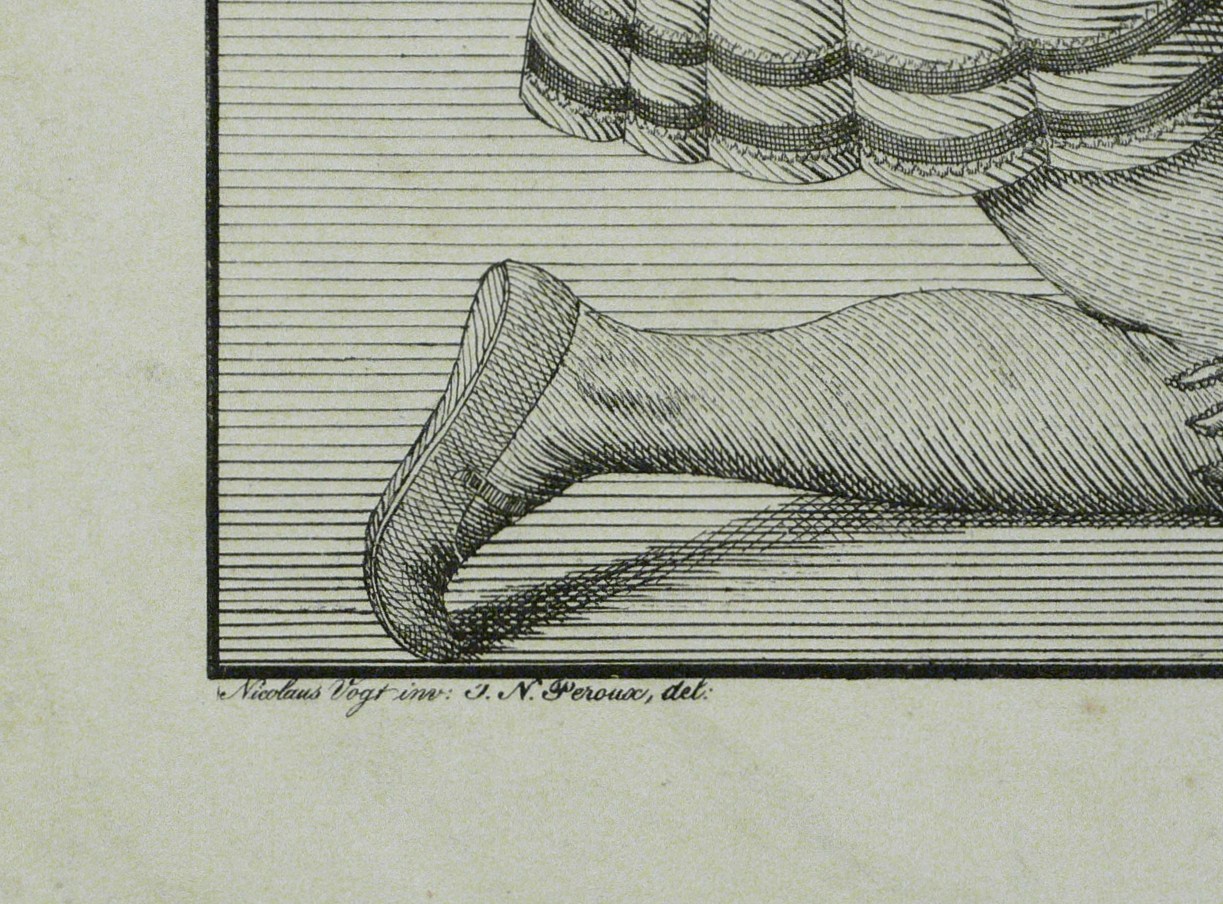 Joseph Nicolaus Peroux (1771 Ludwigsburg - 1849 Frankfurt am Main). Deutscher Miniaturmaler, Radierer und Lithograf der Romantik. Schüler des Nicolas Guibal an der Akademie und der Hohen Karlsschule in Stuttgart. Ab 1795 in Frankfurt am Main, ab 1800 in Hamburg tätig, wo er 1803 ein Porträt der Emma Hamilton und ein Selbstbildnis ausstellte. Danach eröffnete er in Lübeck eine Kunstschule und führte den jungen Friedrich Overbeck in die Zeichenkunst ein. Ging 1806 nach Frankfurt zurück. Seine Werke befinden sich heute im Frankfurter Staedel, in der Hamburger Kunsthalle und im Behnhaus in Lübeck.