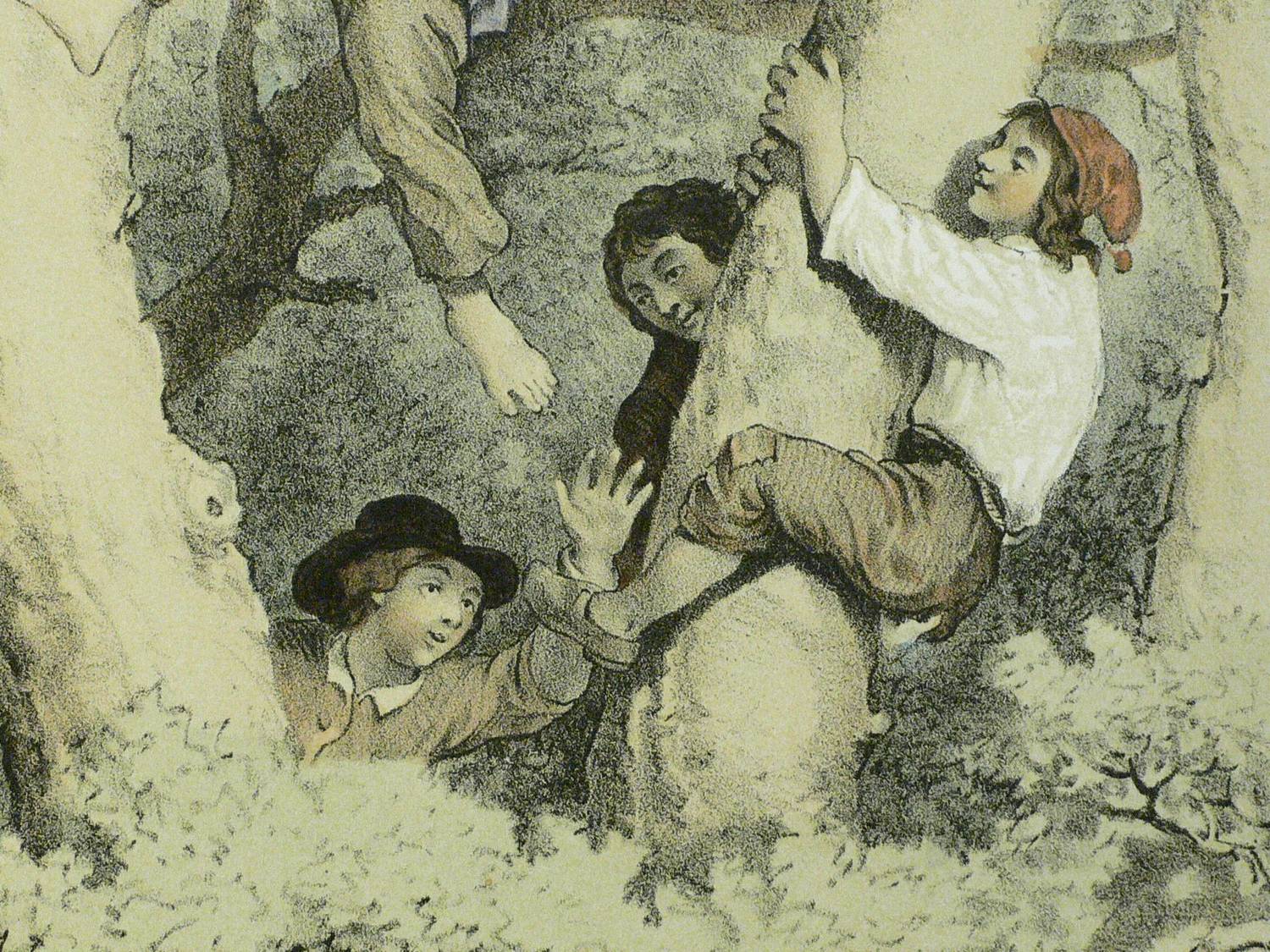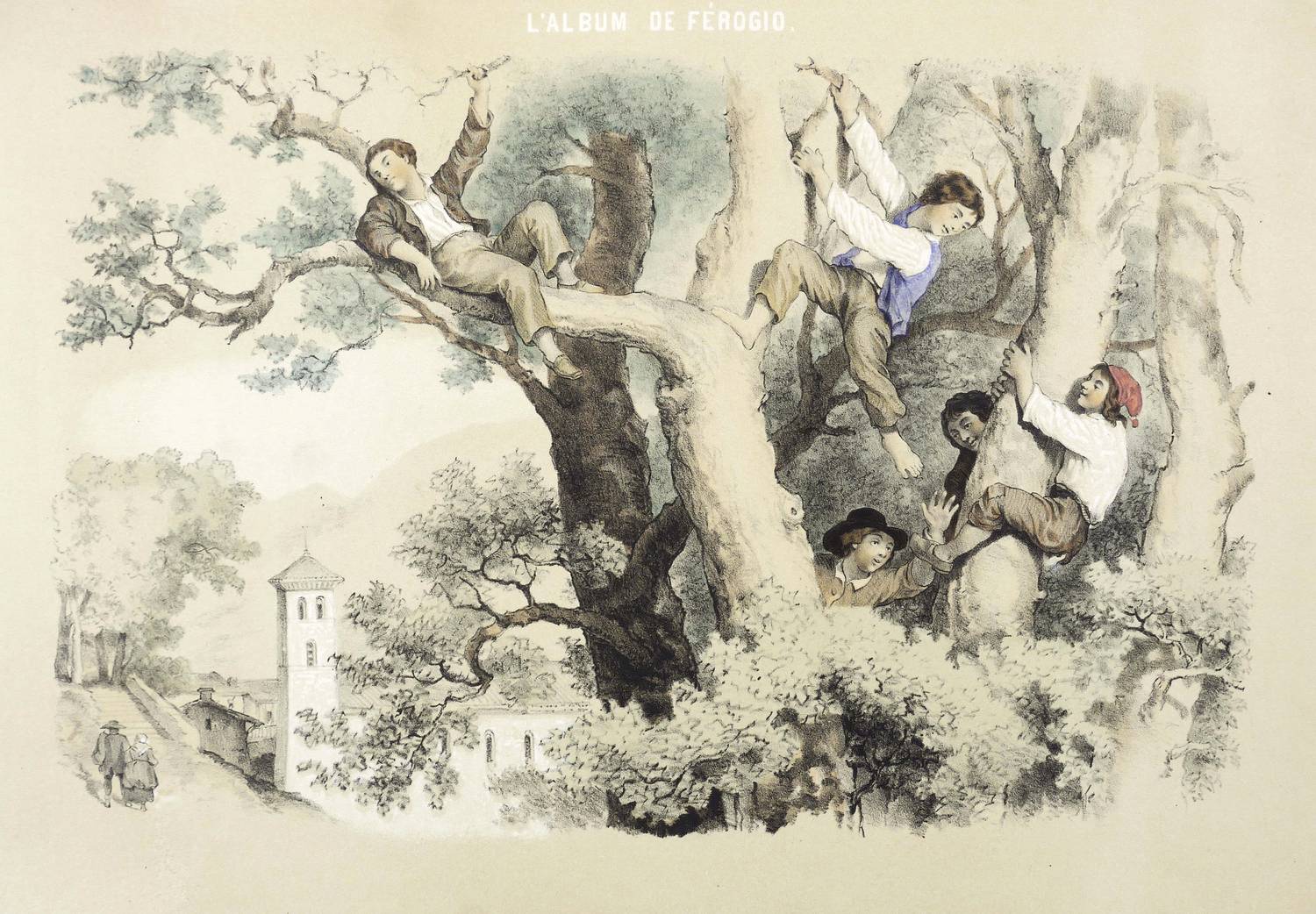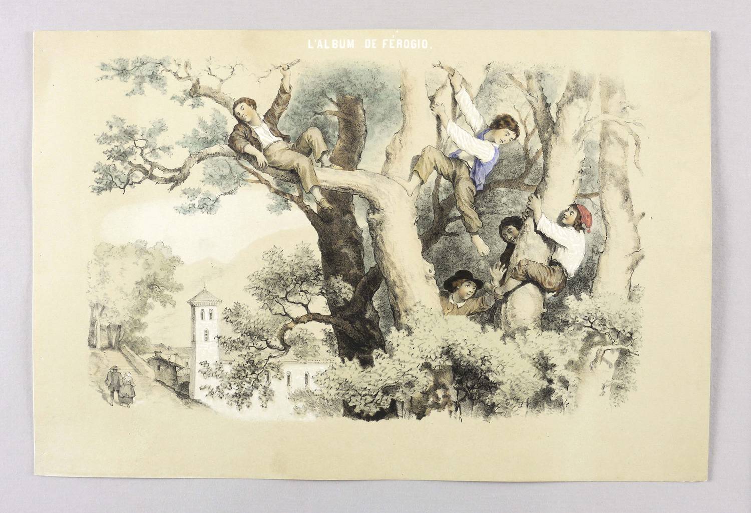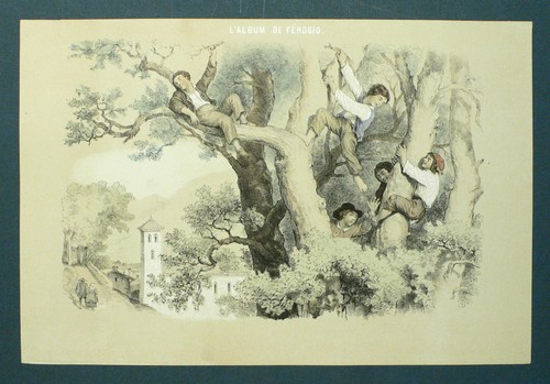 Aus: François-Fortuné-Antoine Férogio, L'album de Ferogio (Paris: Lemercier 1844). – Oben Serientitel: ″L'ALBUM DE FÉROGIO″. Sonst nicht näher bezeichnet. – Fünf italienische Jungen beim Klettern in einer Baumkrone auf einer Anhöhe oberhalb einer Kirche - wohl Norditalien. – Originalrandiges Exemplar, Papier altersbedingt leicht gegilbt. Insgesamt schönes Erscheinungsbild und guter Zustand.