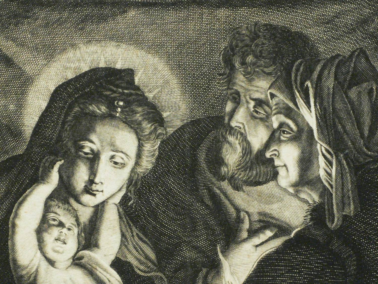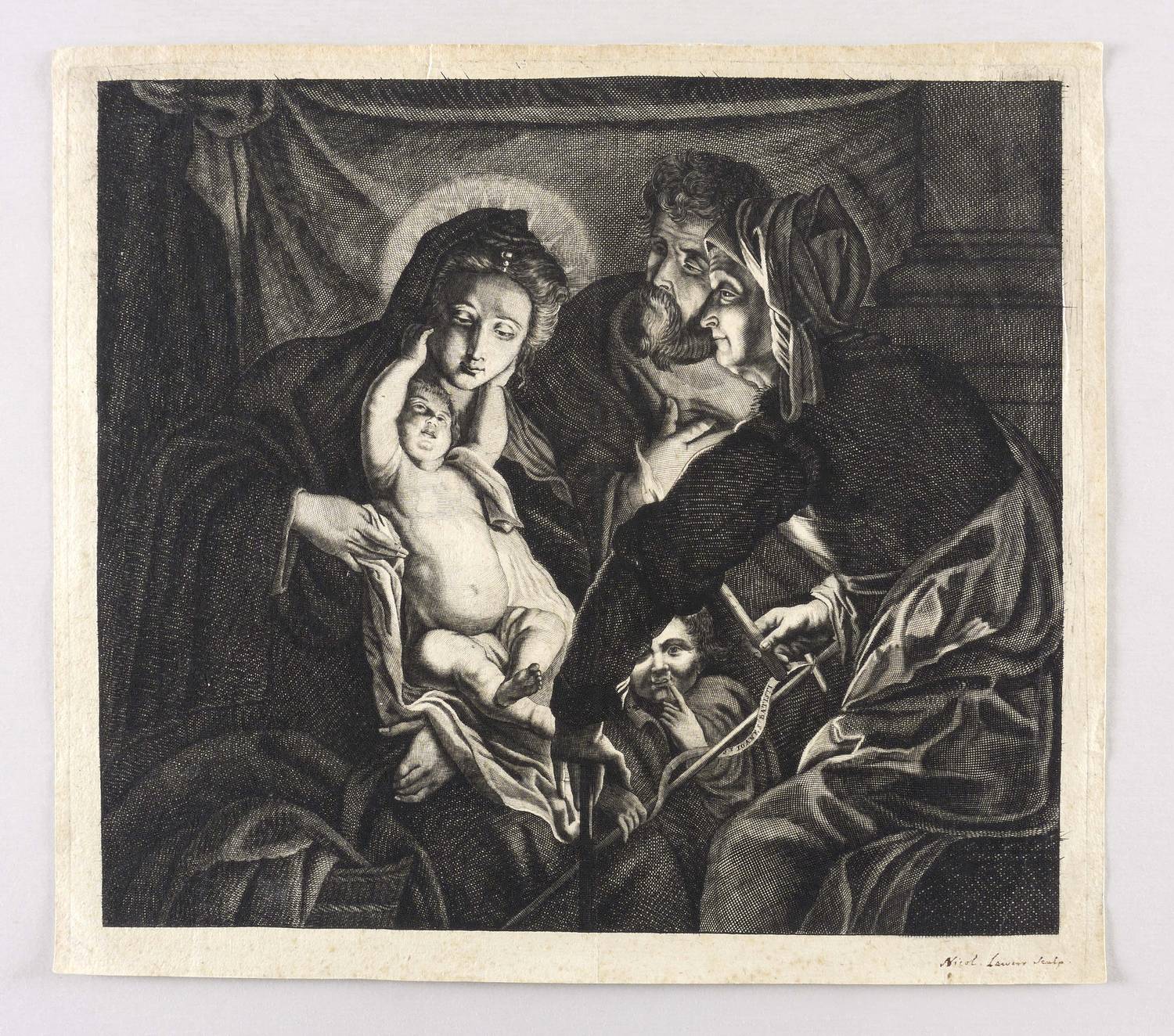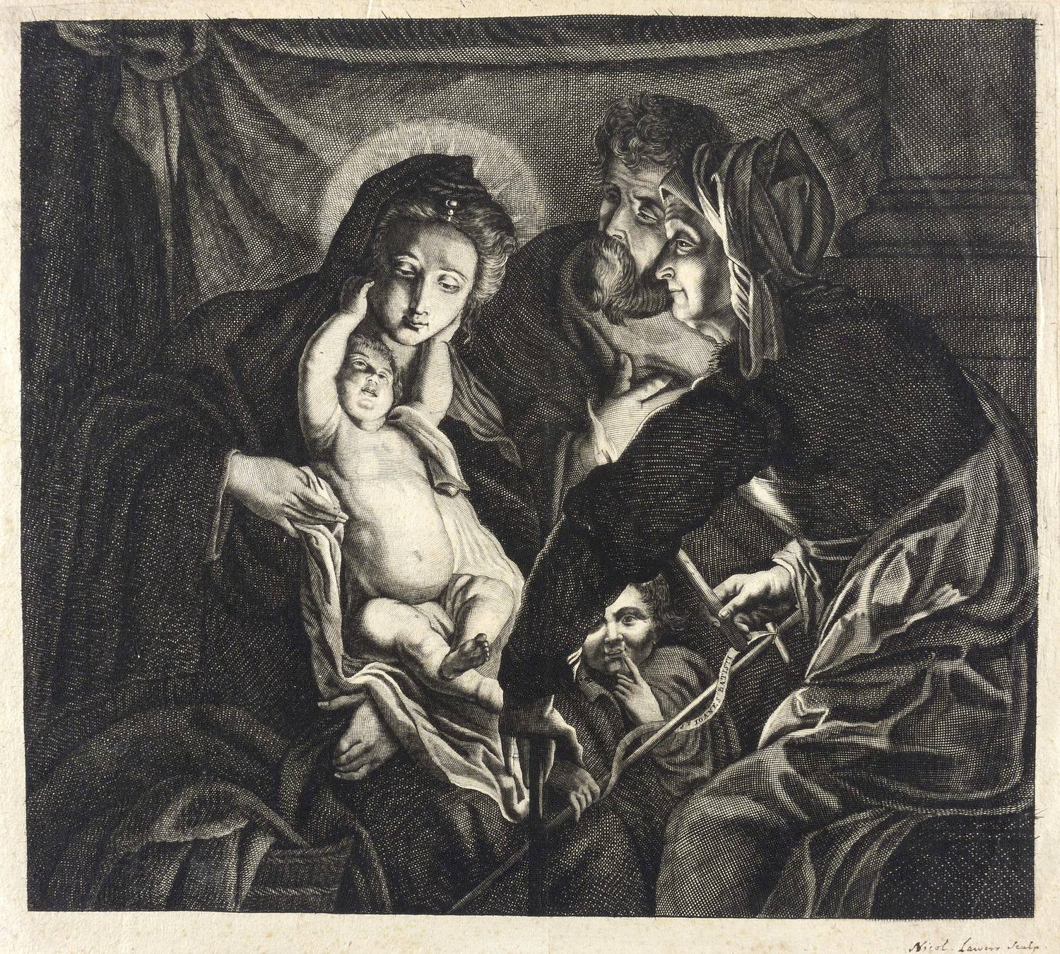 In der Darstellung am Kreuzstab des Johannesknaben Schriftband mit der Inschrift: ″ST. IOANES BATISTI″. Platte sonst ohne Schrift. Rechts unten von alter Hand in brauner Feder bezeichnet: ″Nicol. Lawers Sculp.″ – Interessantes Blatt mit der christologisch deutbaren Fokussierung auf das von der halb verdeckten Fackel ausgehende Binnenlicht. Die für Lauwers typische Ausarbeitung des Linienstichs und der Schraffuren bestätigt die Zuschreibung der handschriftlichen Notation. - Seltener Probedruck vor aller Schrift! – Papier altersbedingt geringfügig gebräunt, im rand etwas knickspurig, oben kleiner Einriss (10 mm) bis an den Rand der Darstellung. Insgesamt mäßig guter Zustand.