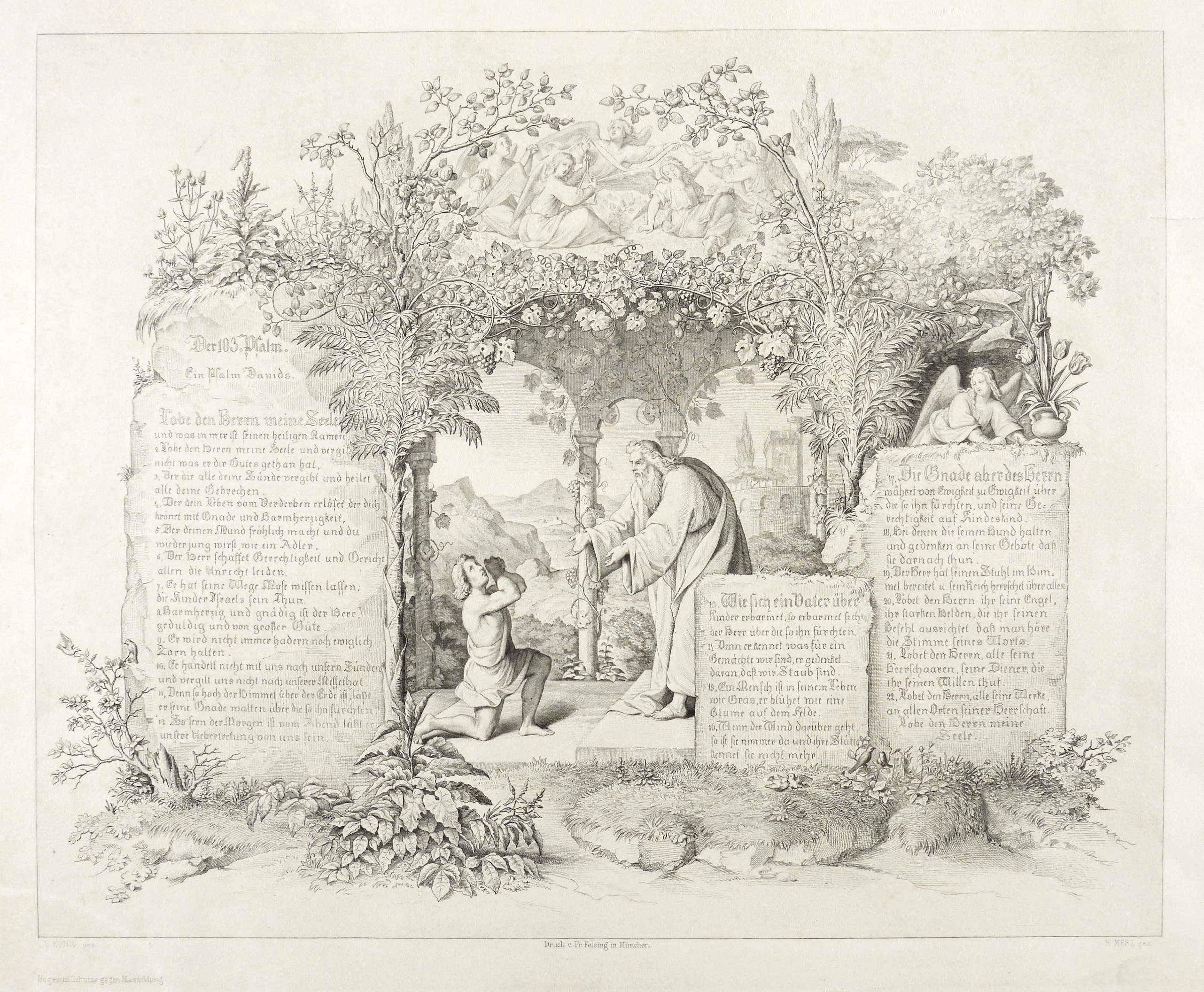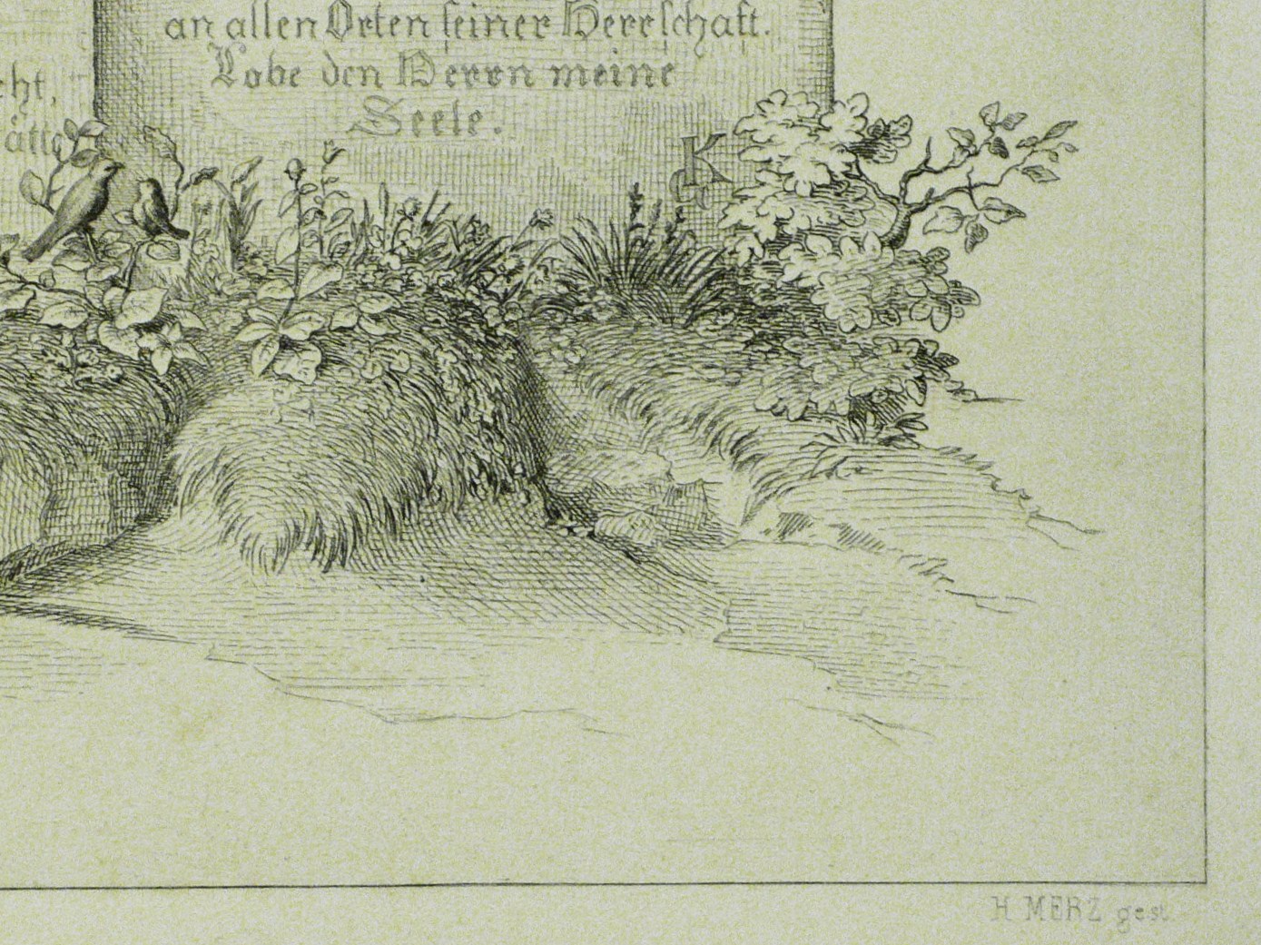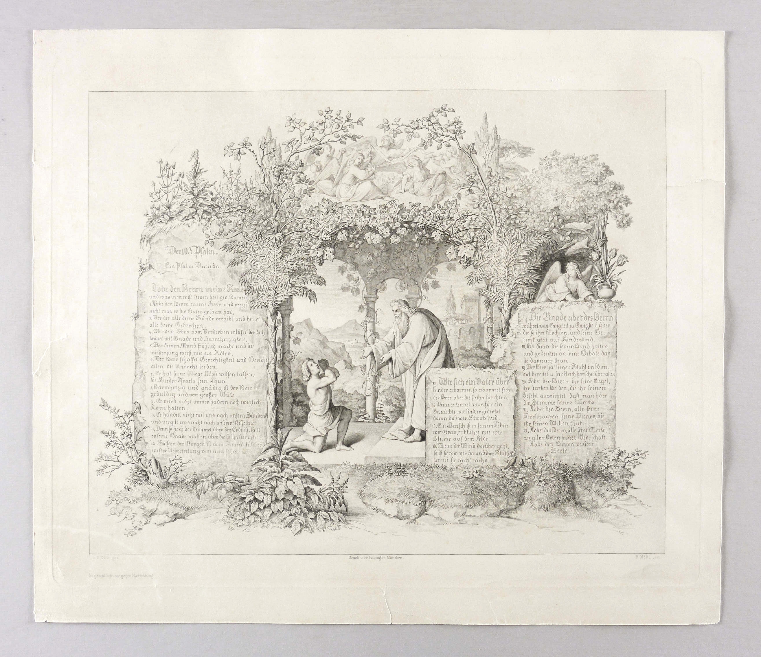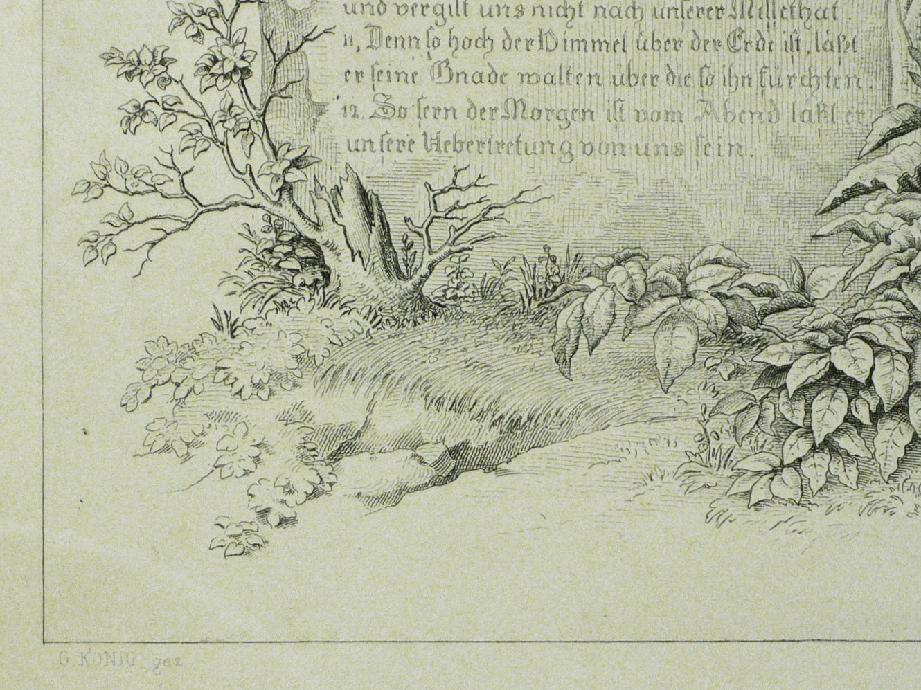 In der Platte rechts unter der Darstellung signiert ″H. MERZ gest.″ Druckeradresse ″Fr. Felsing in München″. Die mittig angeordnete Szene flankierend drei Schrifttafeln mit dem Psalmtext, beginnend: ″Der 103. Psalm. / Ein Psalm Davids. // Lobe den Herrn meine Seele / und was in mir ist seinen heiligen Namen (...)″. – Rand etwas berieben und knickspurig sowie mit diversen, teilweise hinterlegten Einrissen. Insgesamt eher mäßig guter Zustand.