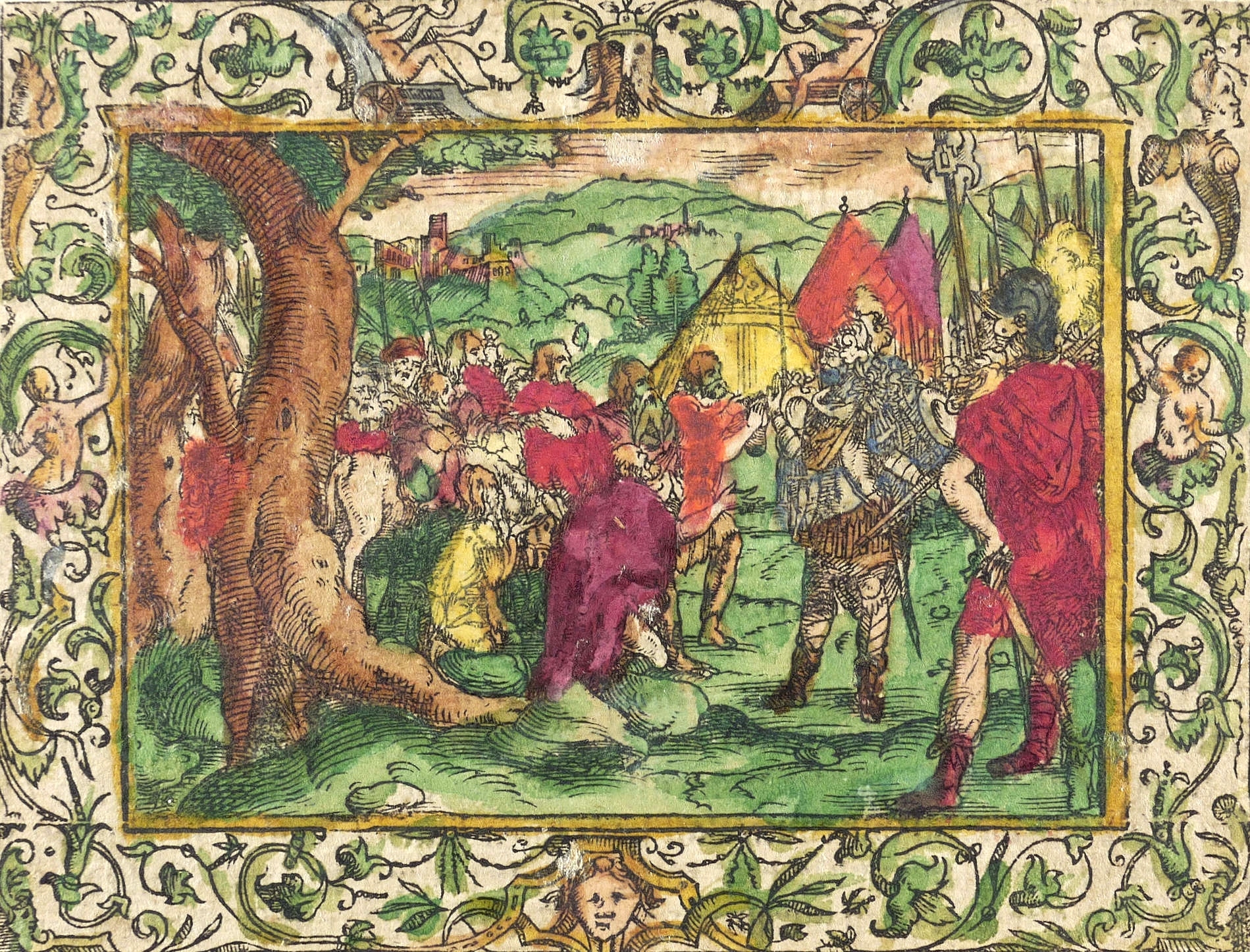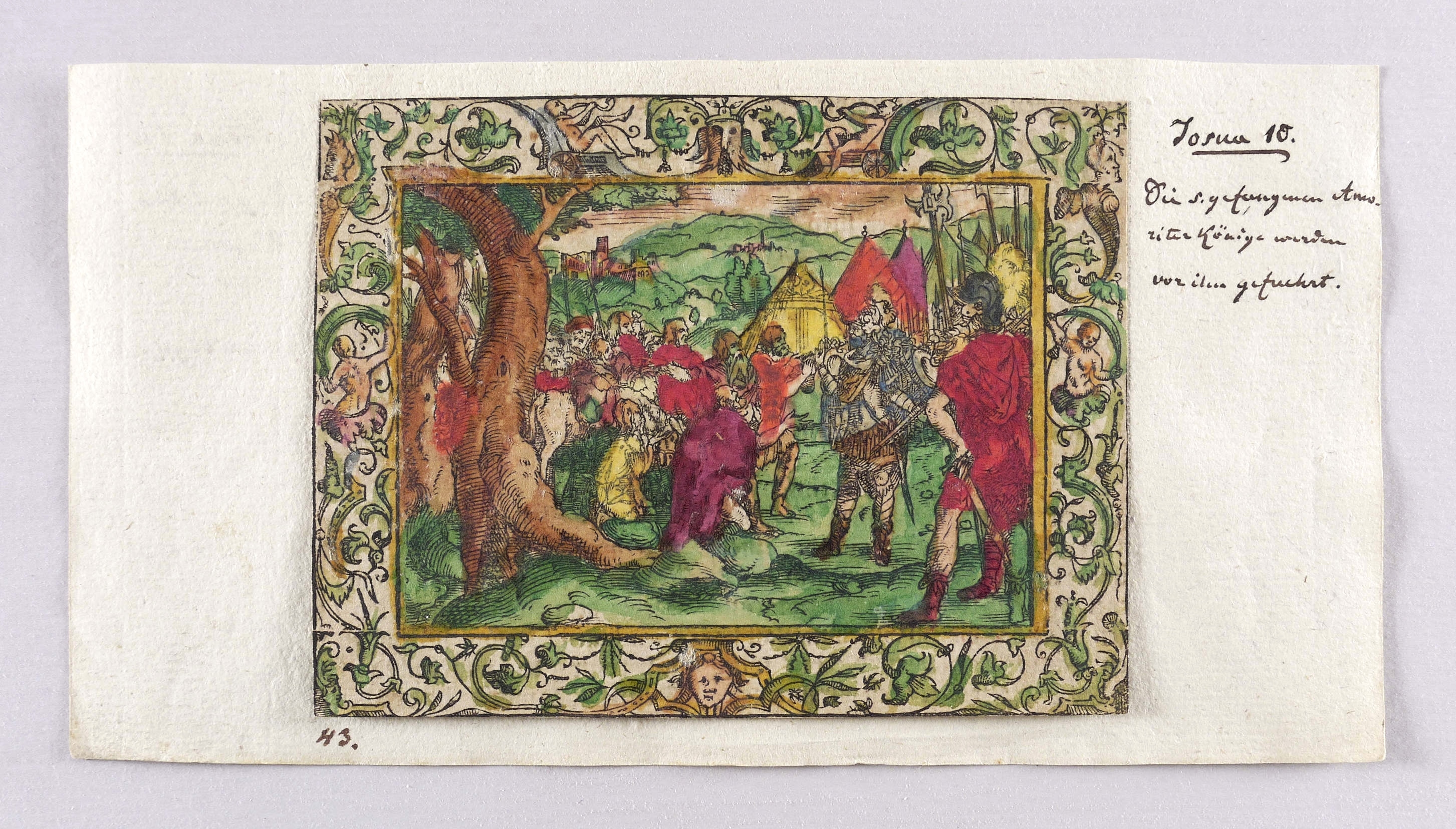 Auf dem Trägerbütten alt in brauner Feder bezeichnet: ″Josua 15. / Die 5. gefangenen Amoriter Könige werden vor ihn gefuehrt.″ Verso typografischer Rückentext aus der Biblia deutsch von Martin Luther. – Zeittypische Bordüre mit Grotesken und Rollwerk. - Aus einer deutschen Ausgabe der Lutherbibel der 2. Hälfte des 16. Jahrhunderts. Sämtliche Holzschnitte wohl von einer Hand, oft Bilderfindungen des Virgil Solis folgend, bisweilen mit Monogramm MT und Messerchen signiert. – Bis auf den Rand der Schmuckrahmung beschnitten. Papier altersbedingt etwas gebräunt. Alt auf Büttenpapier des 18. Jh. gesetzt. Insgesamt gut erhalten.