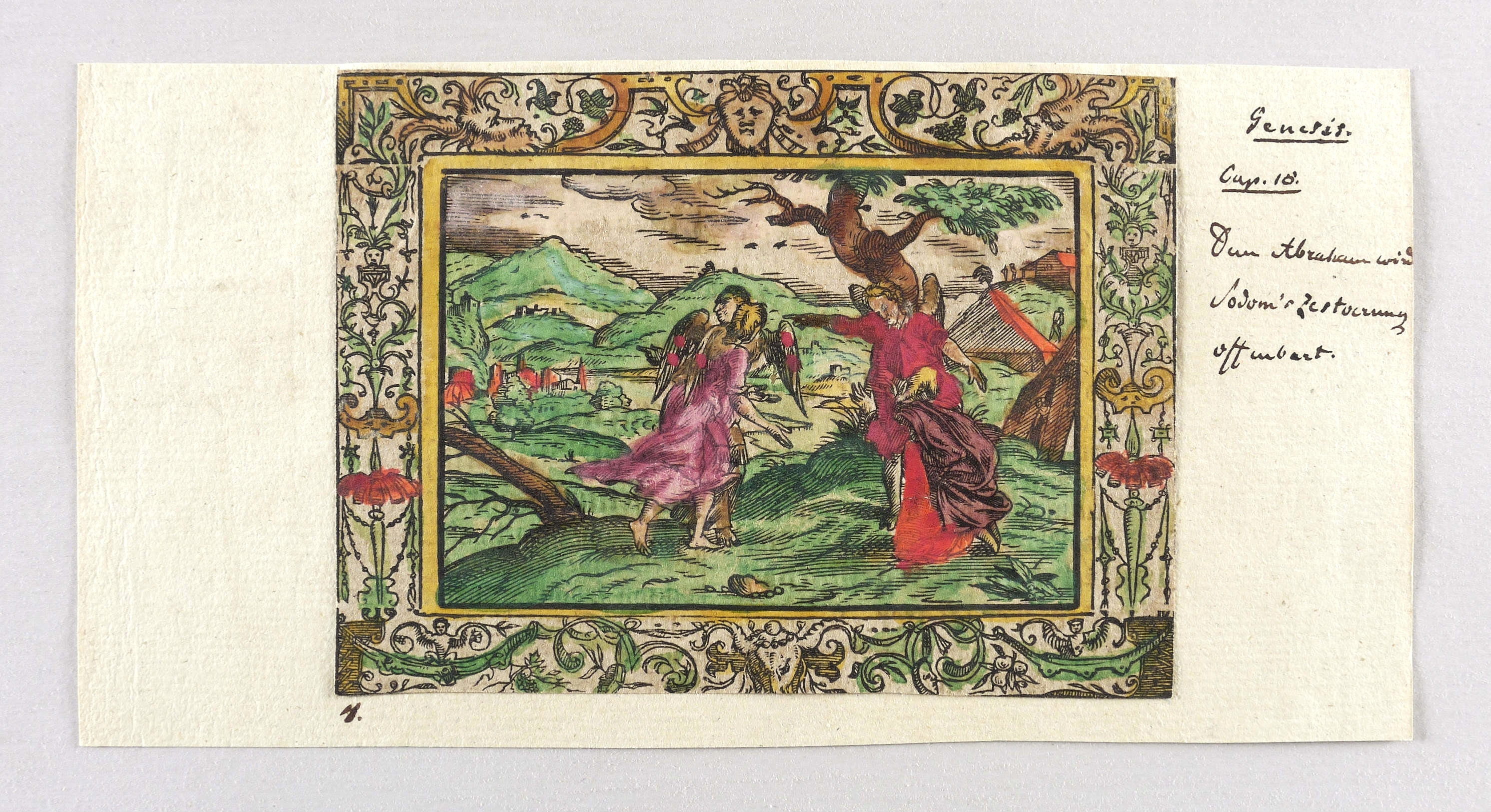 Auf dem Trägerbütten alt in brauner Feder bezeichnet mit Bibelstelle und Bildgegenstand. Verso typografischer Rückentext aus der Biblia deutsch von Martin Luther. – Zeittypische Bordüre mit Grotesken und Rollwerk. - Aus einer deutschen Ausgabe der Lutherbibel der 2. Hälfte des 16. Jahrhunderts. Sämtliche Holzschnitte wohl von einer Hand, oft Bilderfindungen des Virgil Solis folgend, bisweilen mit Monogramm MT und Messerchen signiert. – Bis auf den Rand der Schmuckrahmung beschnitten. Papier altersbedingt etwas gebräunt. Alt auf Büttenpapier des 18. Jh. gesetzt. Insgesamt gut erhalten.