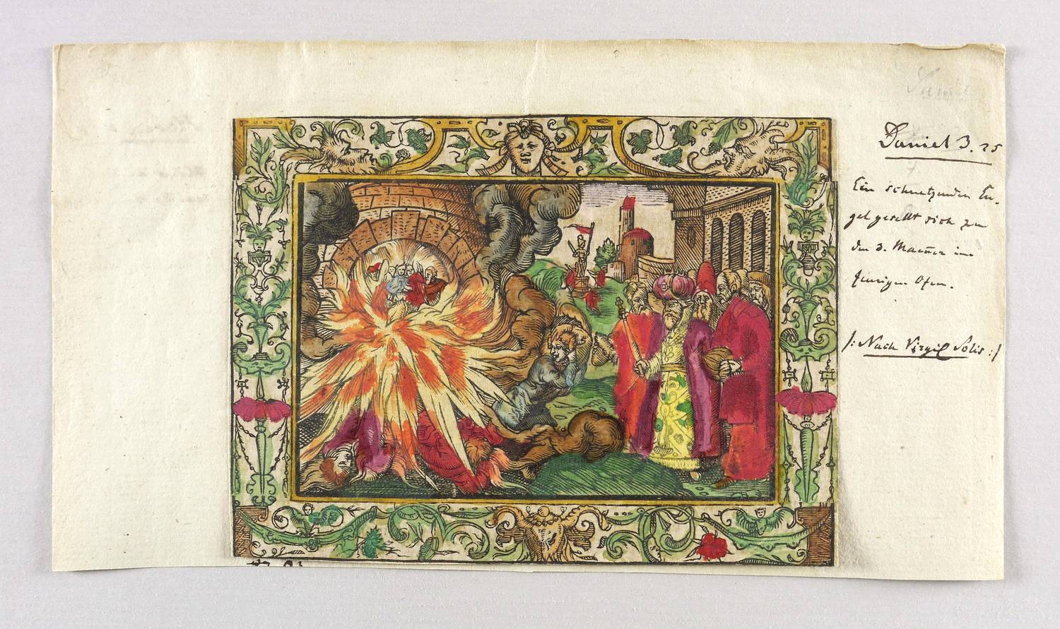 Auf dem Trägerbütten alt in brauner Feder bezeichnet: ″Daniel 3.25 / Ein schuetzender ENgel gesellt sich zu den 3. Männer[n] im feurigen Ofen. / Nach Virgil Solis.″ Verso typografischer Rückentext aus der Biblia deutsch von Martin Luther. – Zeittypische Bordüre mit Grotesken und Rollwerk. - Aus einer deutschen Ausgabe der Lutherbibel der 2. Hälfte des 16. Jahrhunderts. Sämtliche Holzschnitte wohl von einer Hand, oft Bilderfindungen des Virgil Solis folgend, bisweilen mit Monogramm MT und Messerchen signiert. - König Nebukadnezar ließ 3 Männer in einen brennenden Ofen stecken, da sie sich weigerten, ein Götzenbild anzubeten. Ein Engel bewahrte sie vor dem Feuertod und bewies damit die größere Macht ihres Gottes. – Bis auf den Rand der Schmuckrahmung beschnitten. Papier altersbedingt etwas gebräunt. Alt auf Büttenpapier des 18. Jh. gesetzt. Insgesamt gut erhalten.