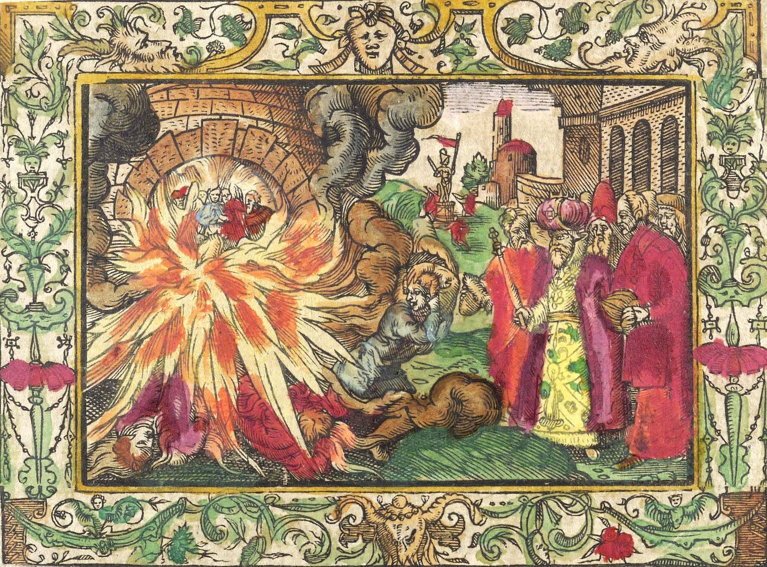 1560-1580. Holzschnitt, alt koloriert. – Historische Buchillustration, von Monogrammist MT. – 7,7 x 11,5 cm (Darstellung / ohne Schmuckrahmen), 10,9 x 14,7 cm (Blatt), 13 x 23 cm (Trägerblatt).