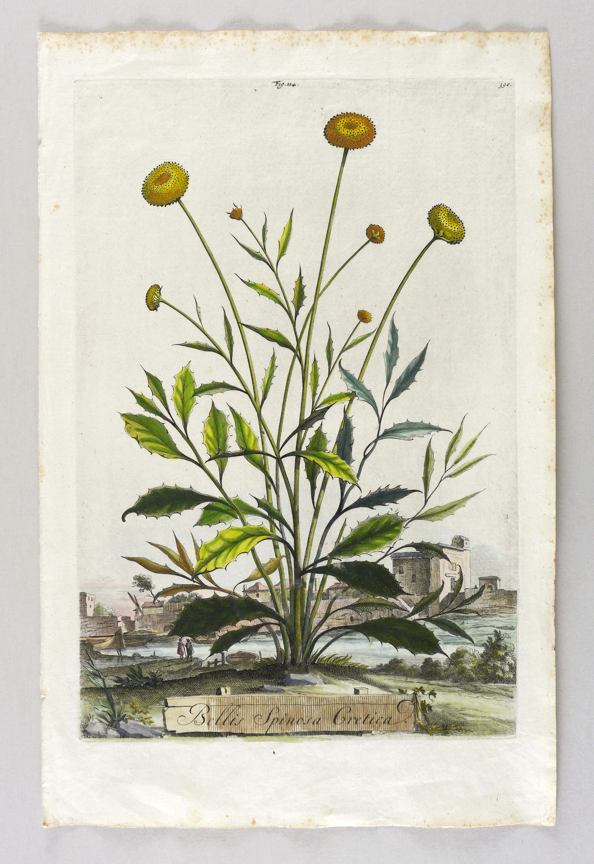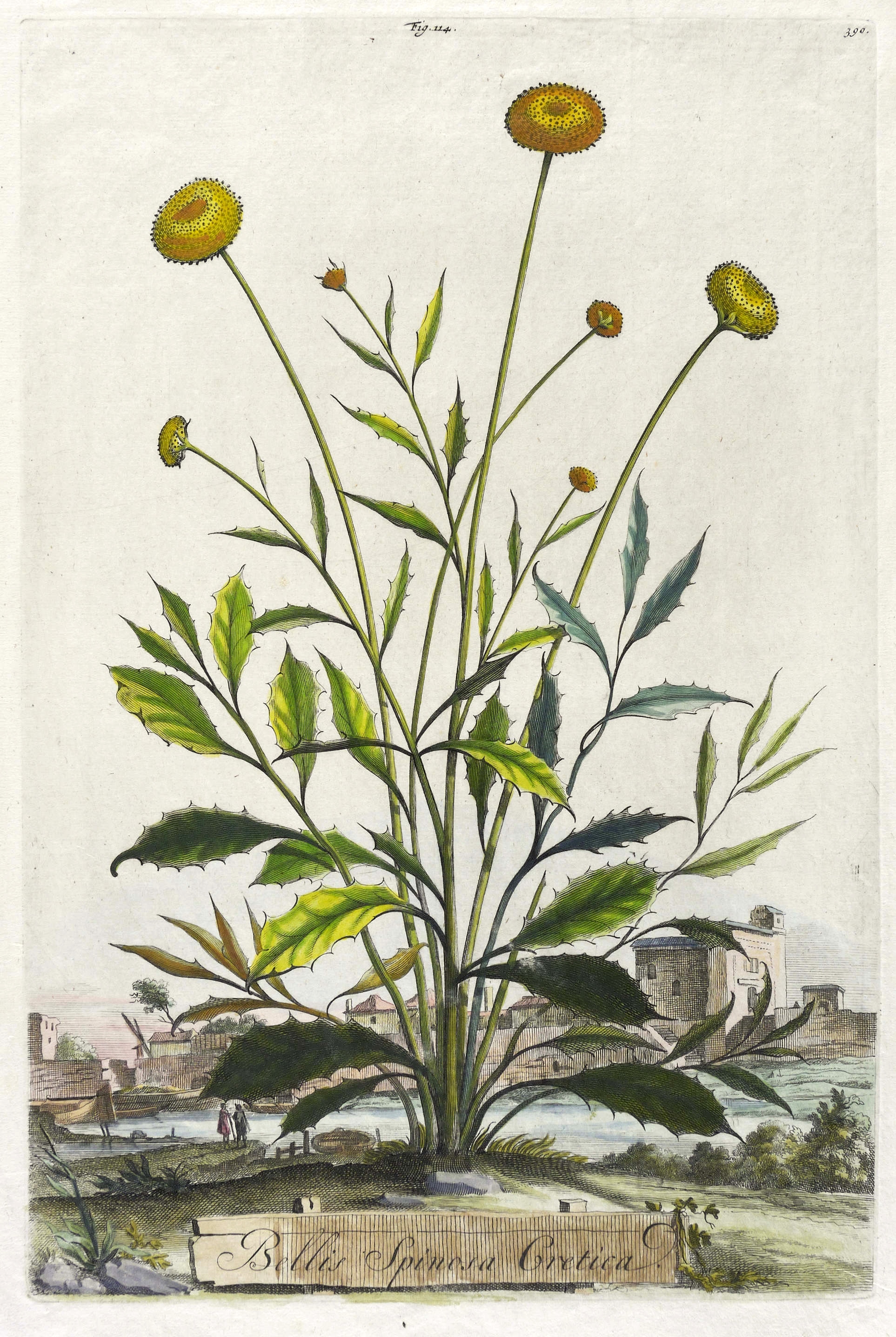 Korbblütler. – Plagius flosculosus. – Munting. – „Bellis Spinosa Cretica”.