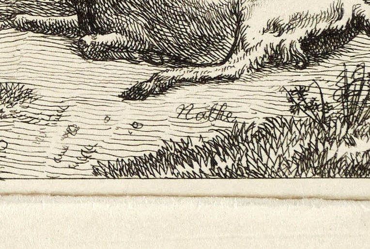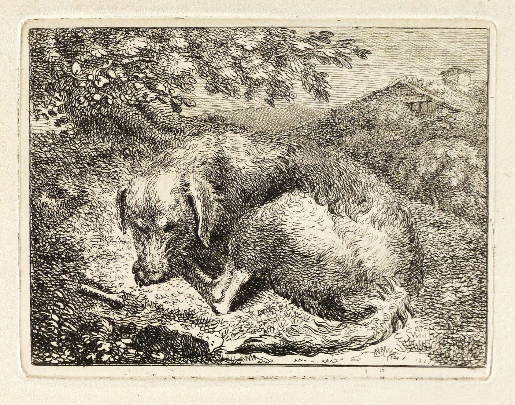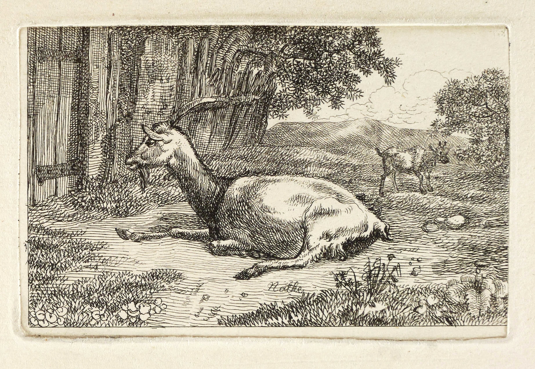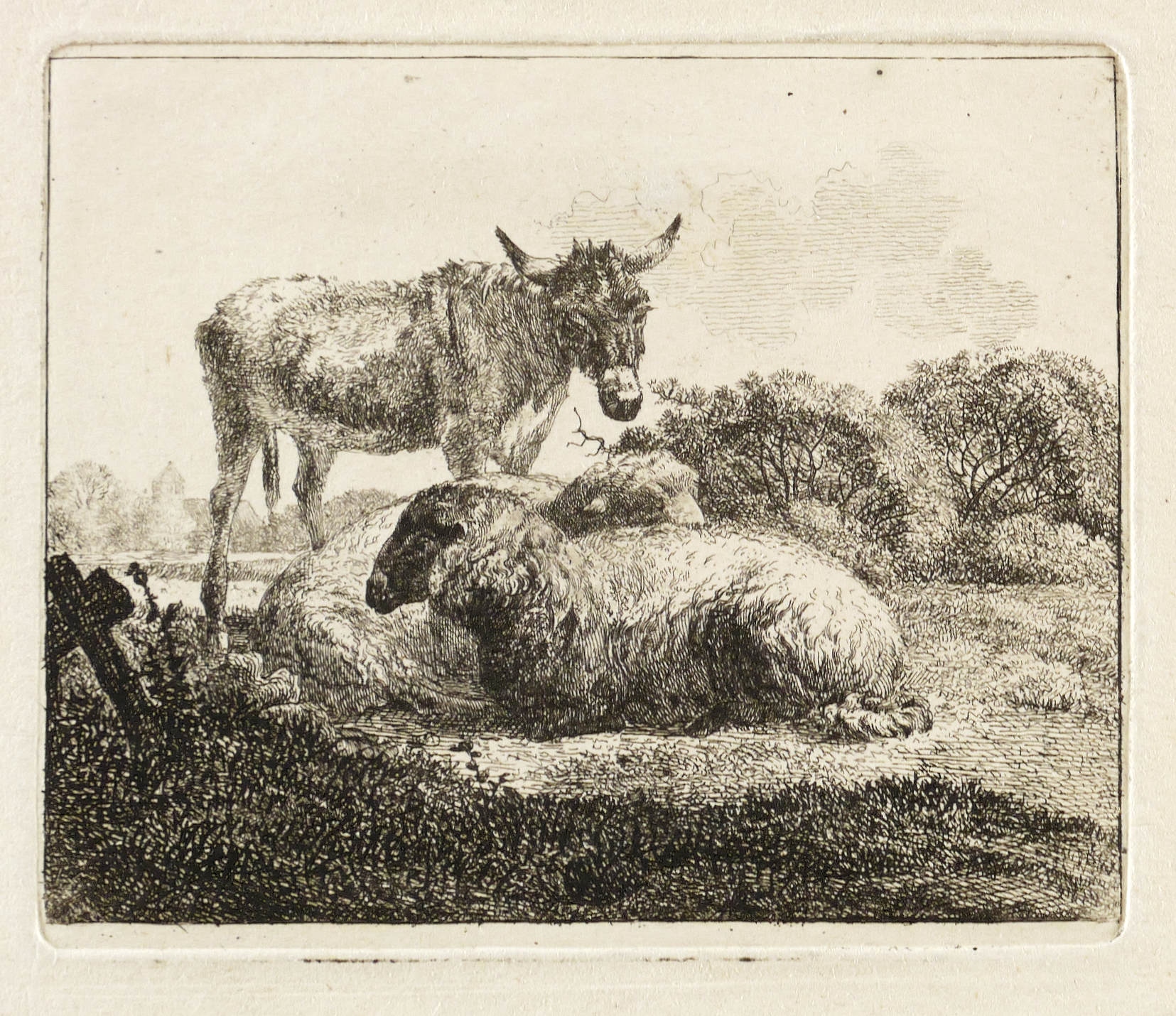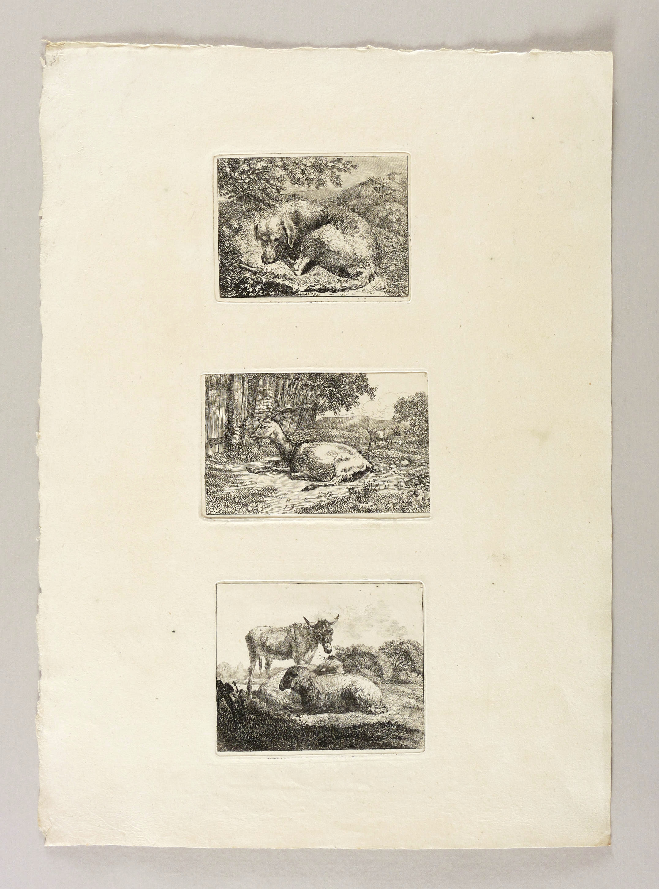 Nathe, Christoph. – „Schlafender Hund. Ruhende Ziege vor einem Zaun. Zwei Schafe und ein Esel”.