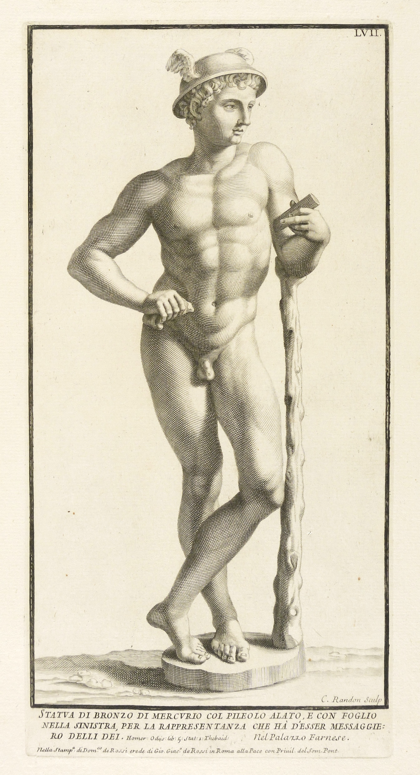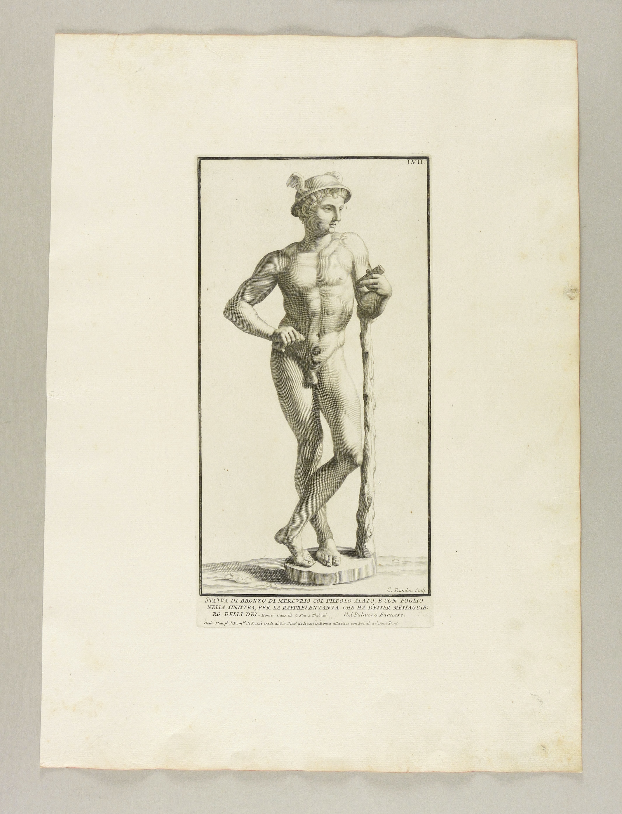 Randon, Claude. – Skulptur des Merkur. – „Statua di bronzo di Mercurio col pileolo alato, e con foglio nella ainistra, per la rappresentanza che hà d'esser messaggiero delli dei”.