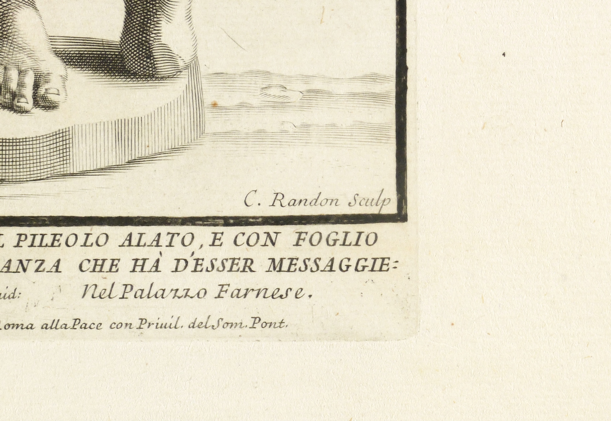 Aus: Paolo Alessandro Maffei, Raccolta di statue antiche e moderne (Rom: Stamperia alla Pace 1704). – Rechts unten signiert: „C. Randon Sculp“. Unterhalb der Darstellung betitelt. – Blatt teils schwach braun- und fingerfleckig. Sonst guter Zustand.