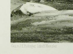 Johann Elias Ridinger (1698 Ulm - 1767 Augsburg). Deutscher Tiermaler, Radierer und Verleger. Ridinger wurde von Christoph Rasch in Ulm und Johann Falk in Augsburg unterrichtet und bildete sich dann in Regensburg weiter, wo ihn seine Vorliebe für die Jagd zum Studium des Wildes hinführte. Er gründete später in Augsburg eine Kunsthandlung und starb hier als Direktor der Kunstakademie. Seine radierten Blätter, die sich auf etwa 1600 Stück belaufen, stellen die Tiere in charakteristischen Lebensmomenten und landschaftlichen Umgebungen dar. Weniger gelang ihm die Darstellung der menschlichen Gestalt und zahmer Tiere, wie beispielsweise von Pferden. Alte Abdrücke der Blätter sind selten. Sehr zahlreich sind seine mit Genauigkeit und Geschmack ausgeführten Zeichnungen.