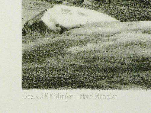 Aus: Hermann Menzler, Jagd-Album. Nach den Originalen des Joh. Elias Ridinger … sowie des A. Rohlfs, Hof-Jagdmaler des Prinzen Friedrich Karl von Preußen gezeichnet (Berlin: Ludwig Julius Heymann 1863-1865). – Links unten bezeichnet "Gez. v. J. E. Ridinger, lith. v. H. Menzler". Verlagsadresse Ludwig Julius Heymann in Berlin. – Druck von A. Renaud. – Sehr schönes, wohlerhaltenes Exemplar.