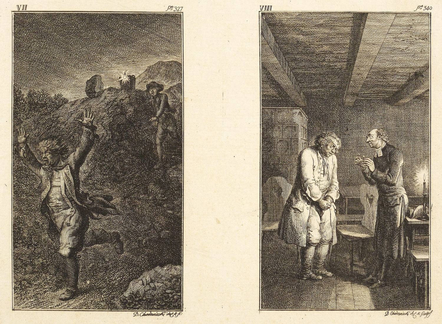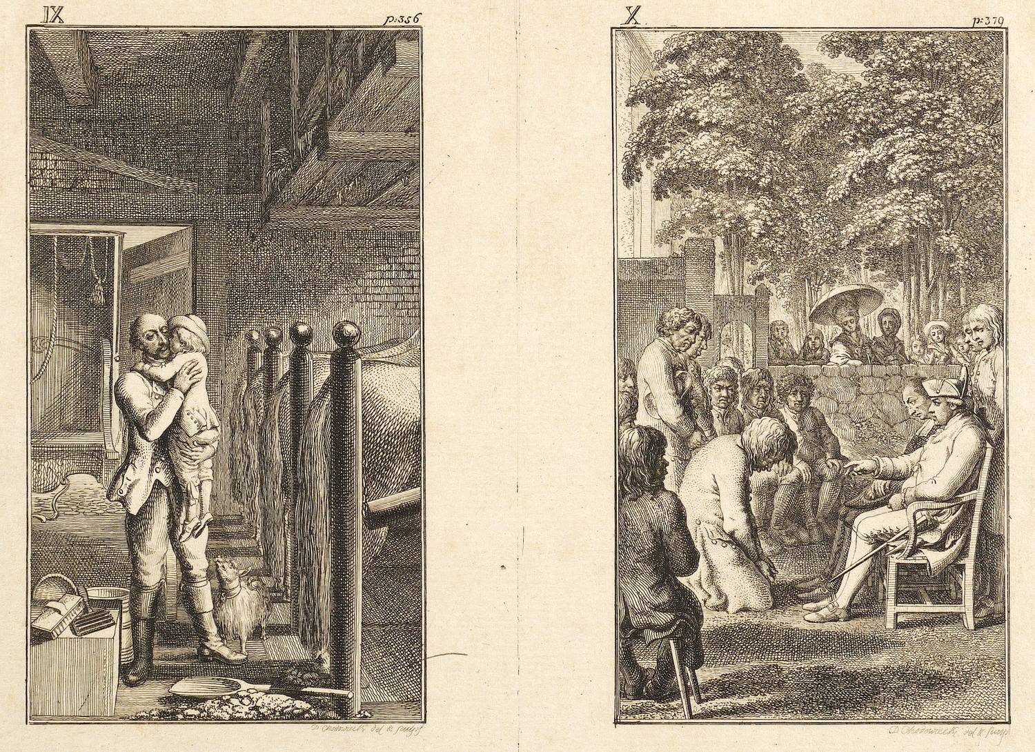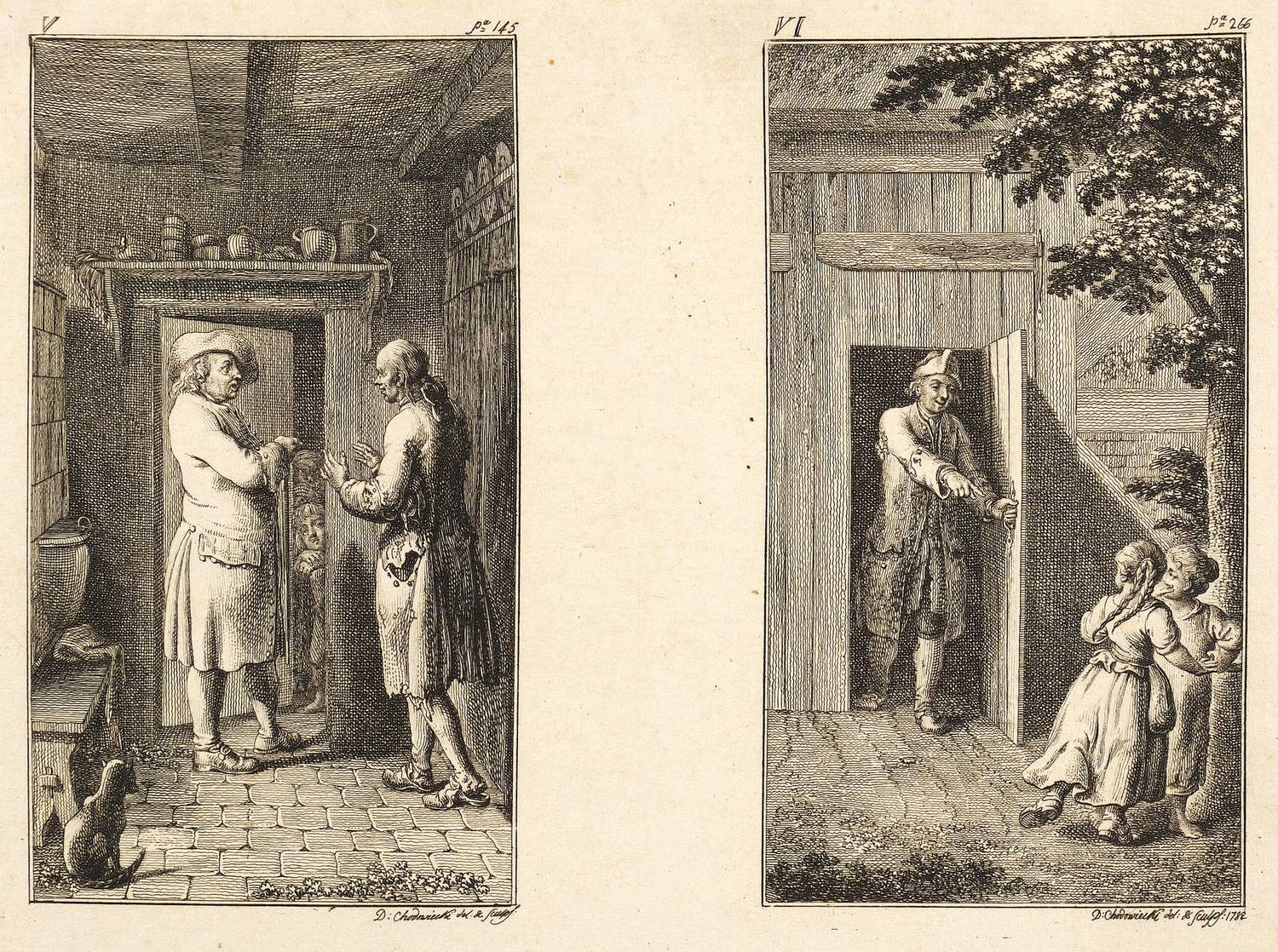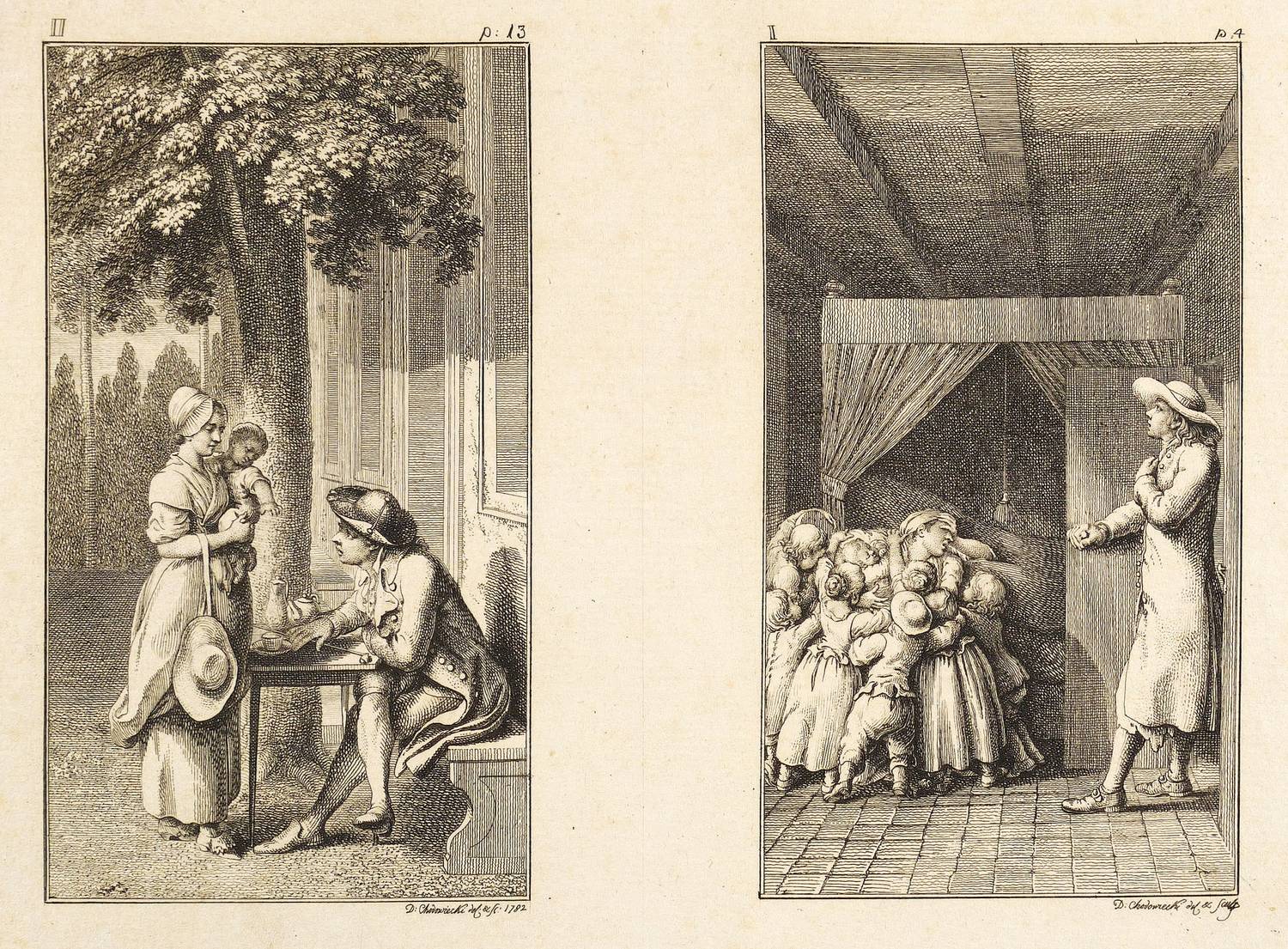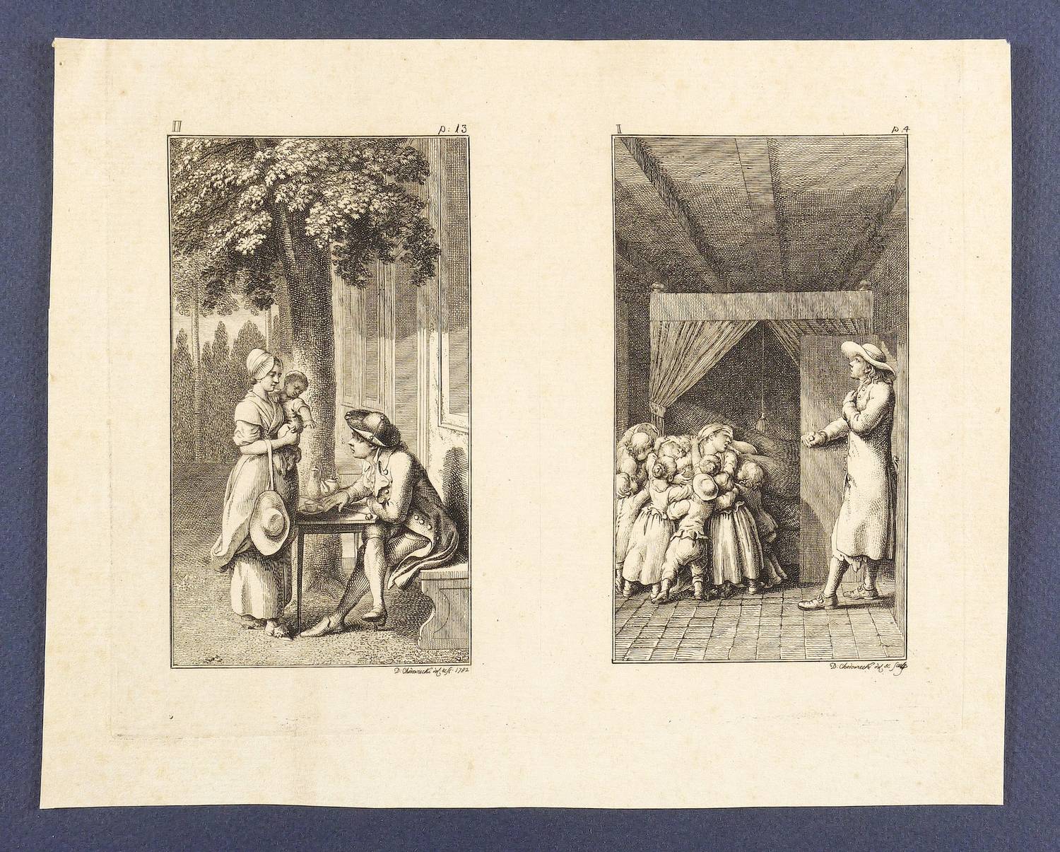 1782. Radierung / Strichätzung, auf Büttenpapier. – Originale Künstlergrafik, von Daniel Nikolaus Chodowiecki. – 12,2 x 6,9 cm (Darstellungen), 15,5 x 19,5 cm (Platten), 16-18 x 20-22 cm (Blätter).