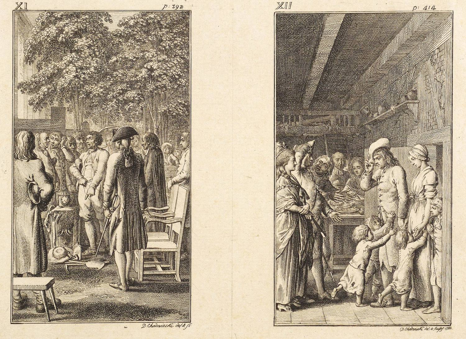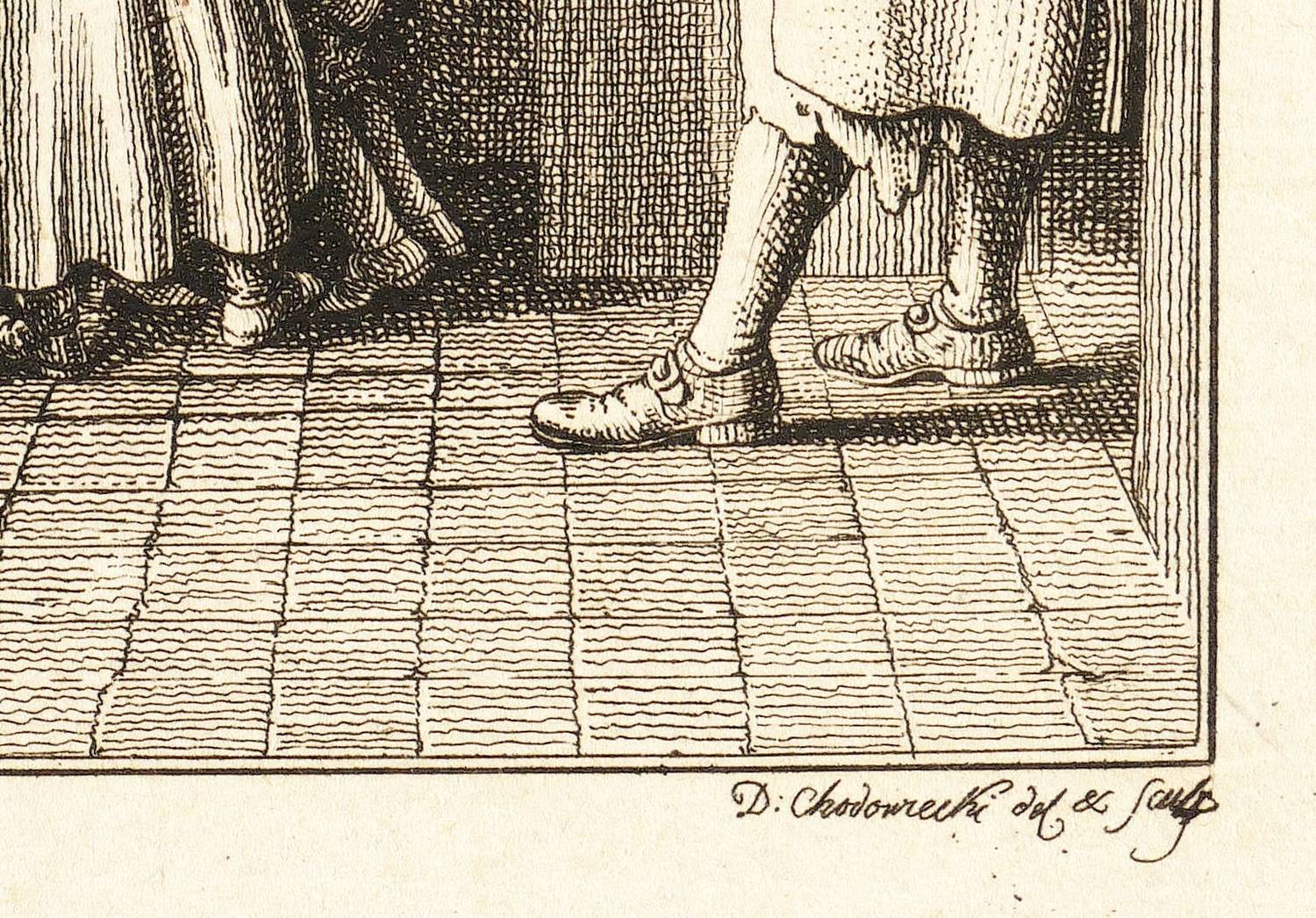 Daniel Nikolaus Chodowiecki (1726 Danzig - 1801 Berlin). Deutscher Kupferstecher, Grafiker und Illustrator. Bedeutender Vertreter der Kunst des Deutschen Klassizismus. Begann 1740 zunächst eine kaufmännische Lehre. Ab 1743 in der Haushaltswarenhandlung seines Onkels Antoine Ayrer in Berlin tätig. Letzterer unterstützte seine und seines Bruders Gottfried künstlerische Ausbildung und ließ beide von Johann Jakob Haid, Bernhard Rode und Johann Heinrich Meil unterrichten. Von den Ladengeschäften befreit, konnten sie sich 1754 mit Miniaturen und Emailmalereien selbstständig machen. Seit 1758 erste Radierversuche in allerlei Techniken wie Strichätzung, Aquatinta und Crayon-Manier. Frühe Verbindungen zu Verlegern von Almanachen und Kalendern beförderten diese Entwicklung. Vielbeschäftigt hat er Berlin nur selten verlassen. Eine längere Reise zu seiner Mutter nach Danzig im Jahre 1773 schlug sich dann entsprechend intensiv in seiner Arbeit nieder. Seit 1764 Mitglied der Königlich-Preußischen Akademie der Künste, ab 1797 deren Direktor.