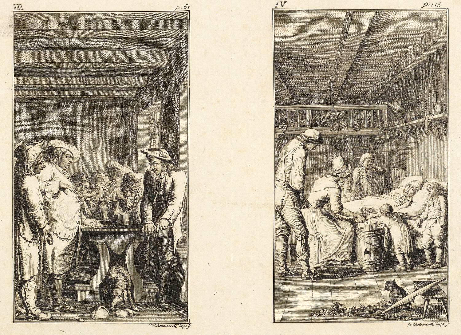Bauer 950-961. Engelmann 444-455. – Aus: Leonard et Gertrude ou les moeurs villagegoises ... (Berlin: Georg Jacob Decker 1783). – Blatt Nr. II in der Platte rechts unten signiert und datiert: ″D. Chodowiecki del. & sc. 1782″. – Komplette Serie von 12 Tafeln auf 6 Platten, ungeschnitten und ungebunden. – Blätter mit unterschiedlich breiten Rändern um die Platten. Guter Zustand.