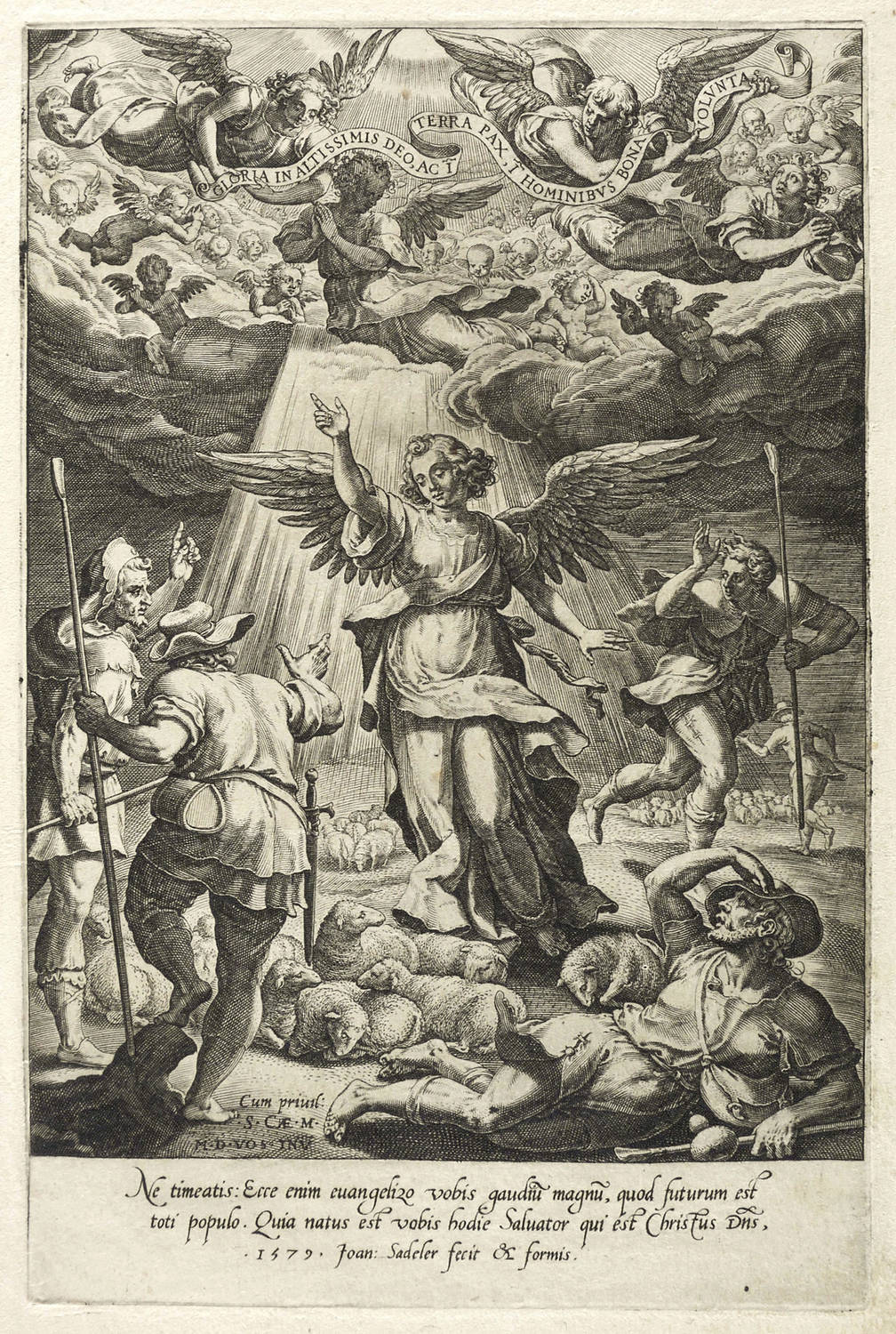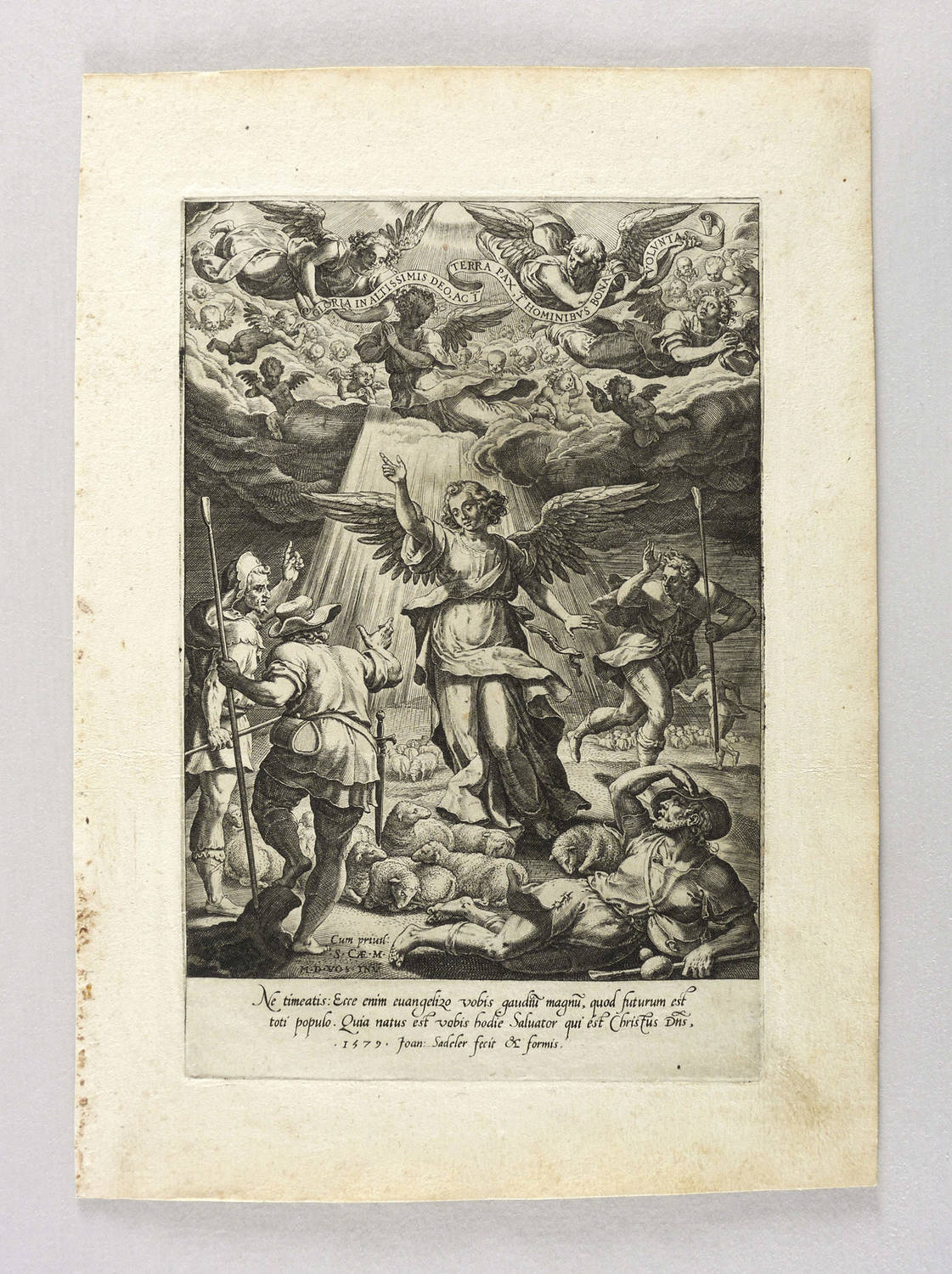 The Illustrated Bartsch 70, 152-153, 133. – In der Platte unterhalb der Darstellung in letzter Zeile gestochenes Datum und Signatur: ″1579. Joan: Sadeler fecit & formis.″ Darüber Inschrift: ″Ne timeatis: Ecce enim evangelizo vobis gaudiu[m] magnu[m], quod futurum est toti populo. Quia natus est vobis hodie Salvator qui est Christus D[omi]n[u]s.″ – Rechte untere Blattecke unscheinbar fingerfleckig. Sonst ohne Mangel.. Sehr guter Zustand.