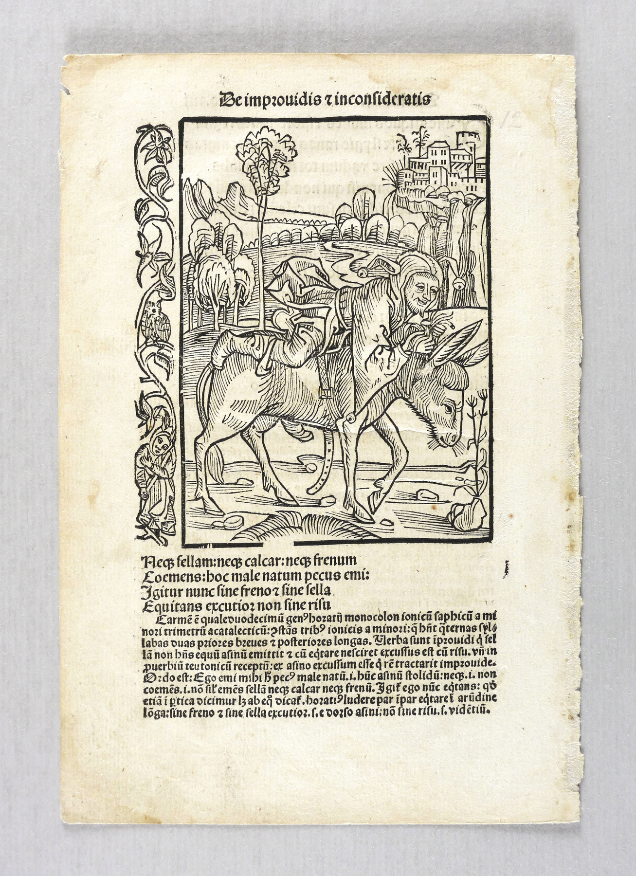 Aus: Jodocus Badius Ascensius, Navis stultifera (Basel: Nicolaus Lamparter 1507). – Unterhalb der Darstellungen typografischer Text: ″Neq[ue] sellam: neq[ue] calcar: neq[ue] frenum″. Oberhalb bezeichnet: ″De improuidis et inconsideratis″. – Blatt XIII verso mit einem Holzschnitt aus der Baseler Ausgabe des Narrenschiff von Badius Ascensius nach Sebastian Brant von 1507. – Darstellung eines Narren, dessen mangelnde Vorsicht und Vorbereitung veranschaulicht wird, indem er auf einem Esel reitet, ungesattelt, ohne Steigbügel und Zügel. – Originalrandiges Exemplar. Papier mit geringfügigen Alterspuren. Durchaus guter Erhaltungszustand.