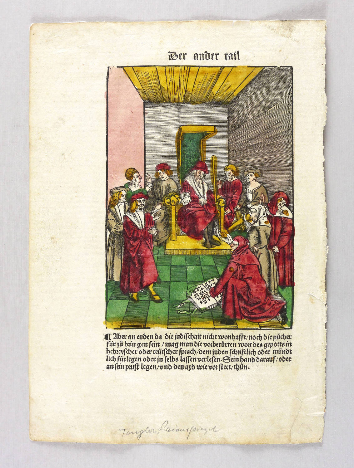 Aus: Ulrich Tengler, Der neü Layenspiegel. Von rechtmässigen ordnungen in Burgerlichen und peinlichen Regimenten (Augsburg: Otmar 1512). – Verso typografischer Absatz-Titel: ″Forma ains Juden Ayd″. Unterhalb der Darstellung weiter: ″Aber an enden da die judischait nicht wohnhafft, noch die pücher fürzubringen sein, mag man die vorberürten wort des gepotts in hebreyscher oder teütscher sprach, dem juden schriftlich oder mündtlich fürlegen oder in selbs lassen verlesen. Sein hadn darauf, oder an sein prust legen, und den ayd wie vor steet, thun.″ – Der 1509 erschienene ″Laienspiegel″ des Höchstädter Landvogts Ulrich Tengler gilt als bedeutendes Rechtsbuch der frühen Neuzeit, weil es überliefertes römisch-kanonisches Recht mit einheimischen Rechtsinhalten kombiniert. – Ein Exemplar dieses mit Holzschnitten illustrierten Laienspiegel- Drucks befindet sich in der Bayerischen Staatsbibliothek (Rar. 2311). – Hier Blatt CXI verso. – Rechts unten kleiner Einriss in der Ecke hinterlegt. Minimal fleckig. Blatt insgesamt in gutem Zustand.