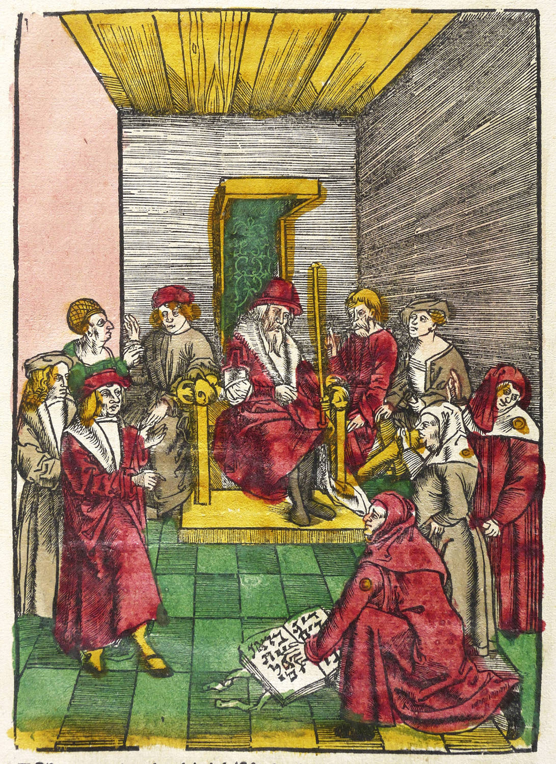 1512. Holzschnitt, in Schwarz, alt koloriert, auf Bütten. – Originale Künstlergrafik, von Monogrammist HF. – 19,0 x 13,5 cm (Darstellung / Einfassungslinie), 30 x 22 cm (Blatt).