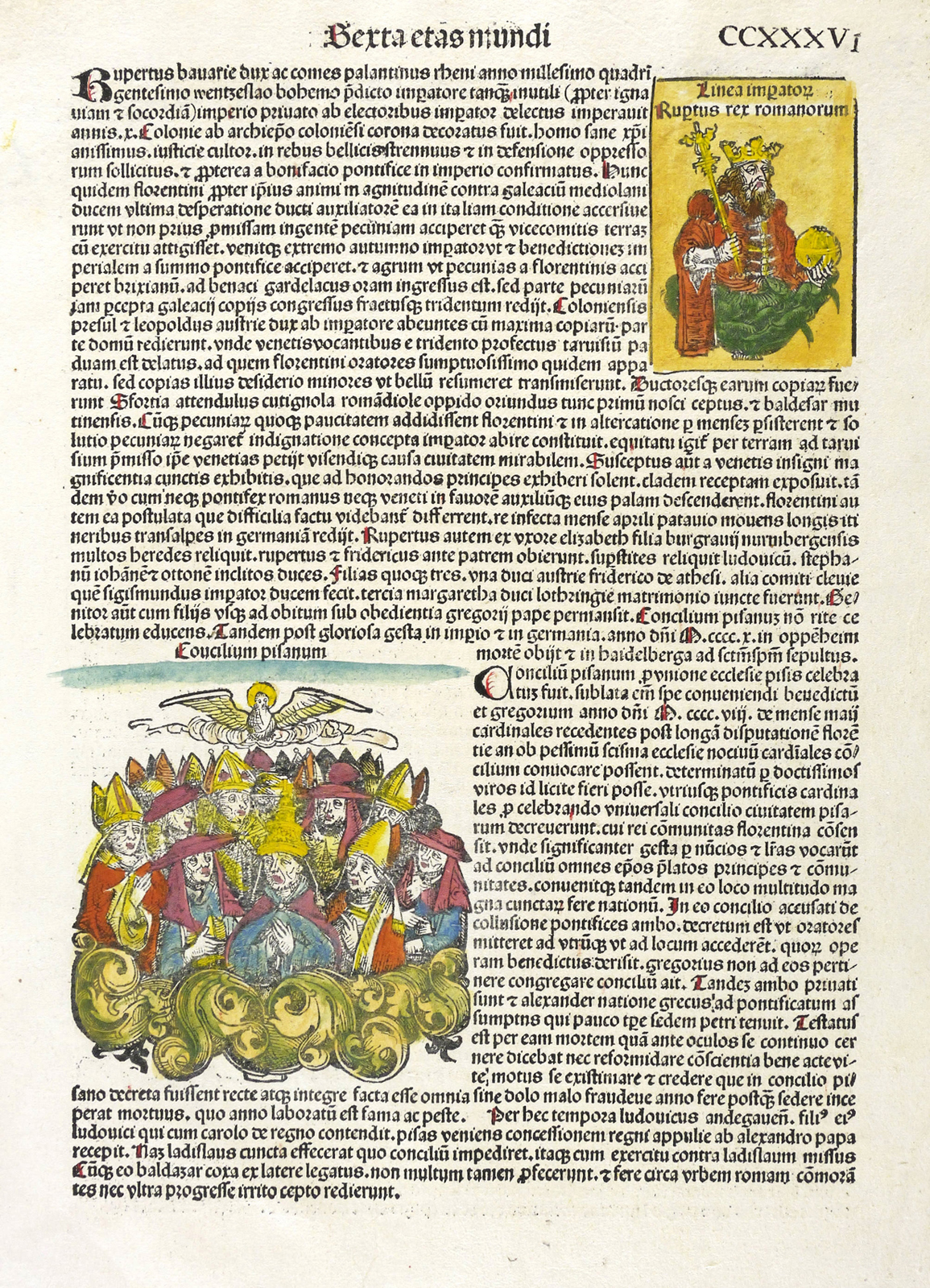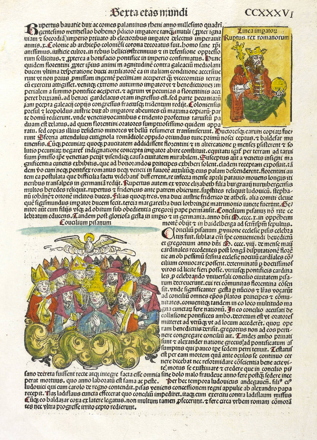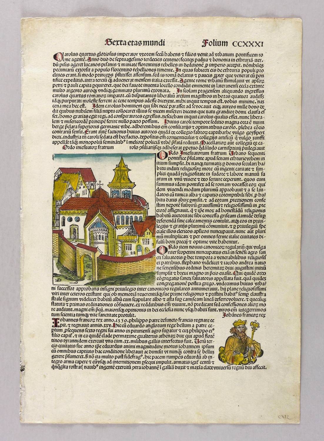 Aus: Hartmann Schedel, Liber chronicarum [Weltchronik]. Registrum huius operis libri cronicarum cu[m] figuris et ymagi[ni]bus ab inicio mu[n]di (Nürnberg: Anton Koberger 1493). – Rechts neben der Darstellung typografischer Begleittext: ″... apud senam ethrurie urbem (...)″. Umlaufend und verso weiterer lateinsicher Text. – Blatt CCXXXI mit 2 Seiten, 4 kolorierten Holzschnitten, neben der phantastischen Stadtansicht von Etrurien oder der etruskischen Städte noch 3 Herrscher- Bildnisse ″Johan[n]es franc[..] rex″, ″Linea summo[..] pontifici Urbanus quitnus″ und ″Gregorius vindecimus″. – Die unteren Ecken etwas fingerfleckig. Insgesamt sehr gut erhalten.