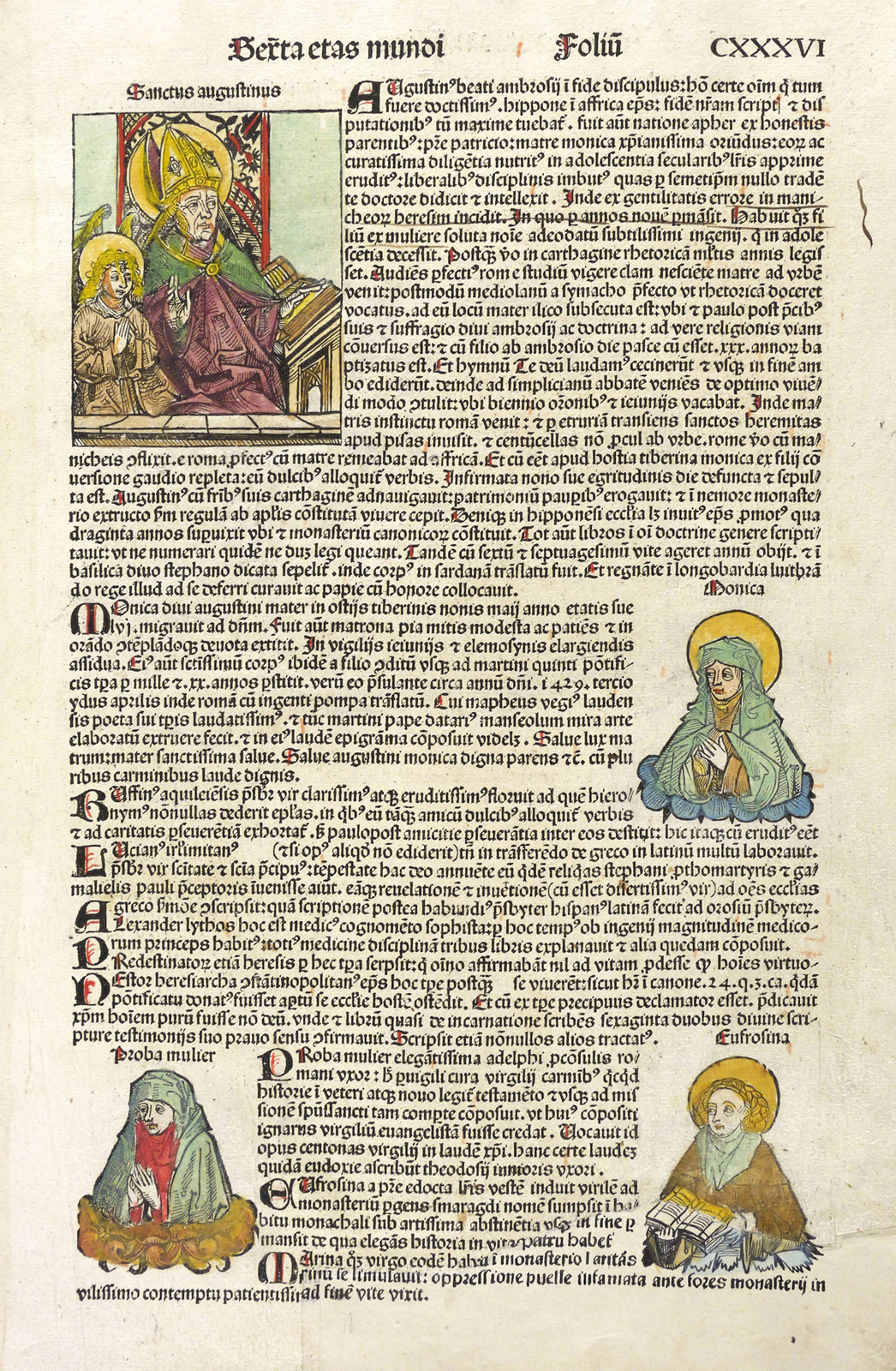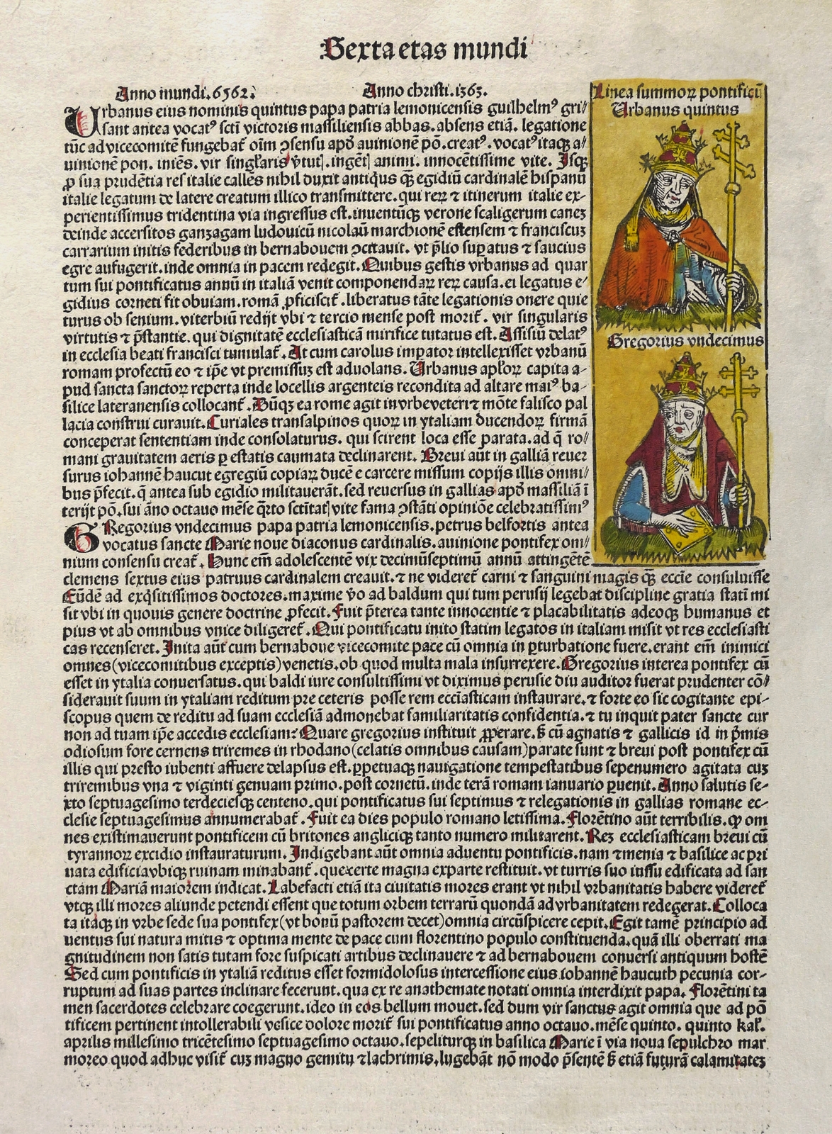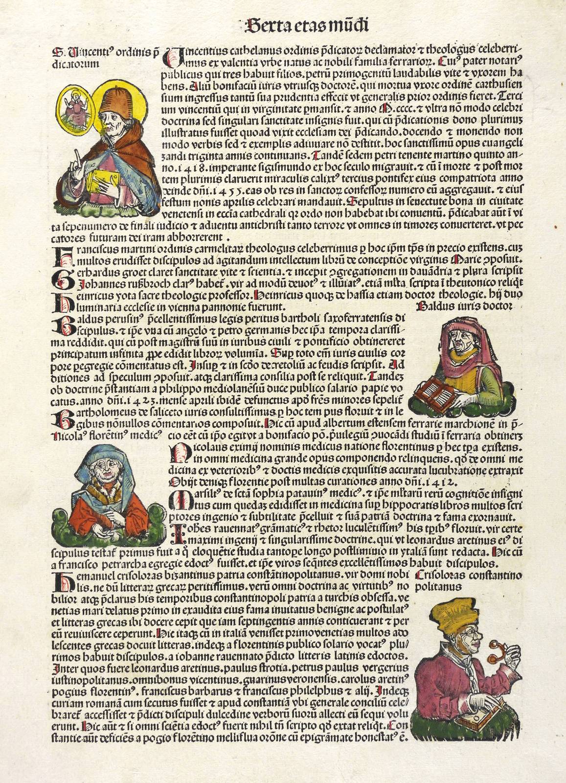 Aus: Hartmann Schedel, Liber chronicarum [Weltchronik]. Registrum huius operis libri cronicarum cu[m] figuris et ymagi[ni]bus ab inicio mu[n]di (Nürnberg: Anton Koberger 1493). – Rechts neben der Darstellung typografischer Begleittext: ″... apud senam ethrurie urbem (...)″. Umlaufend und verso weiterer lateinsicher Text. – Blatt CCXXXI mit 2 Seiten, 4 kolorierten Holzschnitten, neben der phantastischen Stadtansicht von Etrurien oder der etruskischen Städte noch 3 Herrscher- Bildnisse ″Johan[n]es franc[..] rex″, ″Linea summo[..] pontifici Urbanus quitnus″ und ″Gregorius vindecimus″. – Die unteren Ecken etwas fingerfleckig. Insgesamt sehr gut erhalten.
