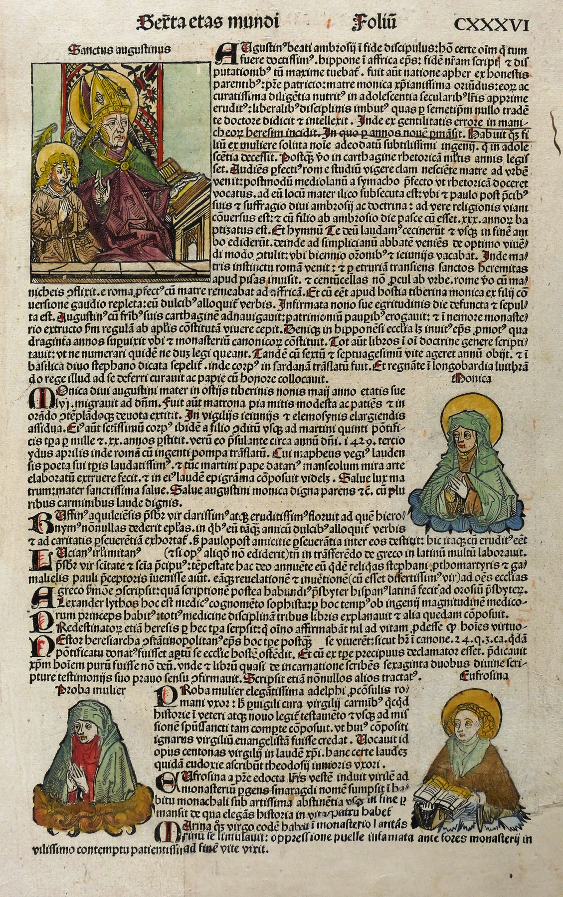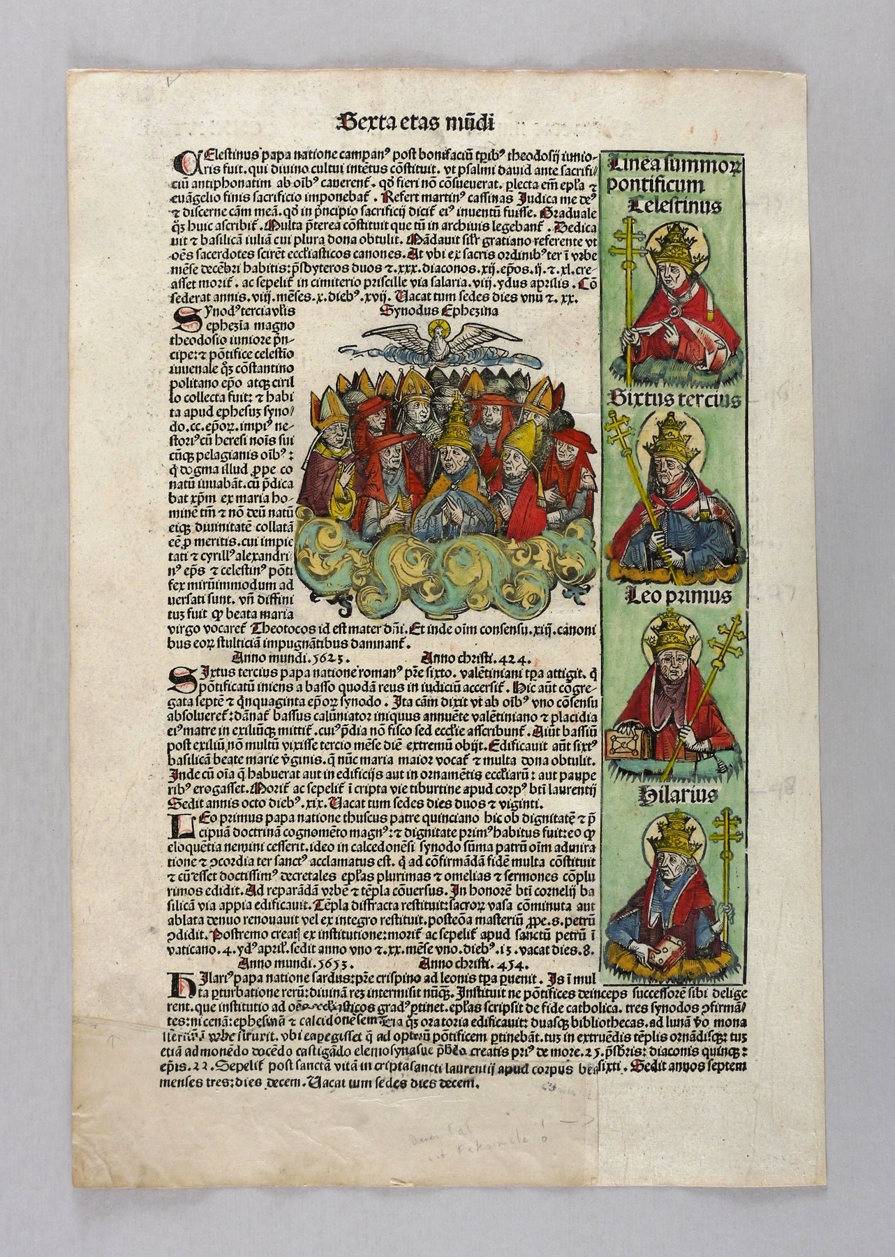 Aus: Hartmann Schedel, Liber chronicarum [Weltchronik]. Registrum huius operis libri cronicarum cu[m] figuris et ymagi[ni]bus ab inicio mu[n]di (Nürnberg: Anton Koberger 1493). – Oberhalb der Darstellung typografischer Text: ″Synodus Ephezina″. Umlaufend und verso weiterer lateinsicher Text. – Schematische Darstellung vom Konzil von Ephesos (431), dem dritten allgemeinen Konzil der Kirche (auch Drittes Ökumenisches Konzil). – Blatt CXXXVI mit 2 Seiten, 6 kolorierten Holzschnitten, neben der Darstellung der Synode noch 4 Papst- Bildnisse ″Celestinus″, ″Sixtus tercius″, ″Leo primus″ und ″Hilarius″. Dazu Bildnisse von ″Sanctus Augustinus″, ″Monica″, Proba mulier″ und ″Eurosina″. – Insgesamt sehr gut erhalten.