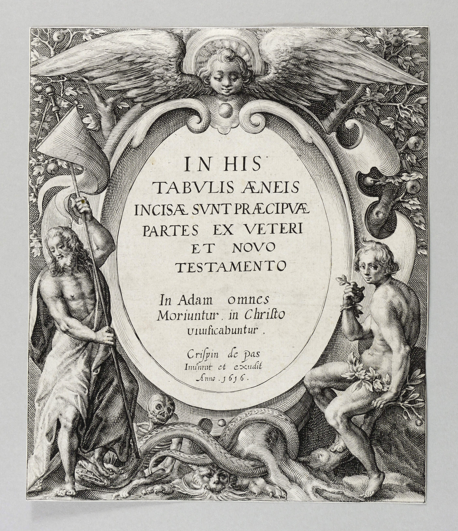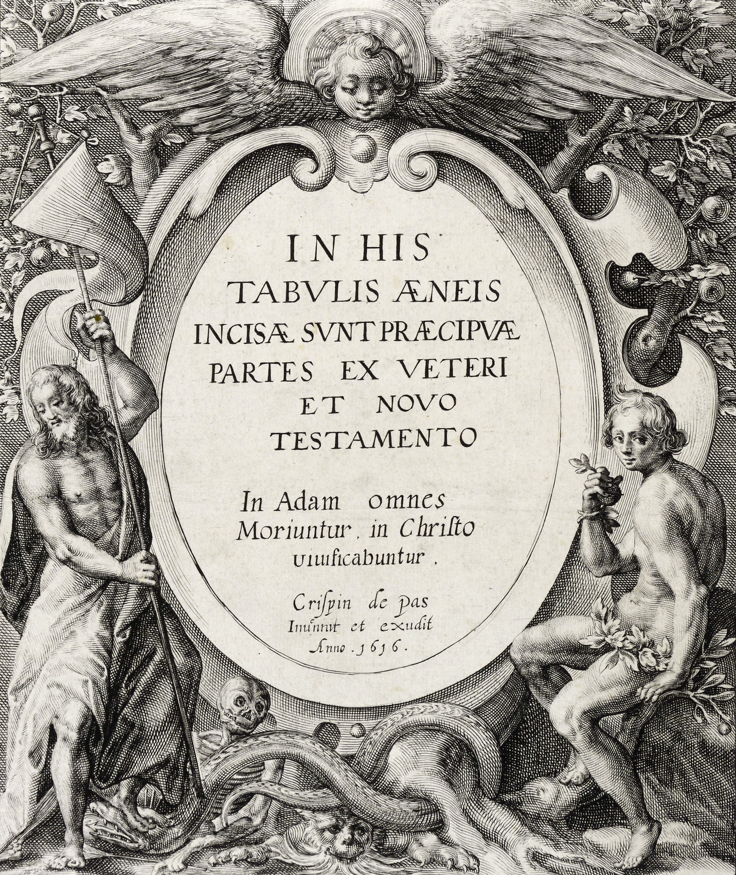 Im ovalen Schriftfeld unten signiert: ″Crispin de Pas Inuenit et exudit Anno. 1616.″ Darüber bezeichnet: ″IN HIS TBULIS AENEIS INCISAE SUNT PRAECIPUAE PARTES EX VETERI ET NOVO TESTAMENTO // In Adam omnes Moriuntur, in Christo vivificabuntur.″ – Titelblatt mit der Figur des Christus triumphans (mit der SIgesfahne über Tod und Teufel) sowie Adam mit einem Apfel vom Baum der Erkenntnis. – Mit knappem Rändchen um die Darstellung. Guter Erhaltungszustand.