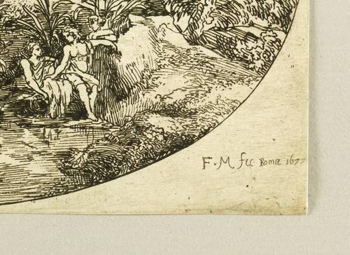 Hollstein 10. – Rechts unten signiert und datiert: F•M fec. Romae 1677″. – Blatt bis auf die Plattenkante beschnitten. Sonst aber guter Zustand.