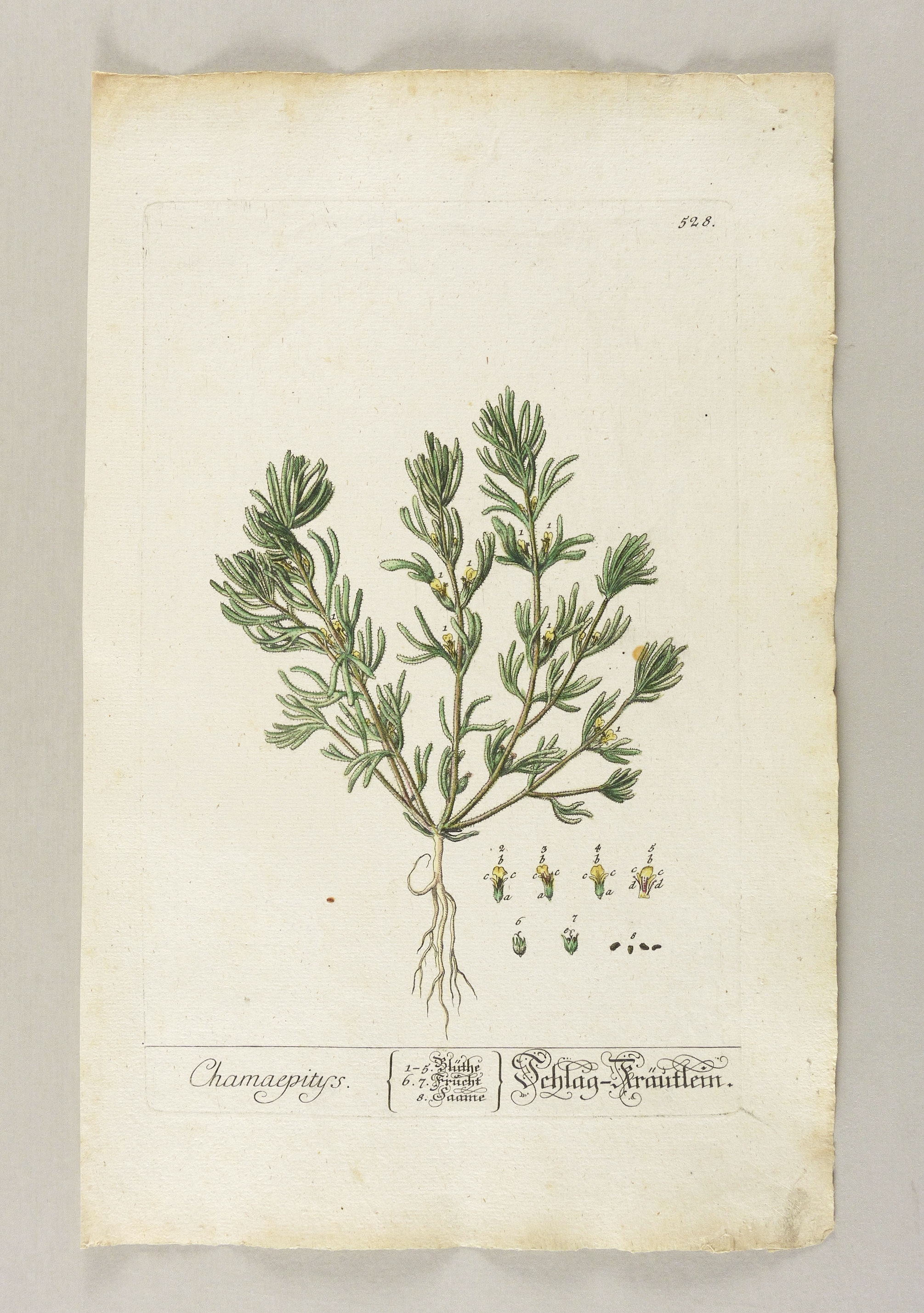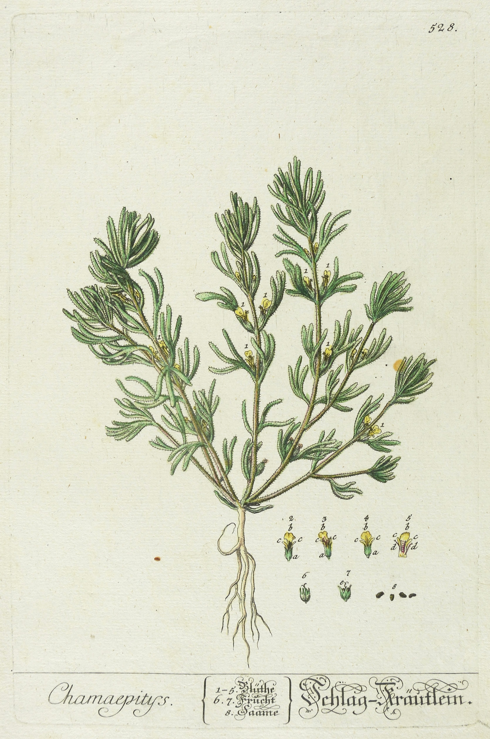 Lippenblütler. – Gelber-Günsel (Ajuga chamaepitys). – Herbarium Blackwellianum. – „Chamaepitys. Schlag-Kräutlein”.