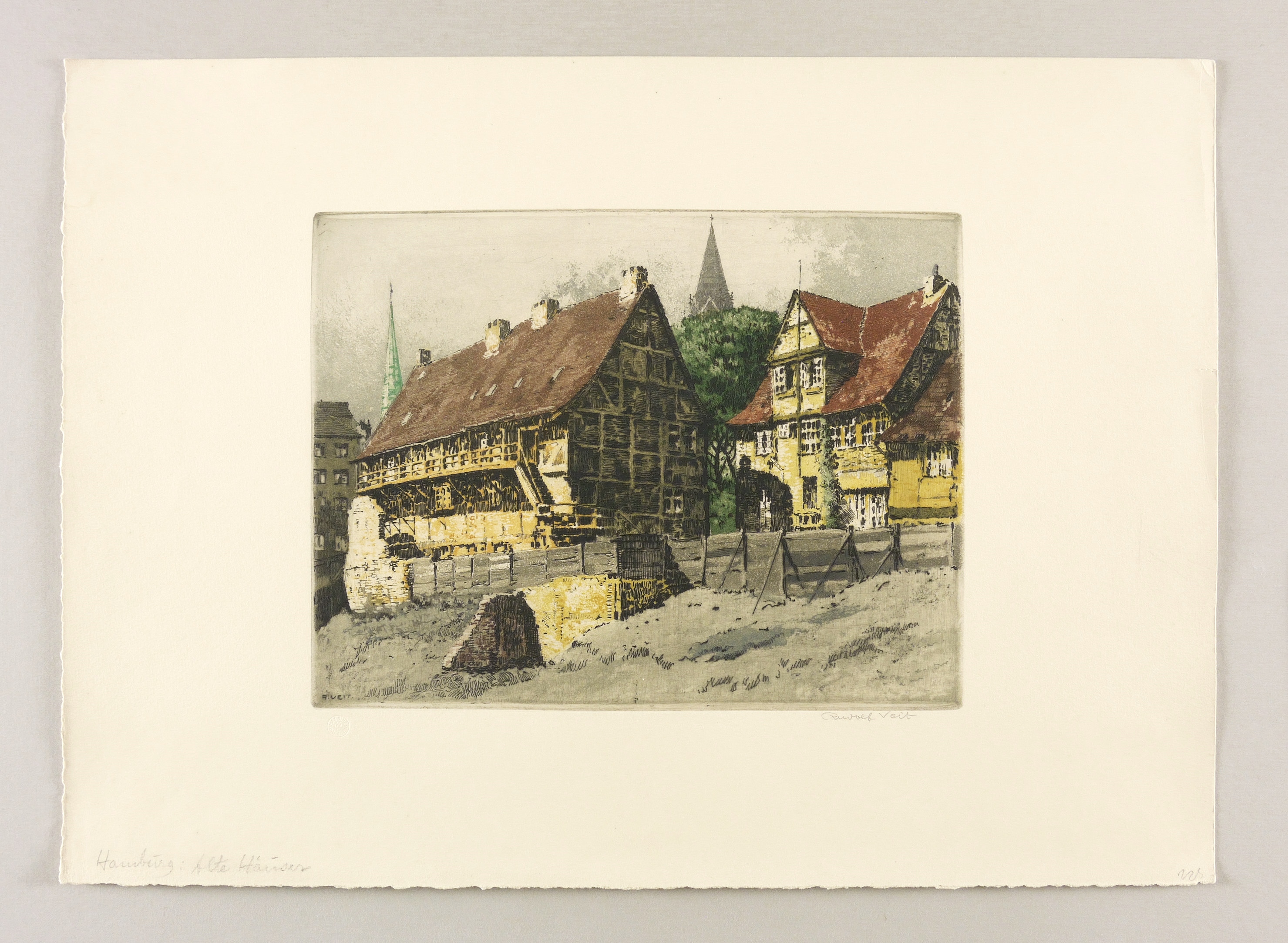 Um 1925. Farbradierung / Aquatinta. – Historische Ortsansicht, von Rudolf Veit. – 22,8 x 29,6 cm (Darstellung / Platte), 38 x 52,5 cm (Blatt).
