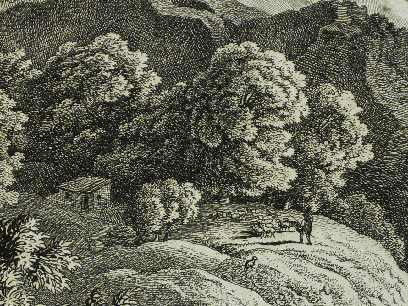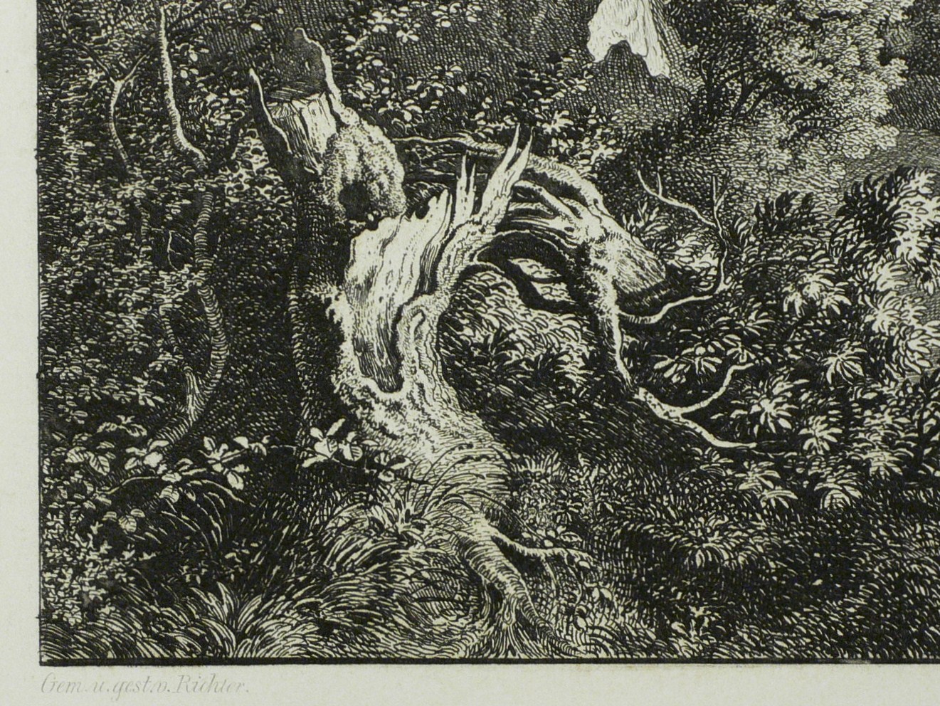 Hoff-Budde 199 [1875, 5]. Hoff 163. – Aus: Adrian Ludwig Richter, Landschaften von Ludwig Richter. Zwölf Original-Radirungen (Leipzig: Alphons Dürr 1875). – In der Platte rechts unten signiert ″Gem. u. gest. v. Richter.″ Mittig Druckeradresse Friedrich Felsing, München. Unterhalb gestochener Titel. – Später originaler Abzug der schon 1830 für die ″Bilderchronik″ des Sächsischen Kunstvereins hergestellten Platte. – Blatt mit reichlichem Rand um die Platte, ohne Lager- und Altersspuren. Hervorragendes Exemplar.