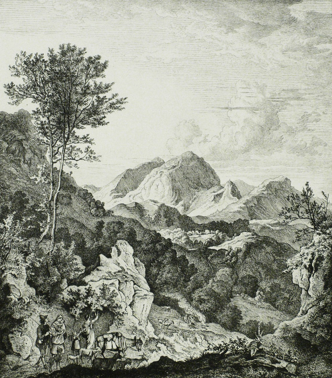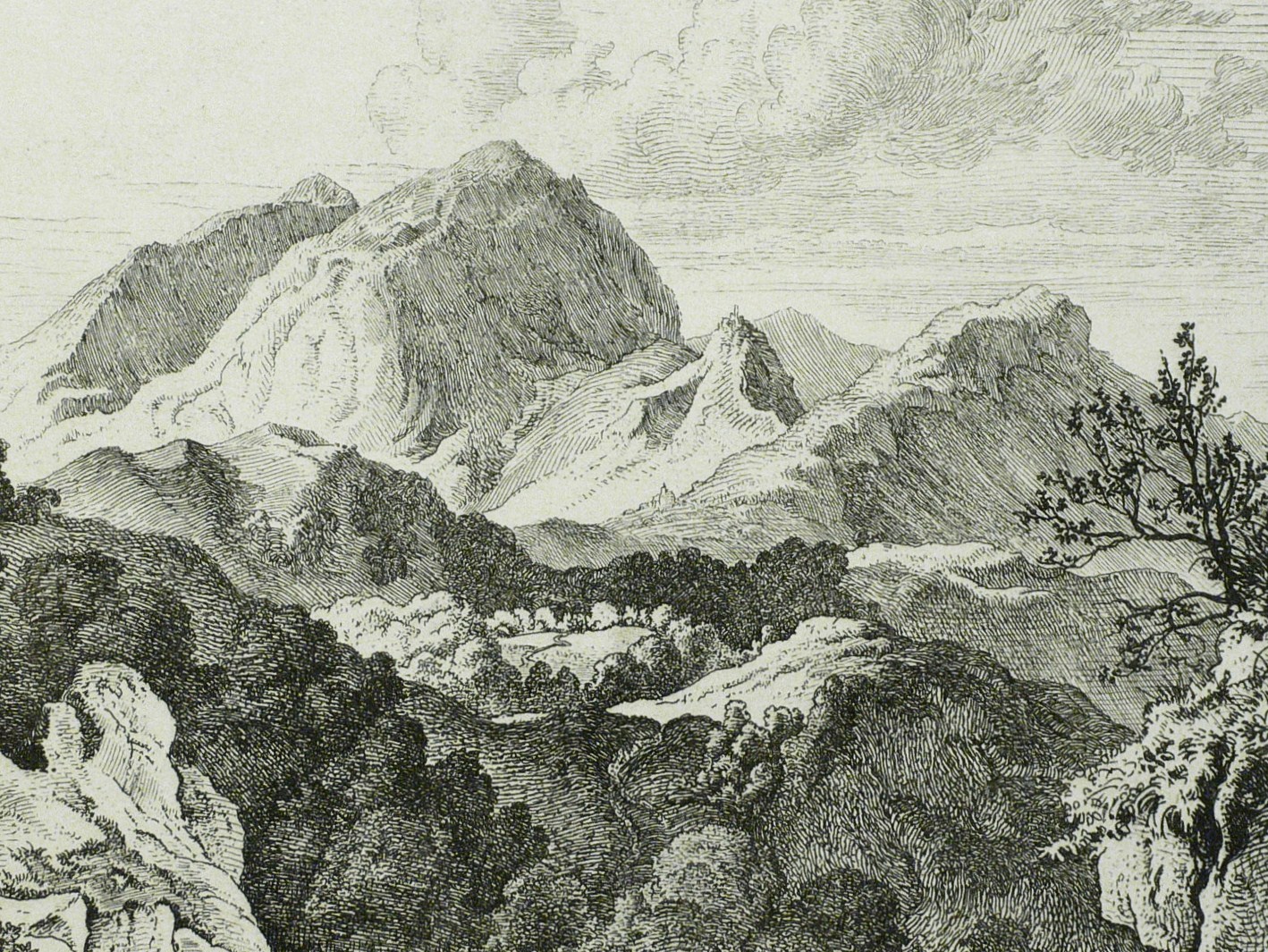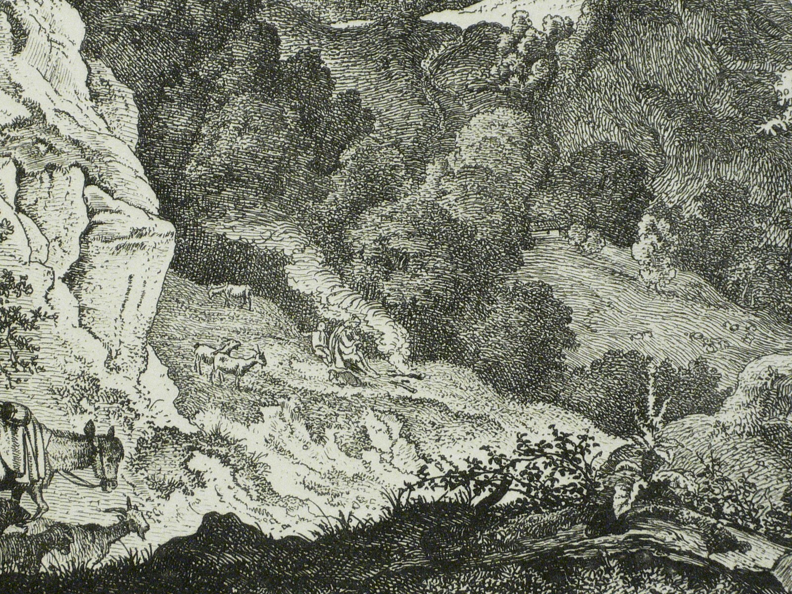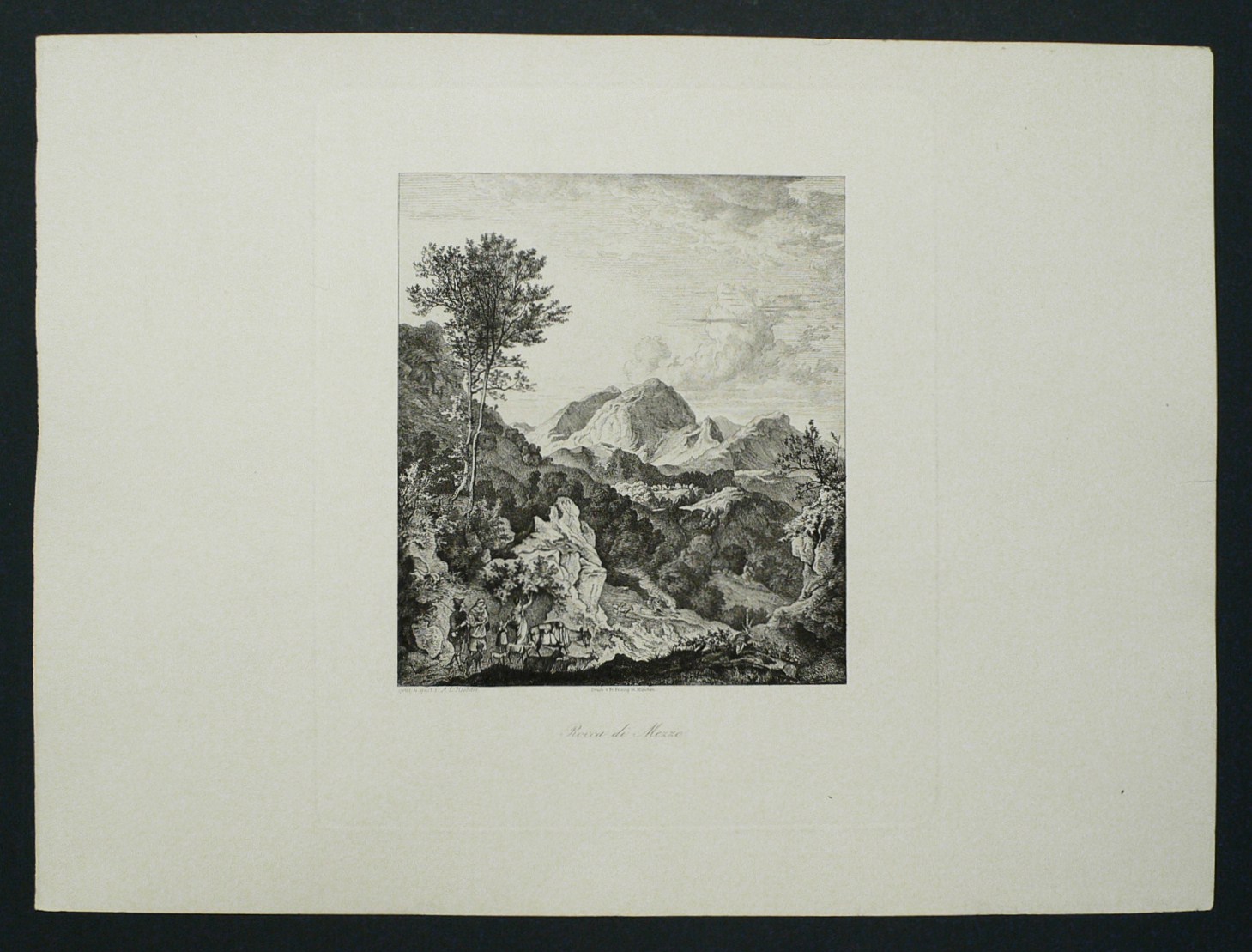 Hoff-Budde 192 [1875, 7]. Hoff 156. – Aus: Adrian Ludwig Richter, Landschaften von Ludwig Richter. Zwölf Original-Radirungen (Leipzig: Alphons Dürr 1875). – Signiert unten links "gem. u. gest. v. A.L. Richter." Dazu mittig Druckeradresse Friedrich Felsing, München. Unten gestochener Titel. – Später originaler Abzug der schon 1829 für die "Bilderchronik" des Sächsischen Kunstvereins hergestellten Platte. - Malerischer Ausblick auf die Berge der Abruzzen. Im Vordergrund links eine kleine Gruppe italienischer Landleute. Auf einer Anhöhe im Bildmittelgrund an einem Feuer ein Knabe und ein Schäfer auf dem Dudelsack spielend. – Weitgehend originalrandiges Exemplar, kleiner unscheinbarer Einriß im rechten Rand. Sonst sehr guter Zustand.