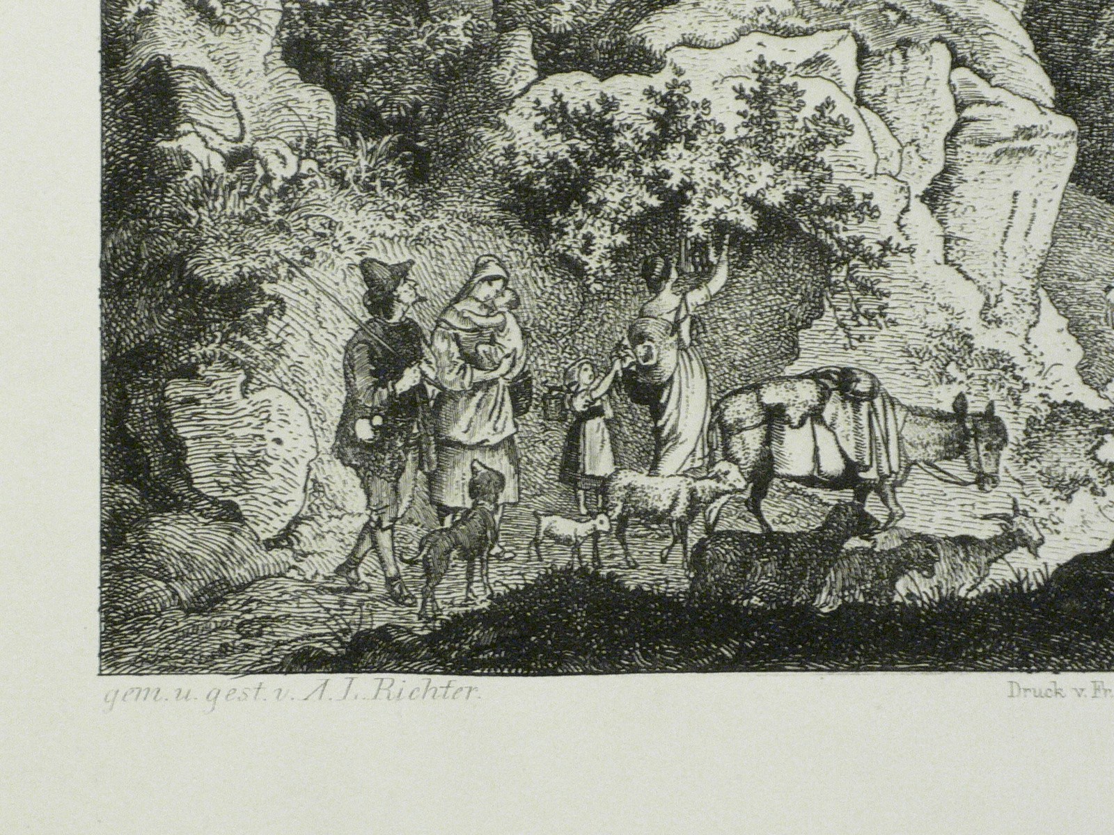 Adrian Ludwig Richter (1803 Dresden - 1884 Dresden). Bedeutender Maler, Zeichner und Grafiker der deutschen Romantik und des Biedermeier. Sohn des Zeichners und Kupferstechers Carl August Richter. Nach der Schulzeit begann er 1815 als Lehrling seines Vaters, studierte daneben an der Kunstakademie in Dresden. 1820/21 begleitete er den russischen Fürst Narischkin als Zeichner auf einer Reise nach Paris. 1823-26 reiste er nach Italien, wo er unter anderen mit Joseph Anton Koch und Julius Schnorr von Carolsfeld zusammentraf. Dies prägte seine idealistisch-harmonische Landschaftsauffassung. 1828-35 lehrte er an der Zeichenschule der Porzellanmanufaktur in Meißen, wo Gottfried Pulian zu seinen Schülern zählte. 1826 wurde er als Lehrer für Lasndschaftsmalerei an die Dresdner Kunstakademie berufen. Für die Reihe „Das malerische und romantische Deutschland“ des Leipziger Verlegers Georg Wigand schuf er die Ansichten für die Bände zu Harz, Franken und Riesengebirge. In den späten 1830er Jahren begann er mit Holzschnitt-Illustrationen für Bücher, die ihn unter einem größeren Laienpublikum in Deutschland bekannt machten. Schließlich wurde er zum Professor für Landschaftsmalerei in Dresden ernannt. 1873 musste er aufgrund eines Augenleidens mit dem Malen aufhören und schied 1876 aus der Kunstakademie in Dresden aus.