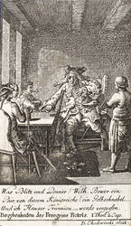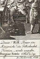 Daniel Nikolaus Chodowiecki (1726 Danzig - 1801 Berlin). Deutscher Kupferstecher, Grafiker und Illustrator. Bedeutender Vertreter der Kunst des Deutschen Klassizismus. Begann 1740 zunächst eine kaufmännische Lehre. Ab 1743 in der Haushaltswarenhandlung seines Onkels Antoine Ayrer in Berlin tätig. Letzterer unterstützte seine und seines Bruders Gottfried künstlerische Ausbildung und ließ beide von Johann Jakob Haid, Bernhard Rode und Johann Heinrich Meil unterrichten. Von den Ladengeschäften befreit, konnten sie sich 1754 mit Miniaturen und Emailmalereien selbstständig machen. Seit 1758 erste Radierversuche in allerlei Techniken wie Strichätzung, Aquatinta und Crayon-Manier. Frühe Verbindungen zu Verlegern von Almanachen und Kalendern beförderten diese Entwicklung. Vielbeschäftigt hat er Berlin nur selten verlassen. Eine längere Reise zu seiner Mutter nach Danzig im Jahre 1773 schlug sich dann entsprechend intensiv in seiner Arbeit nieder. Seit 1764 Mitglied der Königlich-Preußischen Akademie der Künste, ab 1797 deren Direktor.