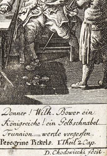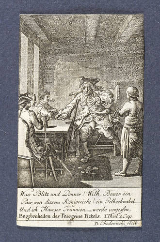Bauer 1147. Engelmann 533-1. – Aus: [Historisch-genealogischer Kalender]. Berliner Genealogischer Calender auf das Jahr 1786 (Berlin: Königliche Preußische Kalender-Deputation 1786). – In der Platte rechts unten gestochene Signatur: ″D. Chodowiecki fecit.″ Inschrift: ″Was Blitz und Donner! Wilh. Bower ein Pair von diesem Königreiche″ ein gelbschnabel ... Und ich Hawser Trunnion ... werde vergessen.″ Dazu bezeichnet: ″Begebenheiten des Peregrine Pickels. I. Theil 2 Cap.″ – Erstes Blatt von 12 Blättern zu ″Peregrine Pickle″. - Der kriegsinvalide Kommodore Trunnion erregt sich im Wirthaus über die Erhebung des Konkurrenten Admiral Bower so sehr, dass er seinen Bierkrug fallen lässt. – Auf Einfassungslinie und Schrift beschnitten. Mäßig guter Zustand.