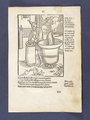 Aus: Jacob Locher, Stultifera Navis (Lyon: Jacobus Sacon 1498). – Rechts neben der Darstellungen typografischer Text: ″NIL CV=RARE DETRACTIONE[M] HOMINU[M].″ Oberhalb Blattnummer: ″LI″. Unterhalb weiterer Text: ″Iccirco [richtig: Idcirco] stultum est omnes curare loquelas / Cum surda possis effugere aure sonum / ...″ – Blatt LI recto mit einem Holzschnitt aus der Lyoner Ausgabe des Narrenschiff von Sebastian Brant bei Jacobus Sacon 1498. – Originalrandiges Exemplar. Papier etwas fleckig und gewellt. Noch guter Erhaltungszustand.