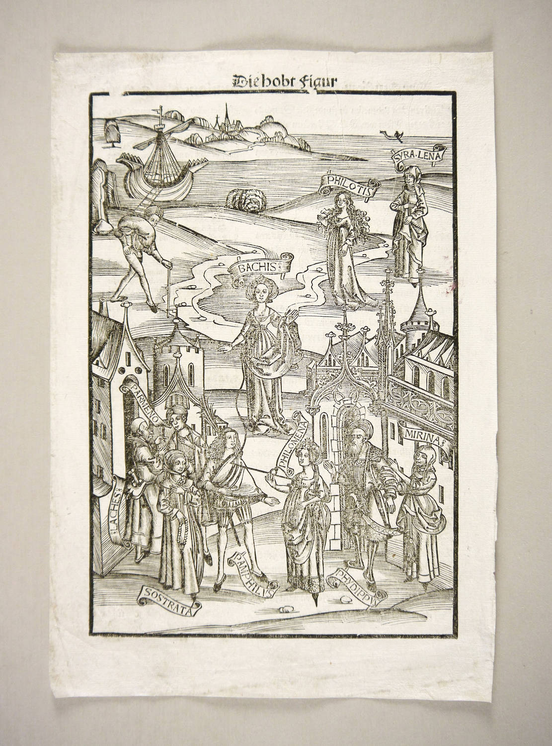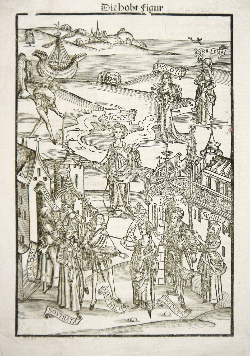 Aus: Publius Terentius Afer, Terentius der Hochgelert vnd aller brüchlichest Poet (Straßburg: Johann Grüninger 1499). – Blatt 158v der wohl ersten deutschen Ausgabe des Schauspiels. Dieser Holzschnitt wurde bereits 1496 in einer lateinischen Terenz- Ausgabe von Grüninger publiziert. - Deutscher Rückentext. – Guter Zustand.