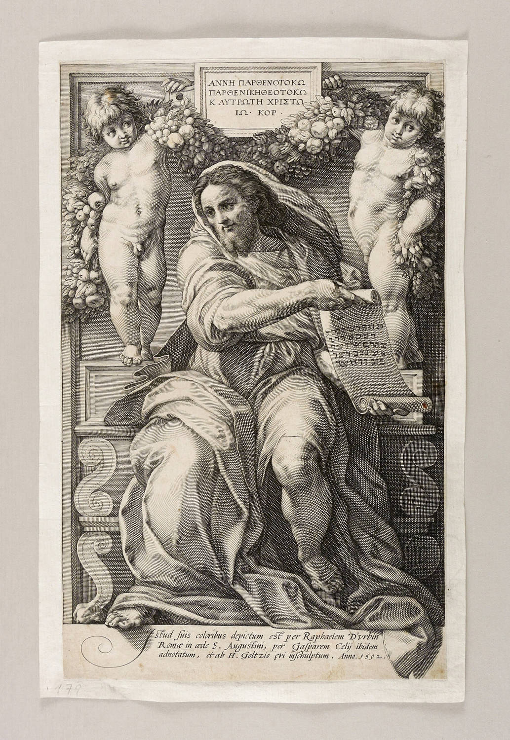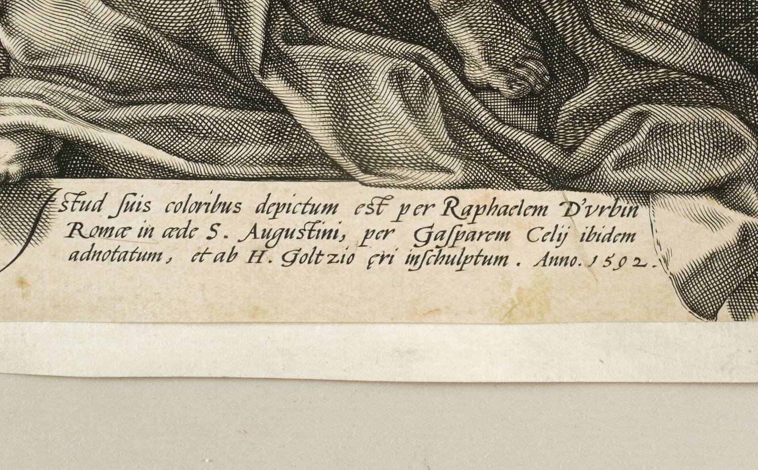 Unterhalb signiert und datiert: ″Istud suis coloribus depictum est per Raphaelem D'vrbin Romae in aede S. Augustini, per Gasparem Celij ibidem adnotatum, et ab H. Goltzio eri inschulptum. Ann 1592.″ Oben in der Darstellung griechisch bezeichnet: ″Annē parthenotokō parthenikētheotokō ...″ (Anna, Mutter der Jungfrau, der Jungfrau Gottesgebärerin und Christus – Jo(hannes) Cor(icius). – Darstellung nach einem Fresko von Raffael von 1511/12 in Sant’Agostino in Campo Marzio in Rom. – Blatt bis auf die Darstellungskanten beschnitten und alt auf Träger montiert. Im unteren Rand teils leicht fleckig. Sonst aber guter Zustand.