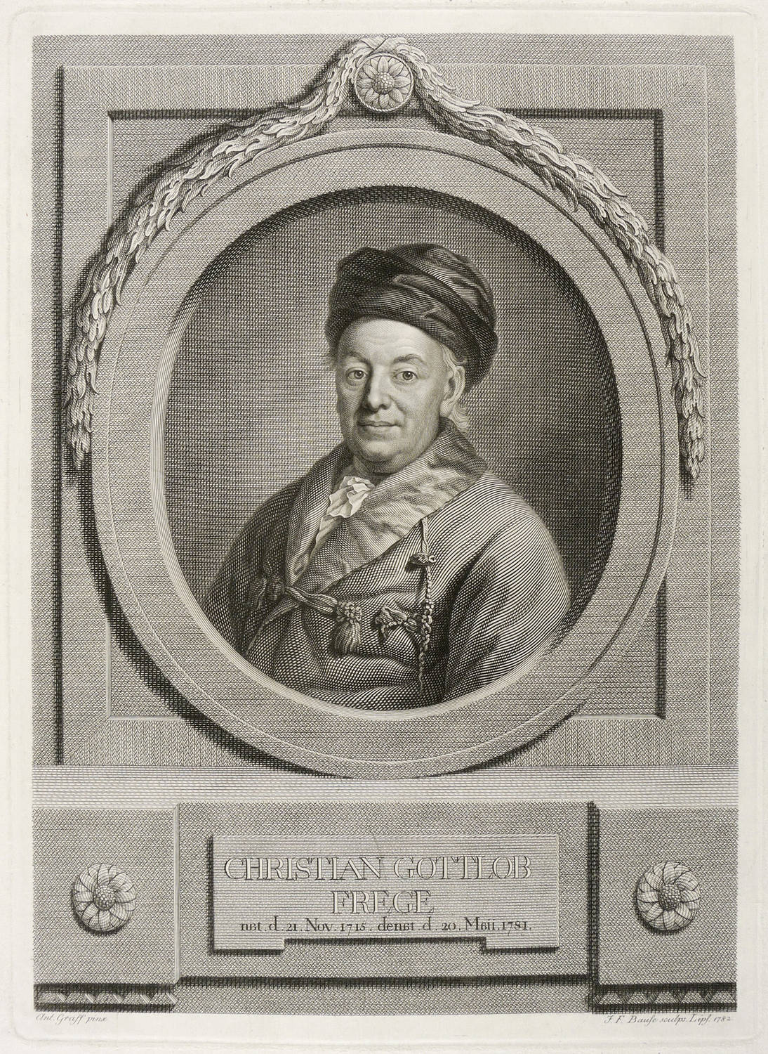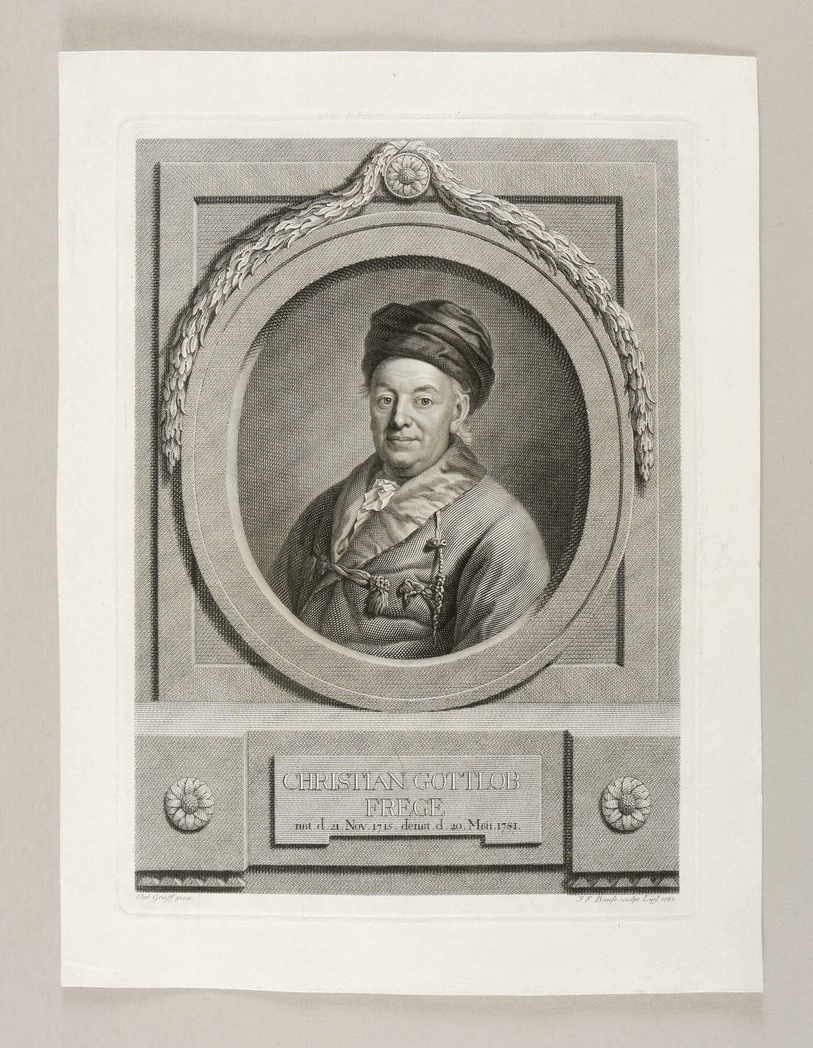 Johann Friedrich Bause (1738 Halle an der Saale - 1814 Weimar). Deutscher Kupferstecher und Radierer. Früh verwaist autodidaktisches Studium der Kunst, wobei er sich an Johann Georg Wille orientierte. 1759 unter Johann Jacob Haid in Augsburg tätig, wo Anton Graff ein Porträt von ihm malte. 1763 Heirat mit Henriette Charlotte Brünner in Halle. Ging 1766 nach Leipzig, wo er Professor für Kupferstich an der Kunstakademie wurde und sich zu einem der besten Porträtstecher seiner Zeit ausbildete. Seit 1786 Ehrenmitglied der Preußischen Akademie der Künste in Berlin. Als um 1809 sein Augenlicht nachließ, fertigte er einen letzten Stich von seinem Schwiegersohn.