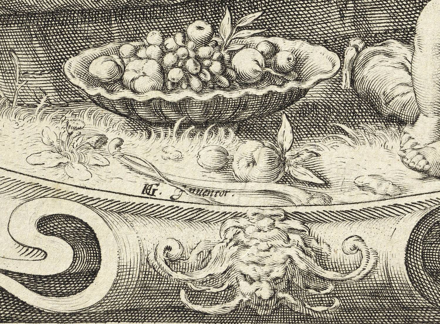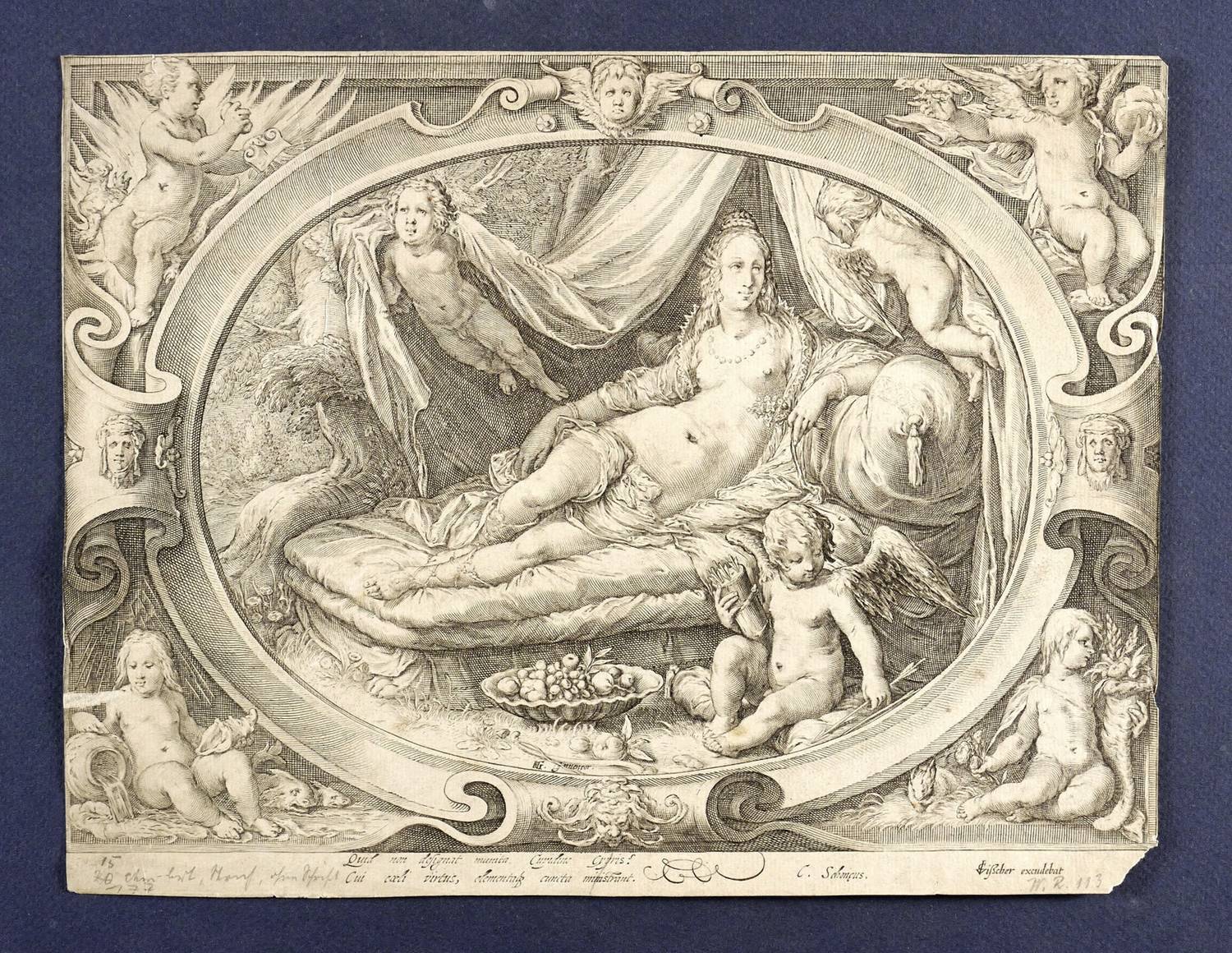 Leesberg (New Hollstein, Goltzius) 602 II. Hollstein 74 II. Wurzbach 51. Bartsch 51. – Im unteren Rand der querovalen Darstellung signiert ″HG. Inuentor.″ Im unteren Plattenrand bezeichnet: ″Quid non designat munita Cupidine Cypris. / Cui coeli virtus, elementa(..) cuncta ministrant. / C. Schoncus.″ Rechts Verlegeradresse von I.C. Visscher. – Oben und seitlich auf den Darstellungsrand, unten auf die Plattenkante beschnitten. Rechts unten kleiner Eckenausriss. Verso im oberen Rand ältere Klebe- und Montagespuren. Insgesamt mäßig guter Zustand.