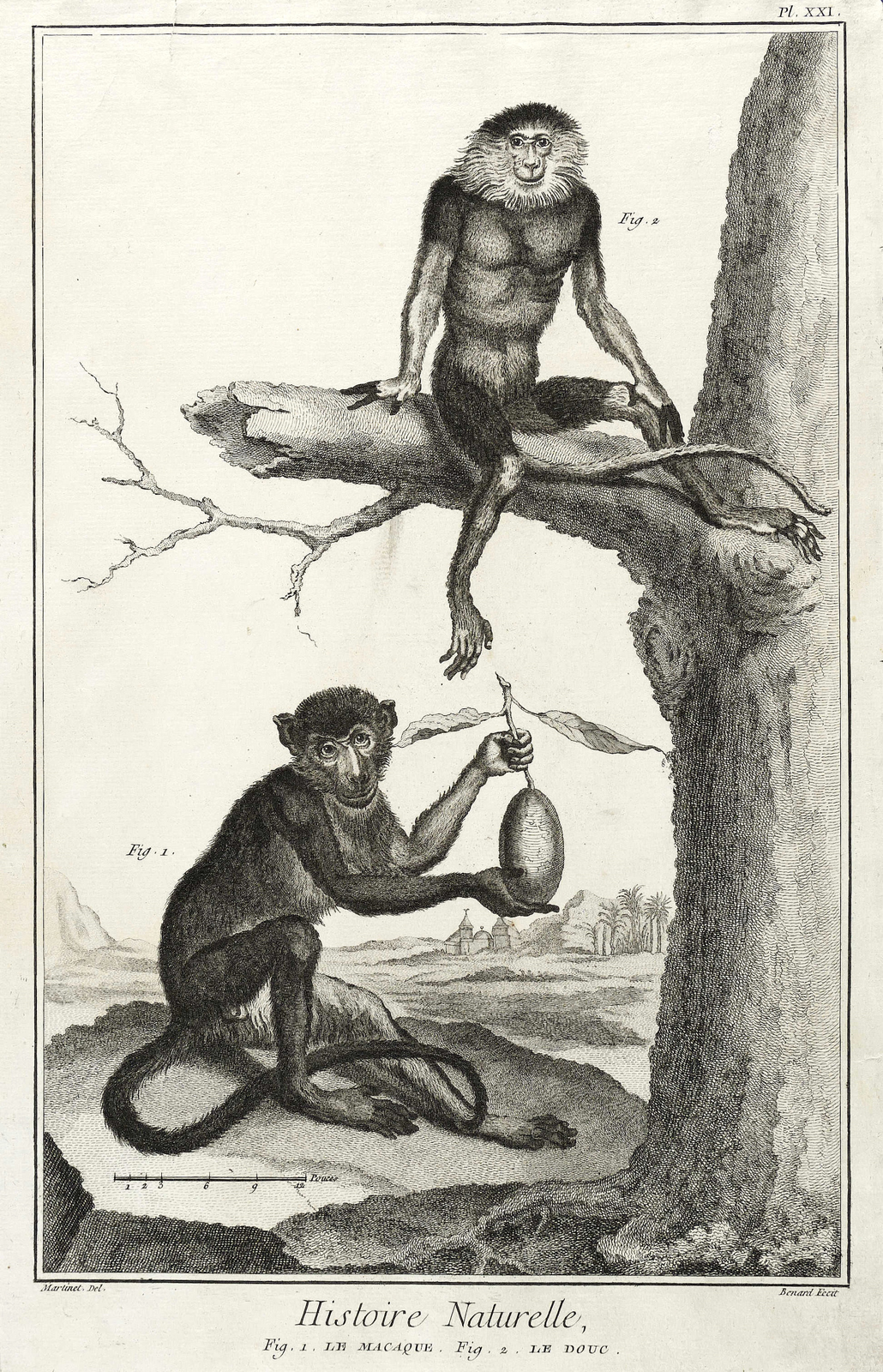 Aus: Denis Diderot & Jean le Rond D'Alembert, Encyclopédie. Recueil de Planches (Paris: Briasson 1768), Bd. 5. – In der Platte rechts unten signiert: "Benard Fecit." Darunter mittig Titel und Legende: "Histoire Naturelle, / Fig. 1. LE MACAQUE. Fig. 2. LE DOUC." – Papier leicht angeschmutzt und etwas berieben. Noch guter Gesamtzustand.