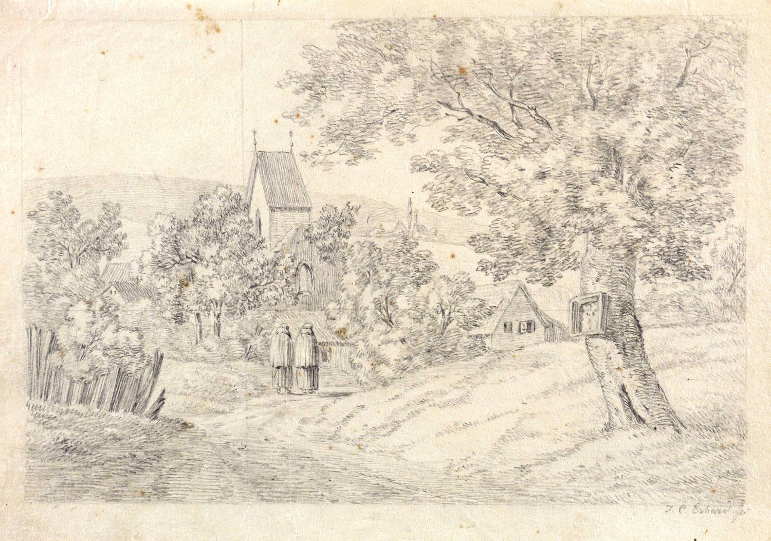 1815-1818. Zeichnung / Bleistiftzeichnung, auf feinstem hellgelbem Whatman. – Originale Künstlergrafik, von Johann Christoph Erhard. – Unikat. – 14,0 x 20,5 cm (Blatt), 12,2 x 18,1 cm (Darstellung).