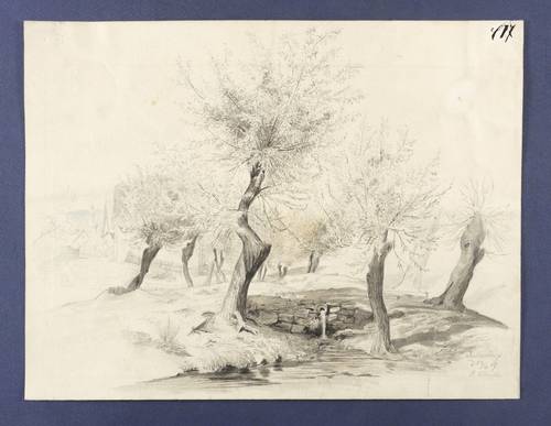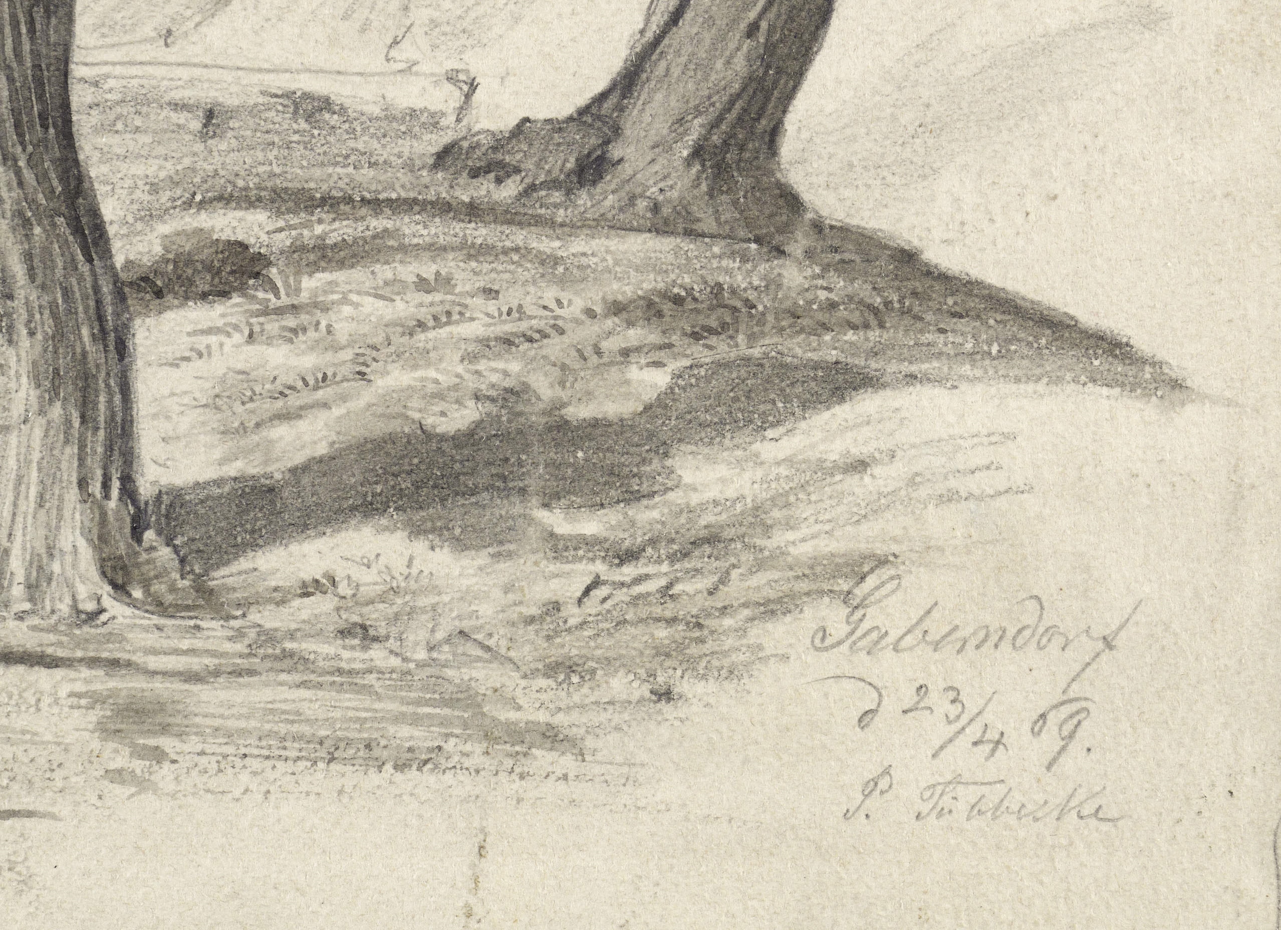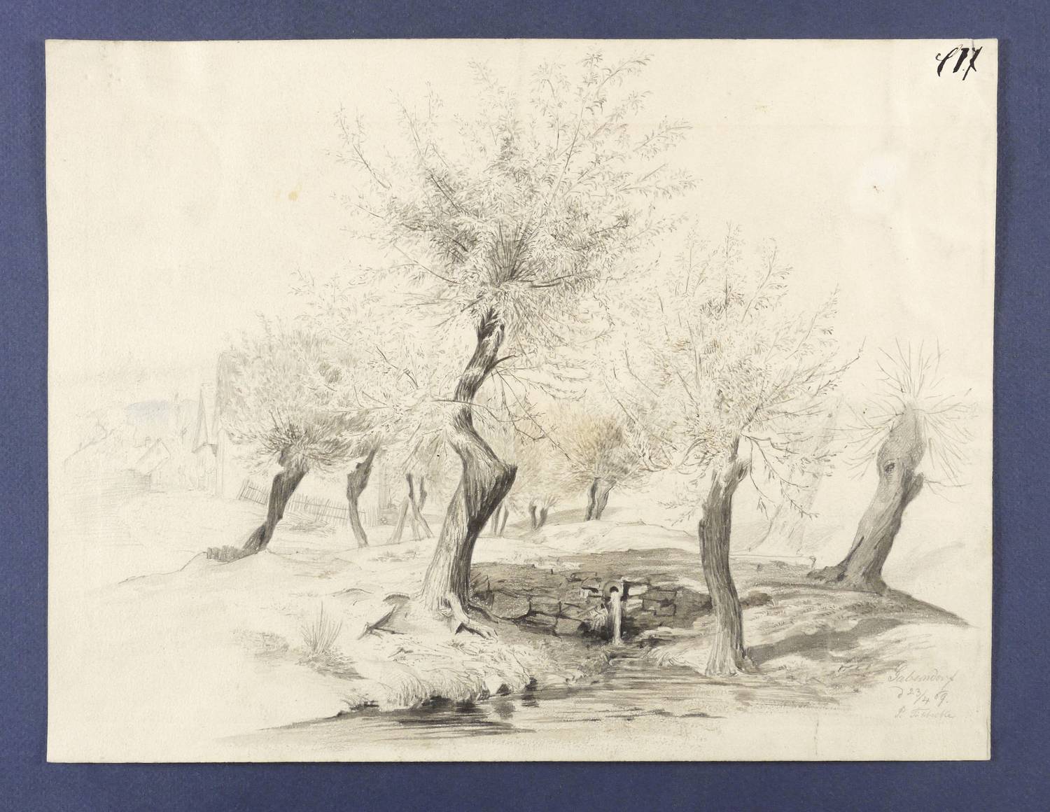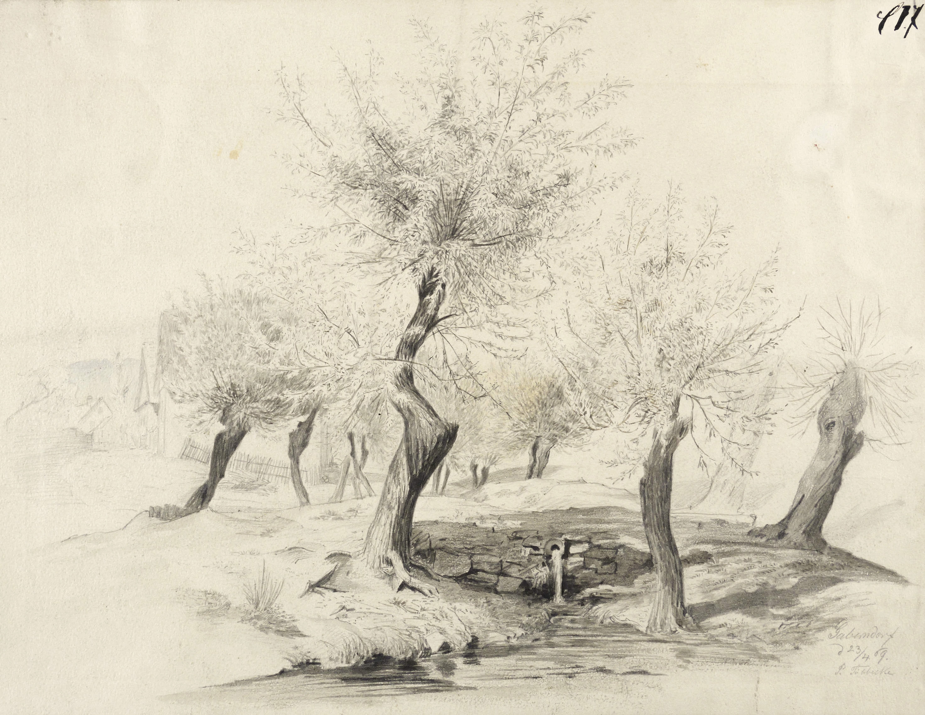 In Bleistift rechts unten signiert: ″P. Tübbecke″. Darüber eigenhändig bezeichnet und datiert: ″Gaberndorf d. 23/4 69.″ In der rechten oberen Blattecke in schwarzer Feder nummmeriert: ″C17″. – Weidenbäume an einem Bachlauf in Ortsrandlage von Gaberndorf bei Weimar. – Oberflächlich etwas angeschmutzt und knickspurig, Papier rückseitig mit Resten einer älteren Klebemontierung. Insgesamt mäßig guter Zustand.
