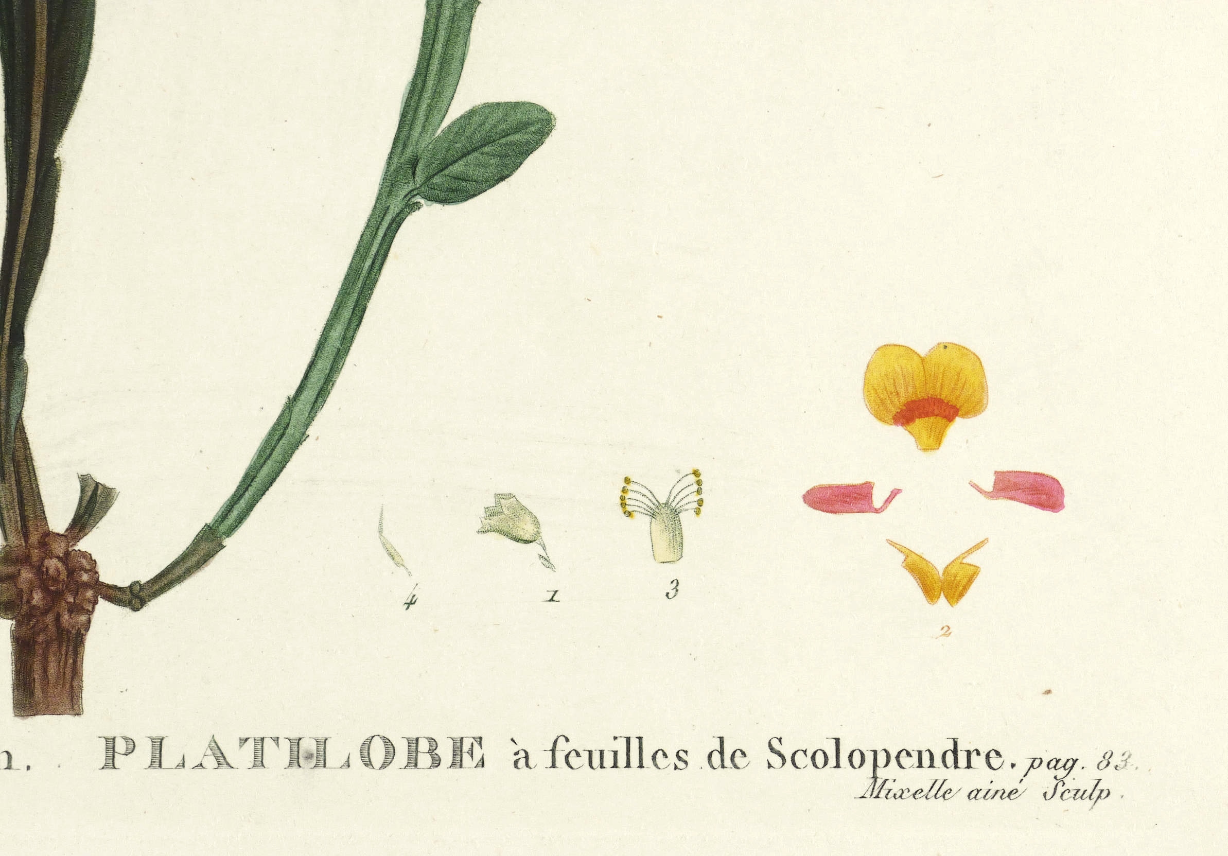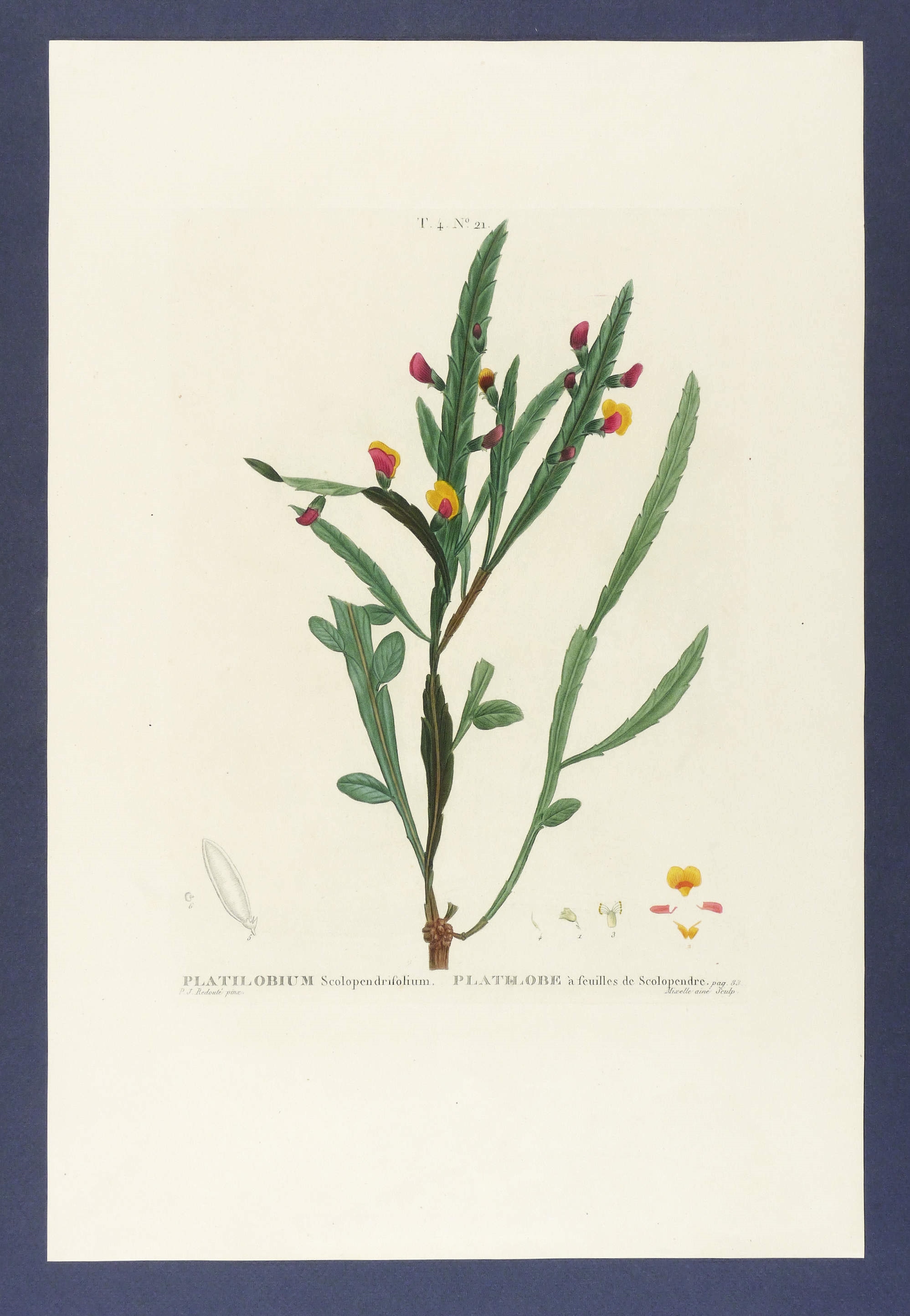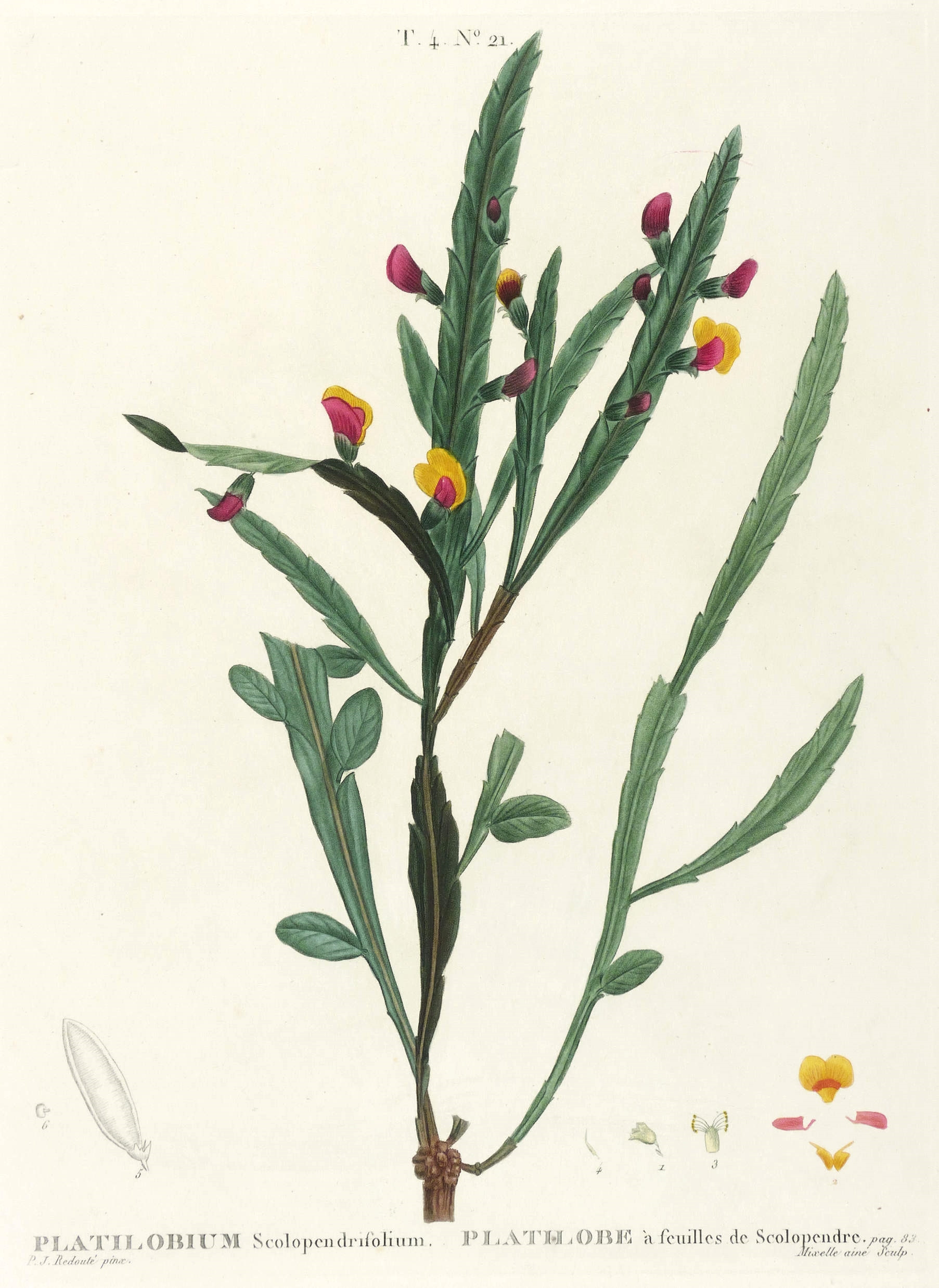 Gehölze. – Hirschzungenblättrige Blattschote. – Redouté. – „Platilobium scolopendrifolium. Platilobe à feulles de Scolopendre”.