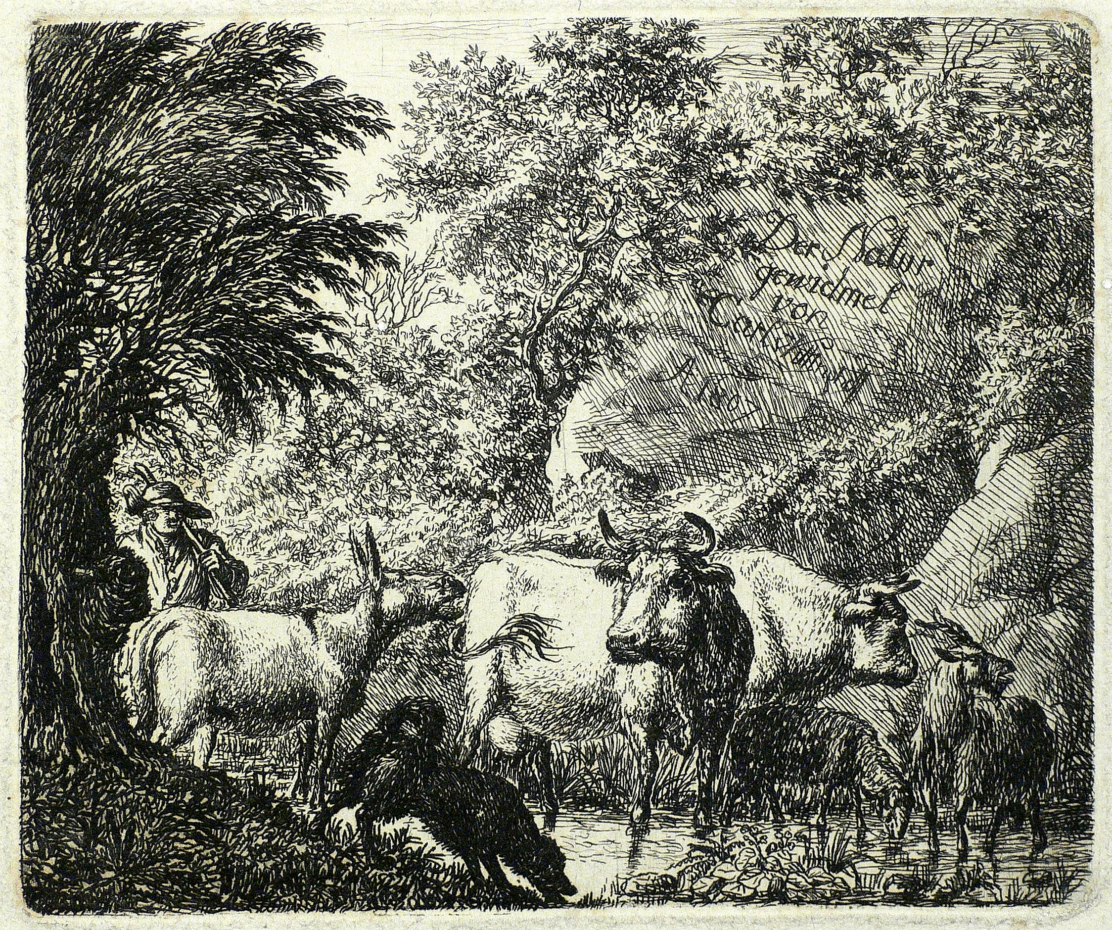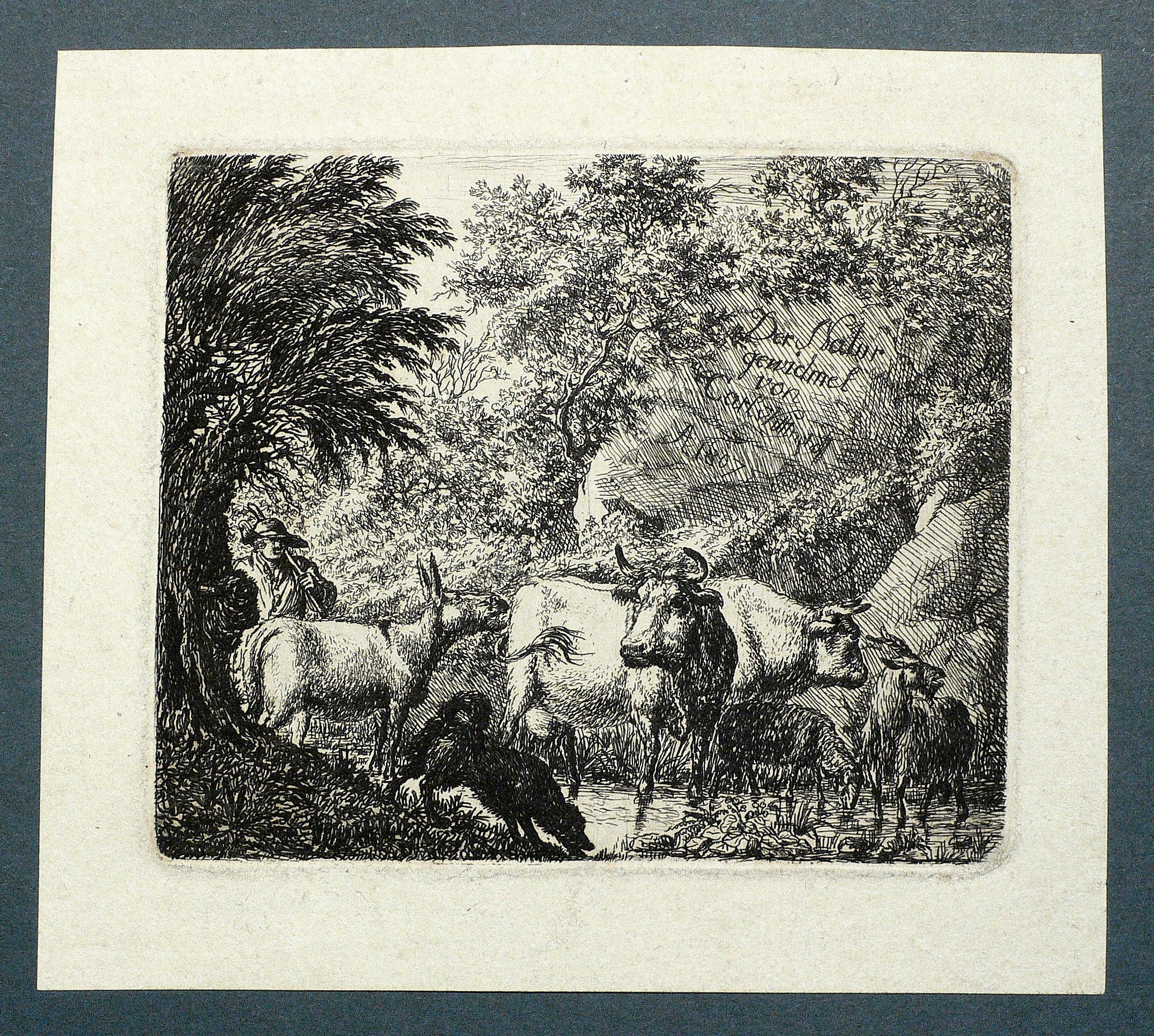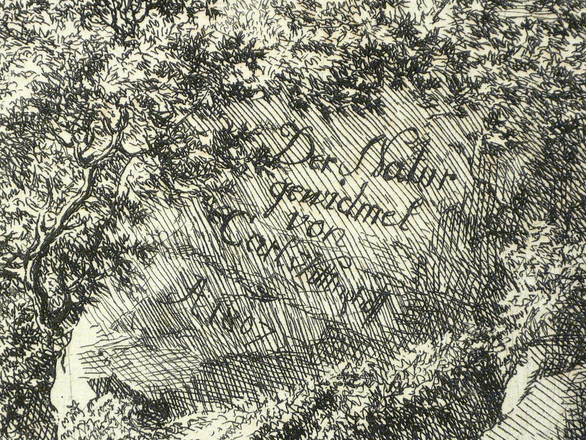 Im Felsen die Inschrift: ″Der Natur gewidmet von Carl v. Vittinghoff A. 1807″. Verso Sammlerstempel mit den Initialen EK im Kreis. – Titelblatt einer Folge von 27 Radierungen auf 11 Blättern. – Blatt verso mit Resten vormaliger Montierung. Sonst dem Alter entsprechend sehr guter Zustand.