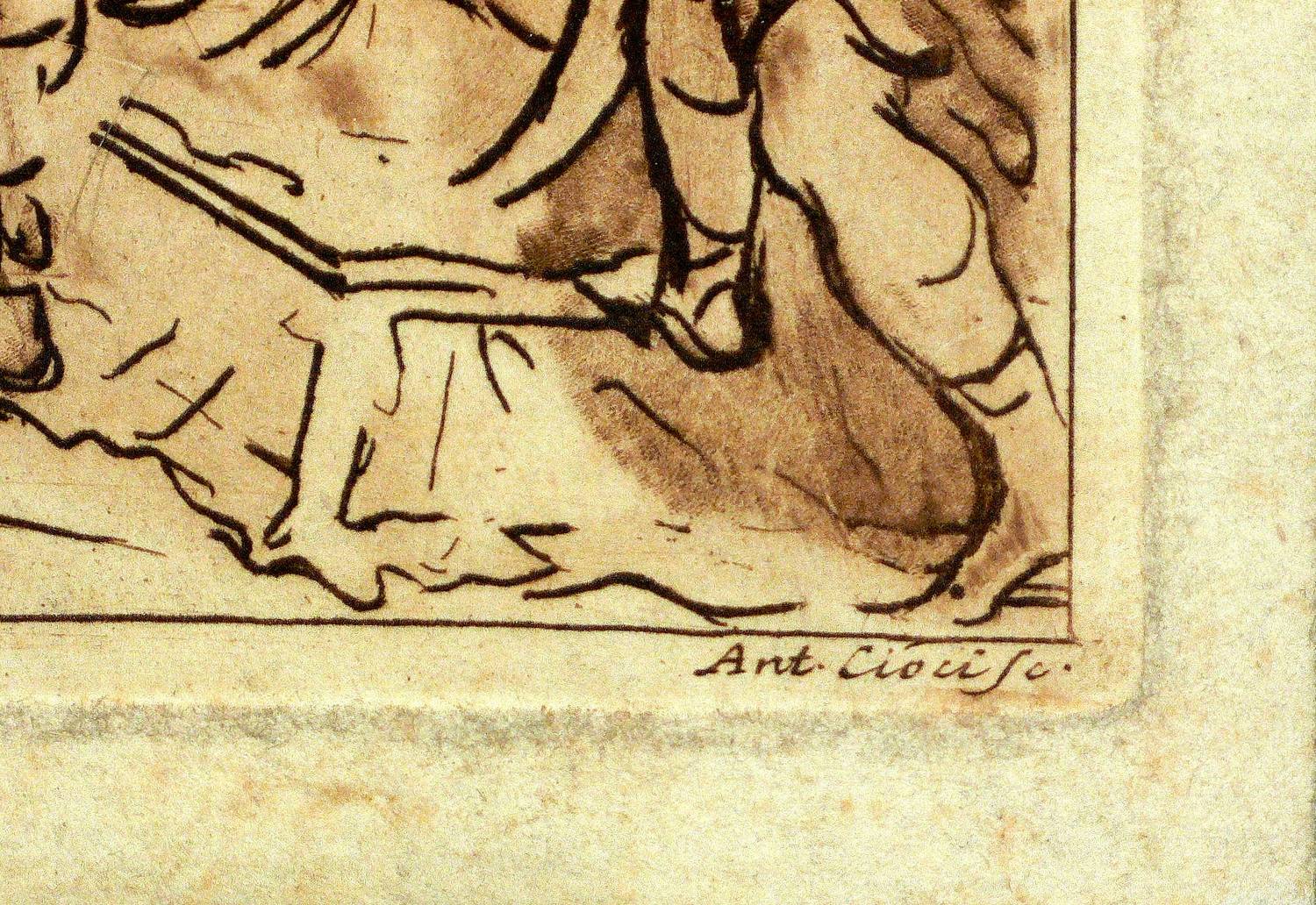 1762. Radierung / Strichätzung & Aquatinta, in Braun, auf gelblichem Bütten. – Originale Künstlergrafik, von Antonio Ciocchi. – 10,6 x 13,8 cm (Darstellung / Einfassungslinie), 11,4 x 14,5 cm (Platte), 13 x 17 cm (Blatt).