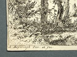 Bartsch 4. Hollstein 4. – In der Platte links unten signiert: ″A. Meyeringh Inv. et fec.″ Unleserliches Wasserzeichen, etwa: ″DGEORGE″. – In der Platte beschnitten. Mit schmalem Rändchen um Darstellung und Schrift. Kleiner Einriss in der rechten unteren Ecke alt hinterlegt. Mäßig guter Erhaltungszustand.