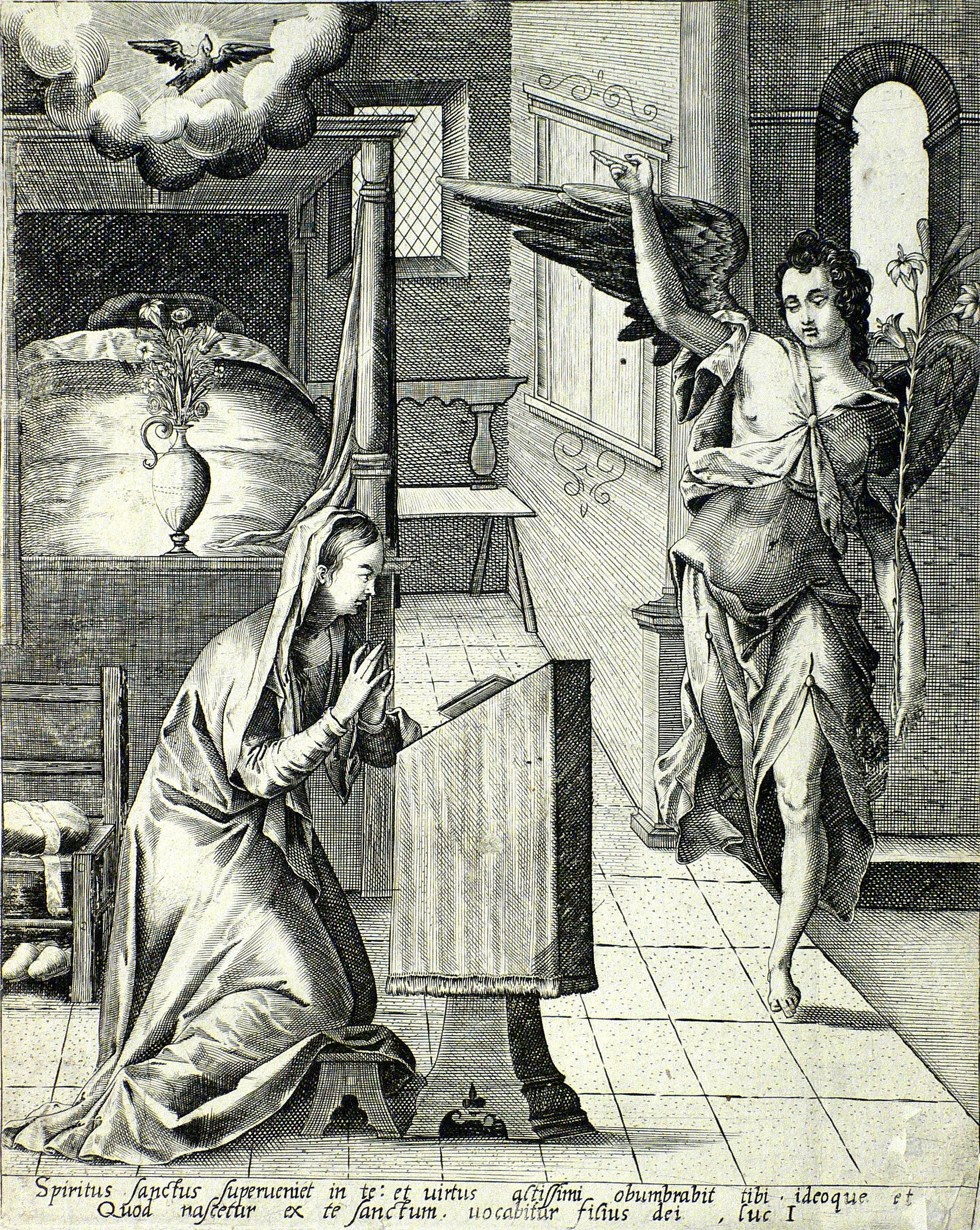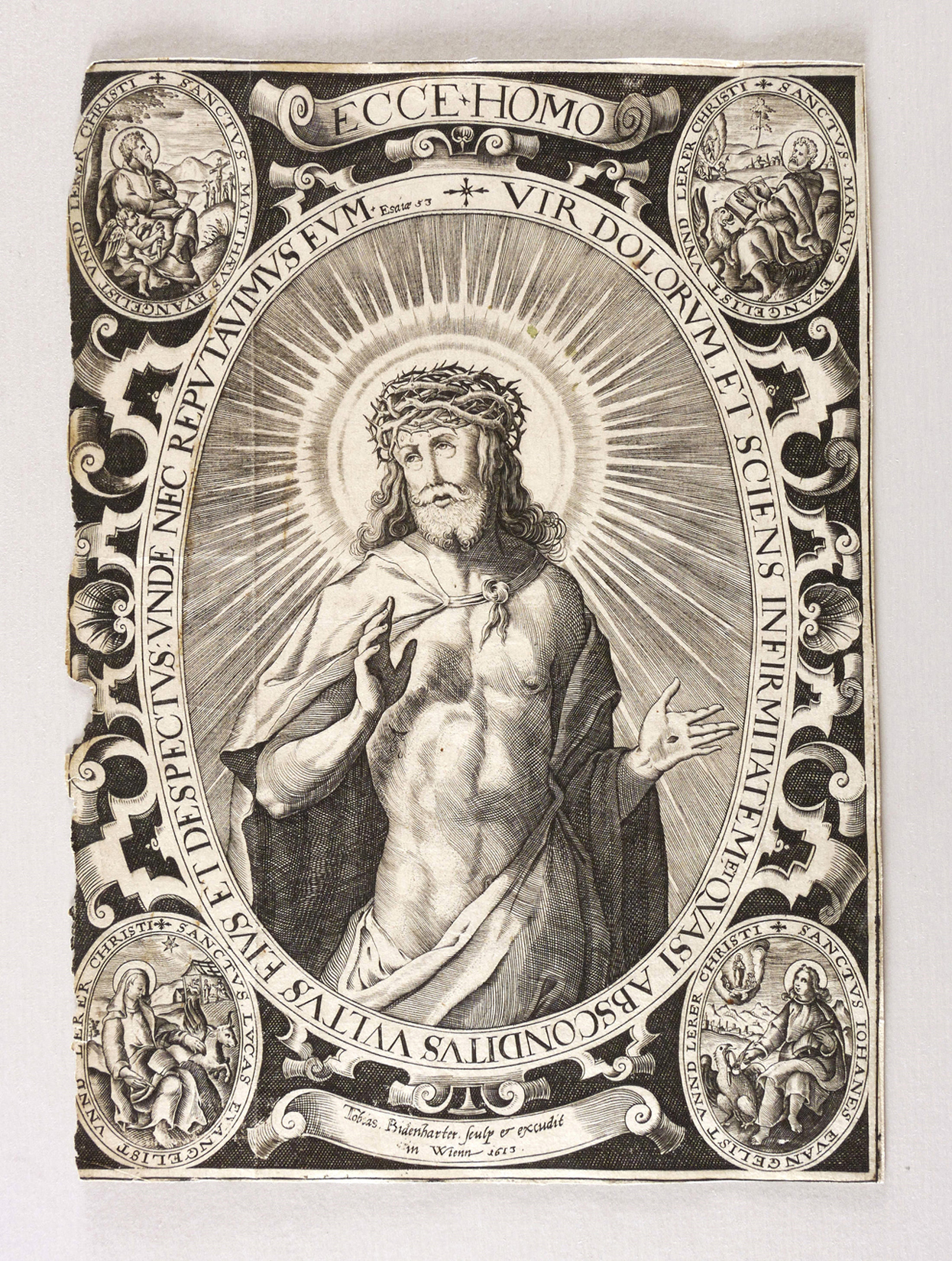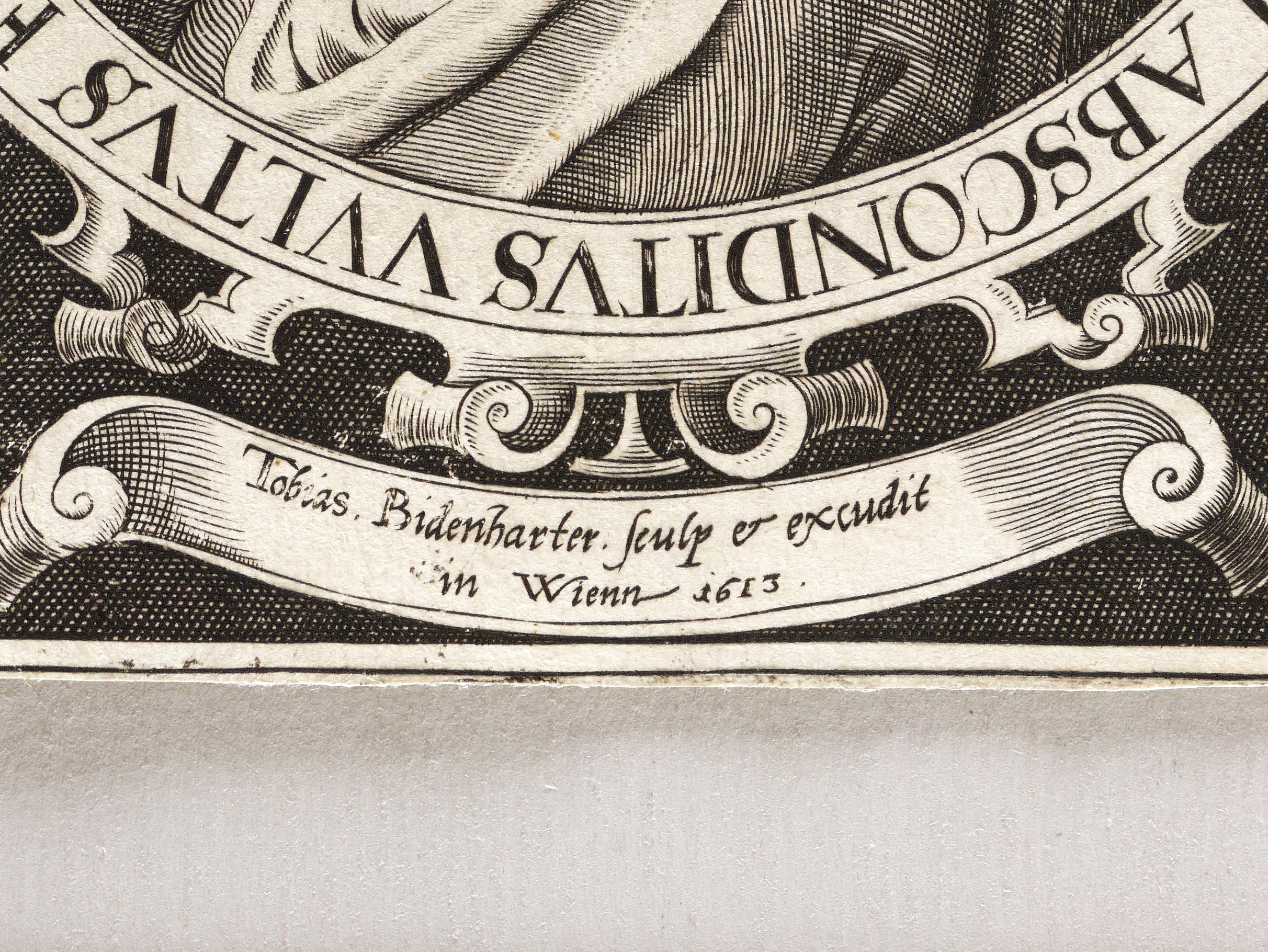 Unten signiert und datiert: ″Tobias. Bidenharter. sculp et excudit in Wien 1613.″ – Blatt bis an die Einfassungslinie beschnitten und auf Trägerblatt, eine alte Grafik mit einer Verkündigungsszene, aufgezogen. Diese ist teils mit einem Einriss wieder abgelöst. Fehlstelle durch Insektenfraß über den ganzen linken Rand, mit Verlust in der Darstellung. Mangelhafter Zustand.