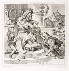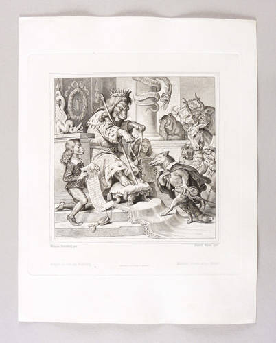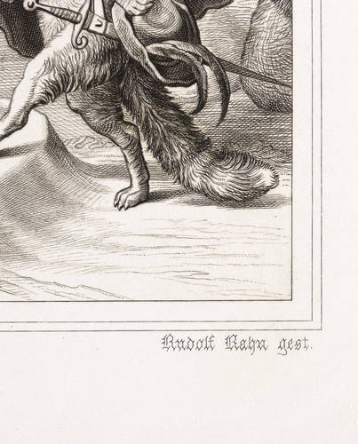 Aus: Johann Wolfgang von Goethe, Reineke Fuchs (Stuttgart und Tübingen: Cotta'scher Verlag 1846). – Rechts unten signiert: ″Rudolf Rahn gest.″ Darunter die Adressen des Verlegers und des Druckers. – Obere rechte Ecke leicht bestoßen. Sonst guter Zustand.
