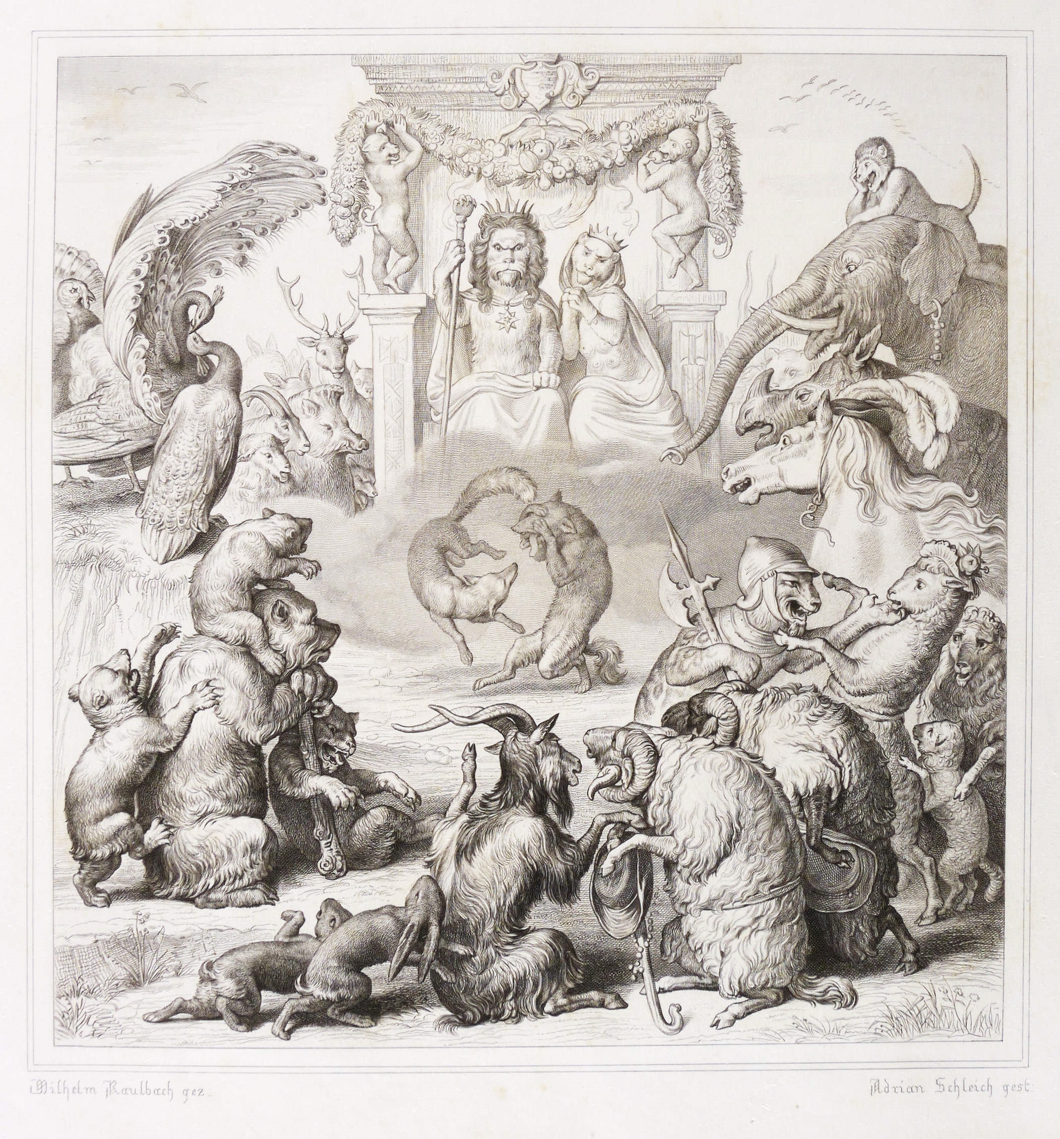 Aus: Johann Wolfgang von Goethe, Reineke Fuchs (Stuttgart und Tübingen: Cotta'scher Verlag 1846). – Rechts unten signiert: ″Adrian Schleich gest.″ Darunter Adressen des Verlegers und des Druckers. – Guter Zustand.