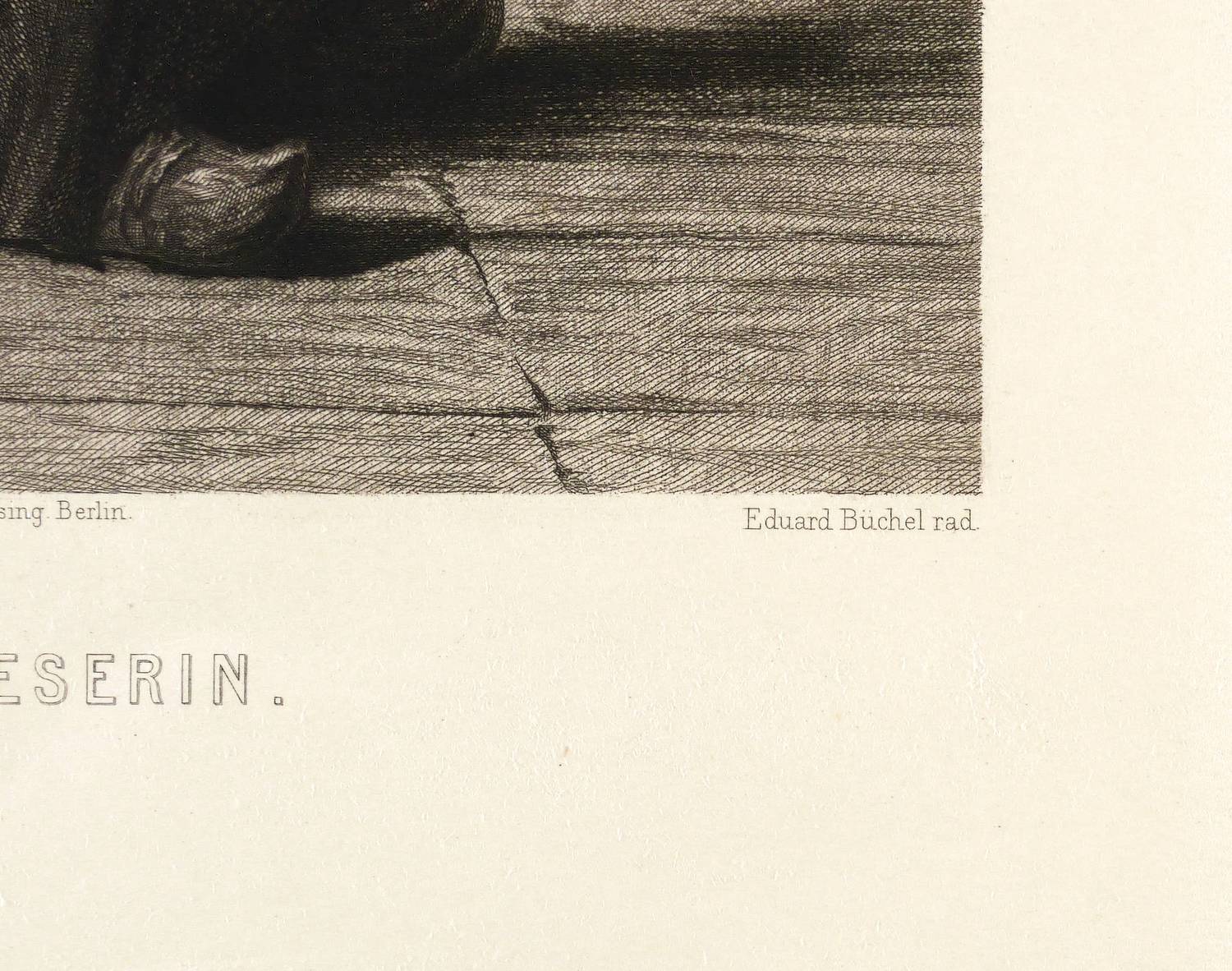 Eduard Büchel (1835 Eisenberg - 1903 Dresden). Eigentlich Carl Eduard Büchel. Deutscher Kupferstecher und Radierer. Lernte er bei seinem Vater, der Gürtler-, Bronze- und Neusilberarbeiten herstellte. Ab 1851 Studium an der Akademie der Künste Dresden. Ab 1854 Schüler des Kupferstechers Moritz Steinla. Seit 1856 zunehmend Farb- und Brillantstich. 1858 erbt er den künstlerischen Nachlass von Steinla. 1866 Lob vom Rat der Akademie der bildenden Künste für die "Madonna mit der ein Opfer bringenden Venetianerin". 1877 Studienreise nach Italien. 1881 Ernennung zum Ehrenmitglied der Akademie der Bildenden Künste. 1900 Ernennung zum Professor durch den König.
